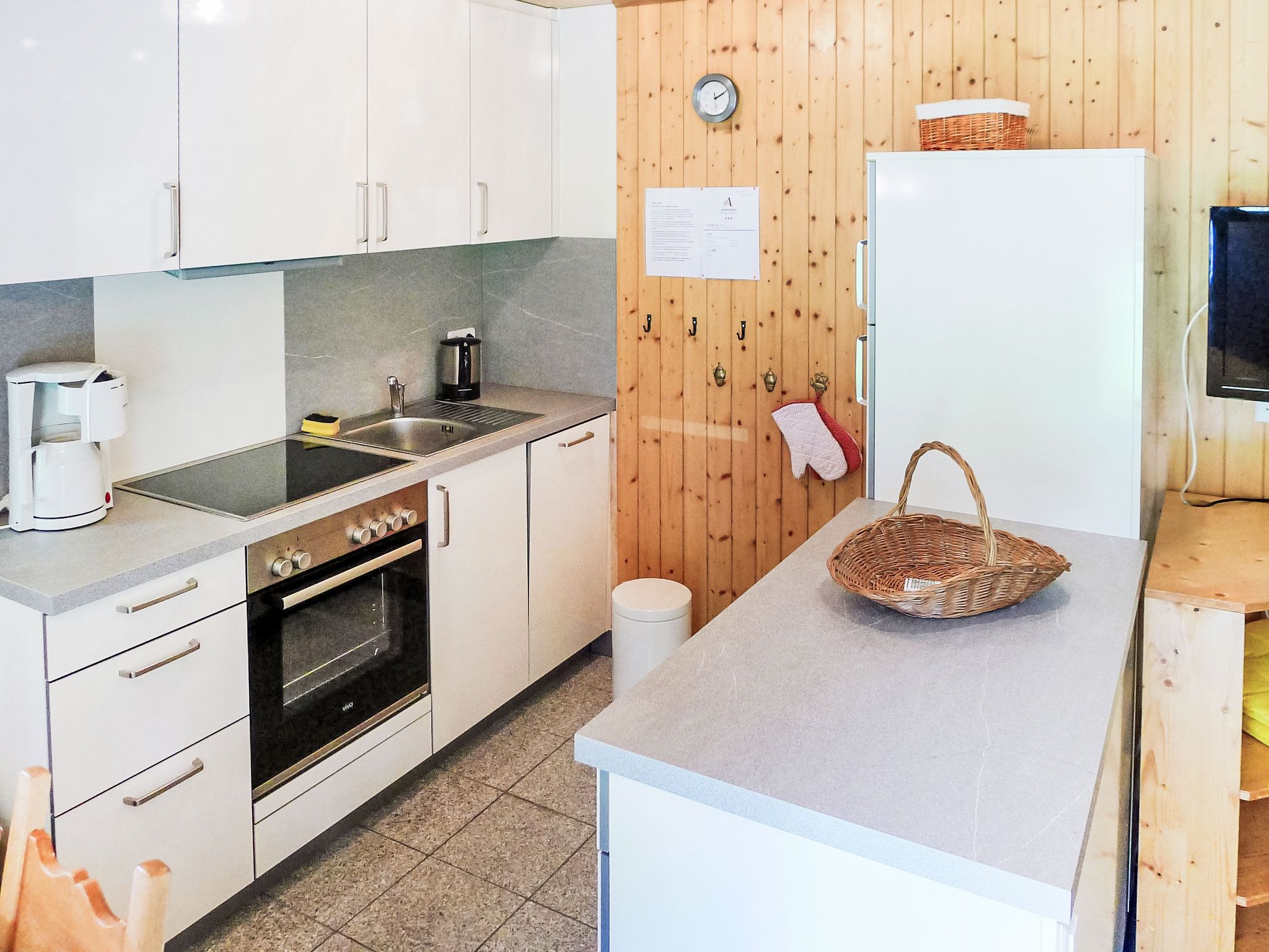 4-Zimmer-Chalet 75 m2. Zweckmässig und gemütlich eingerichtet: Wohn-/Esszimmer mit Bad/WC, Waschbecken und Kabel-TV (Flachbildschirm), Radio und DVD. Ausgang zur Terrasse. Offene Küche (Backofen, Geschirrspüler, 4 Glaskeramikplatten, Toaster, Fondue Set (Käse)). Sep. WC. Obergeschoss: 2 Zimmer, jedes Zimmer mit 1 Doppelbett. Ausgang zum Balkon, Richtung Süden und Richtung Osten. 1 Zimmer mit 1 x 2 Etagenbetten. Dusche/WC. Balkon 15 m2, Terrasse 12 m2. Terrassenmöbel, Gartengrill, Liegestühle (4). Schöne Sicht auf die Berge. Zur Verfügung: Waschmaschine, Babybett bis 2 Jahre. Internet (Wireless LAN, gratis). Parkplatz. Bitte beachten: Nichtraucher-Unterkunft. keine Haustiere erlaubt.