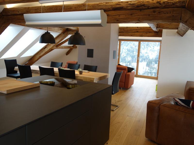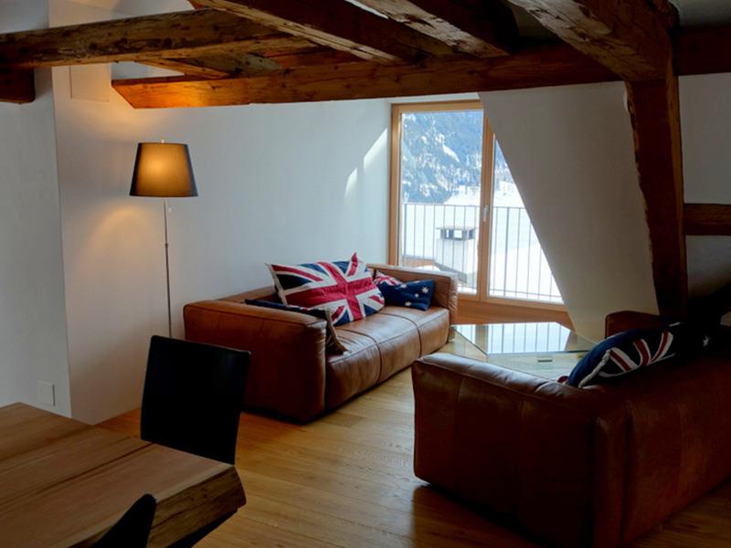 5.5 Zimmerwohnung ca. 160 m2 in Mehrfamilienhaus. Die Wohnung befindet sich auf 2 Stockwerken, im 3. OG und im Dachgeschoss. 2 Schlafzimmer mit je 1 Doppelbett. 2 Schlafzimmer mit je 2 Einzelbetten, insgesammt 8 Betten. Bett-, Küchen- und Badewäsche vorhanden. Wohnküche mit Backofen, Kühlschrank, Geschirrspülmaschine, Induktionsherd, Steamer, Toaster, Wasserkocher und Kaffeemaschine (Nespresso), Mixer. Racletteofen und Fondue Caquelon. Bad/ WC. Dusche/ WC, Haartrockner. Nichtraucherwohnung. TV und Radio. Balkon, Garten. Parkplatz (ca. 100 m vom Haus entfernt). Waschmaschine und Wäschetrockner im Haus. WLAN/Internet. Ski- und Abstellraum. Haustiere auf Anfrage, CHF 10.-/Nacht. Die Kosten sind vor Ort zu begleichen.