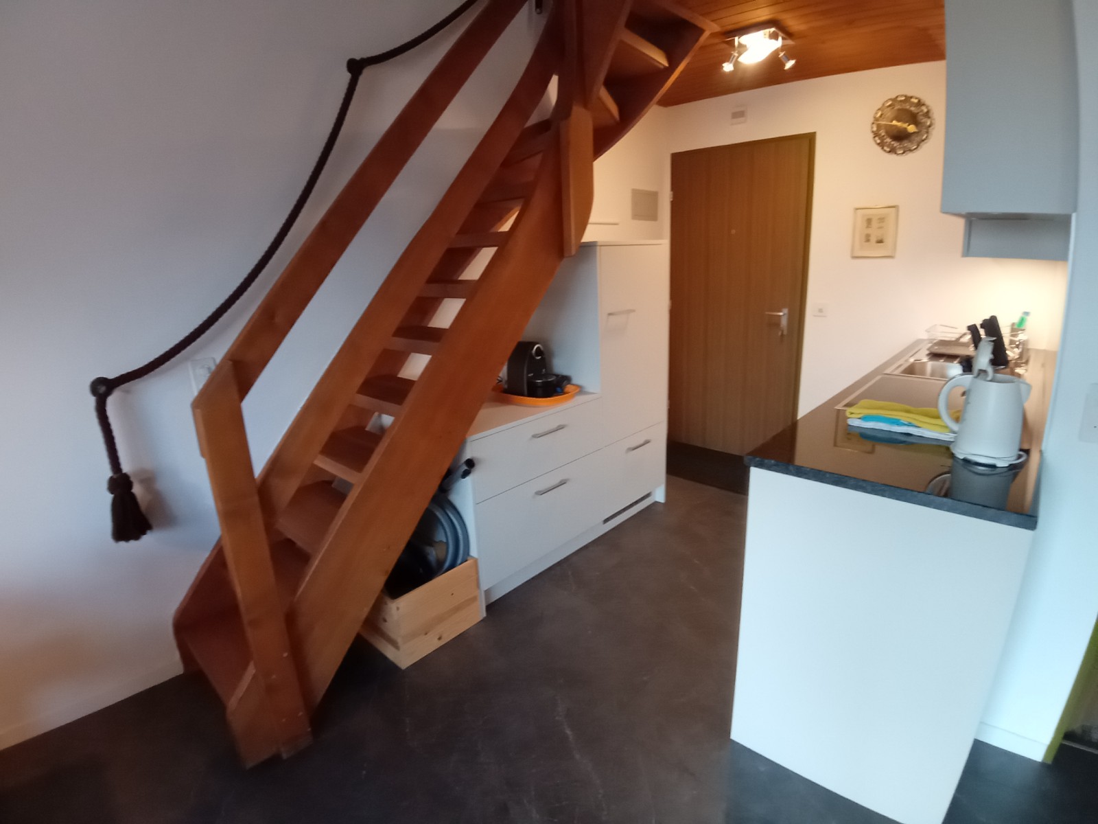 Modernen Küche: GK-Kochfeld, Backofen, Kühlschrank, Stabmixer, Wasserkocher, Toaster, Delizio Kapsel (Gratis) Kaffeemaschine, Fondue und Raclette-Set, Koch- und Bratpfannen, Tafelgeschirr und Besteck für 6 Personen.
