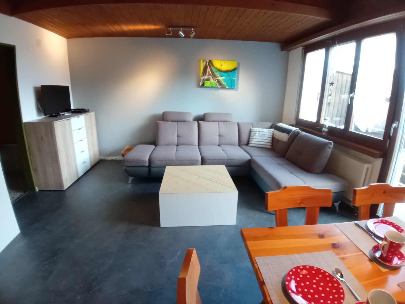 Ein offener Wohnraum mit Küche- / Essbereich. Im Wohnzimmer befindet sich ein Esstisch mit Eckbank und drei Stühlen, ein grosses Ecksofa, Club-Tisch, Flatscreen-TV, DVD-Player, Radio (DAB+), WLAN, Balkon mit Tisch und Stühlen (Ostausrichtung, Morgensonne).Küche: