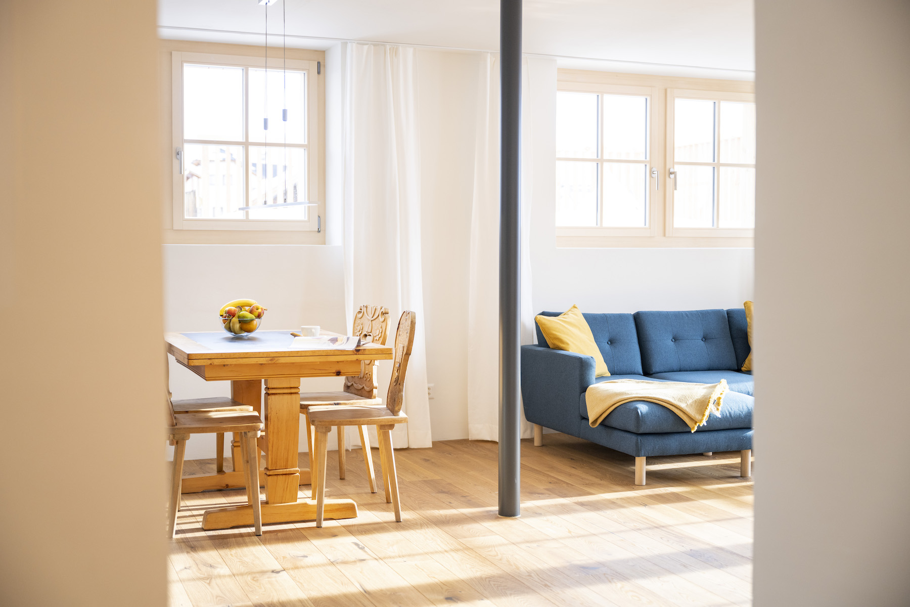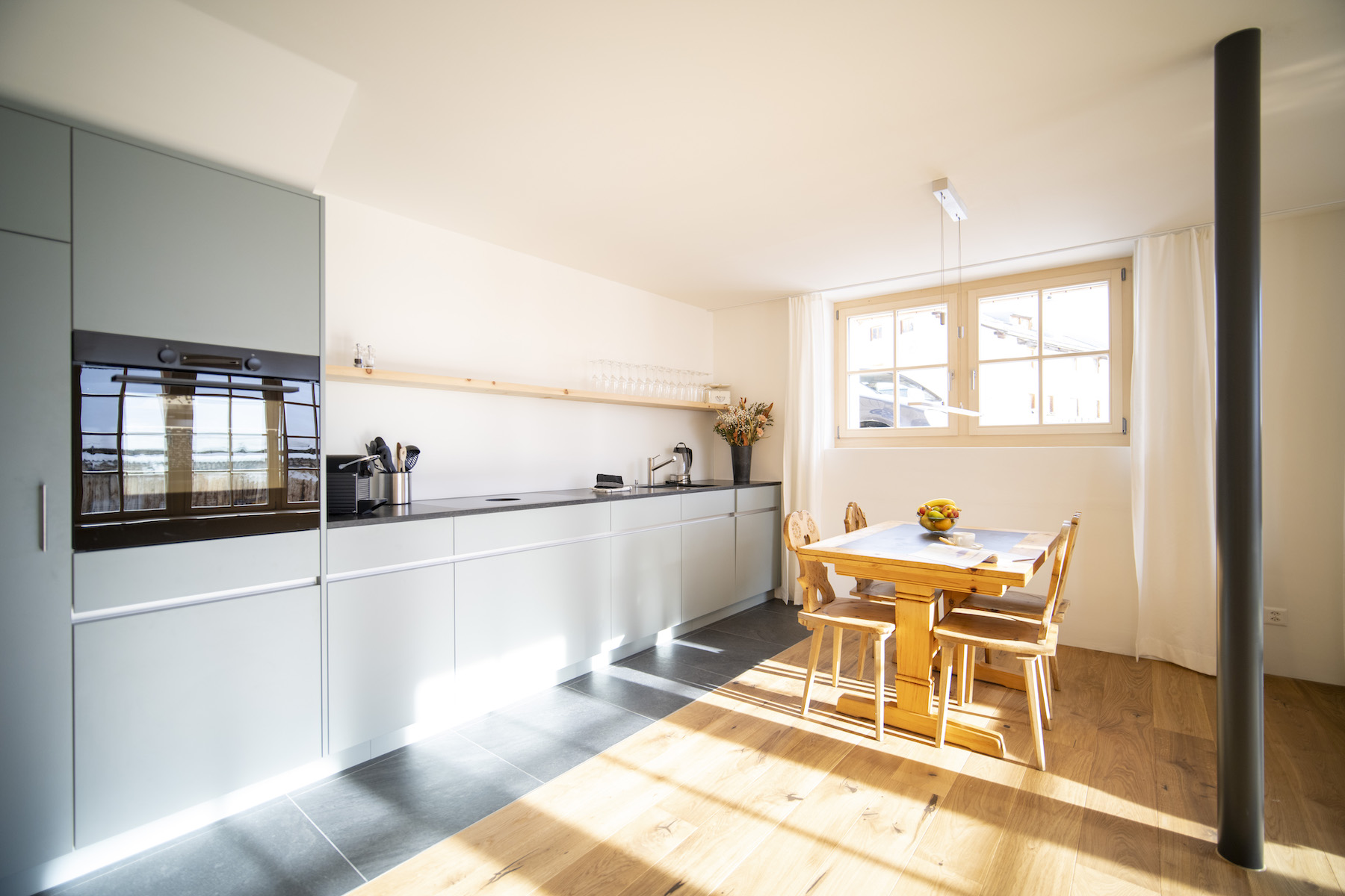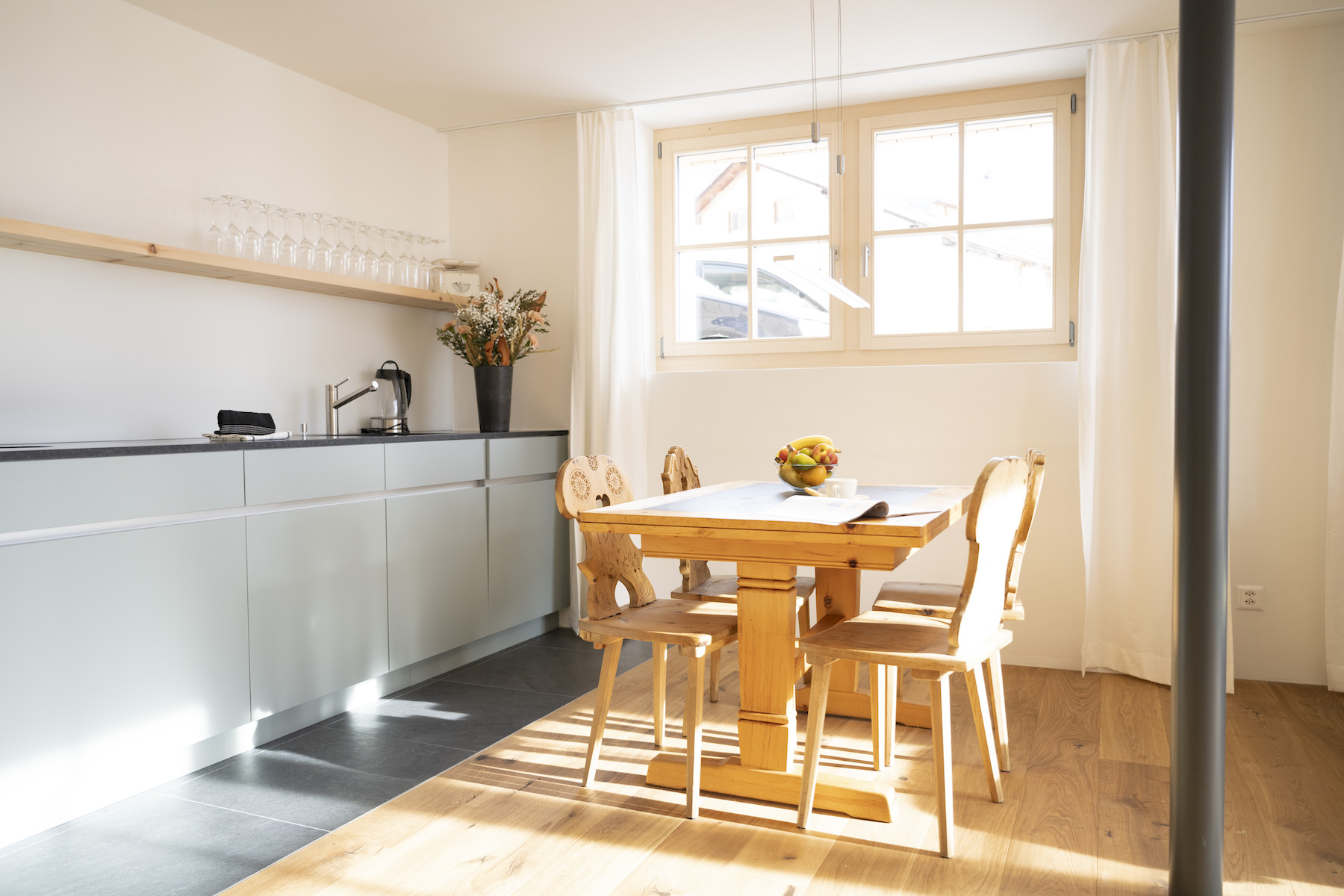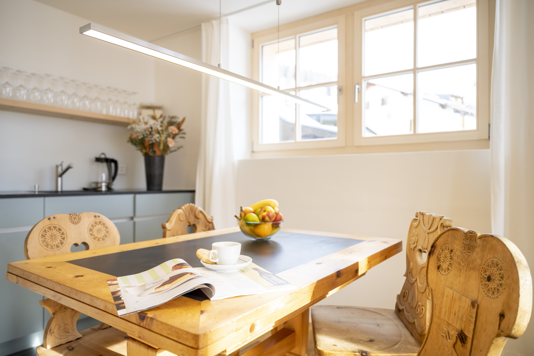 Die mit warmen Materialien und viel Holz ausgestattete Wohnung strahlt eine gemütliche Atmosphäre aus - so kann man die Ferien rundum geniessen! Die moderne Liegenschaft bietet hochwertigen Komfort und liegt an der Strasse Bügl suot, nicht weit vom Volg entfernt.