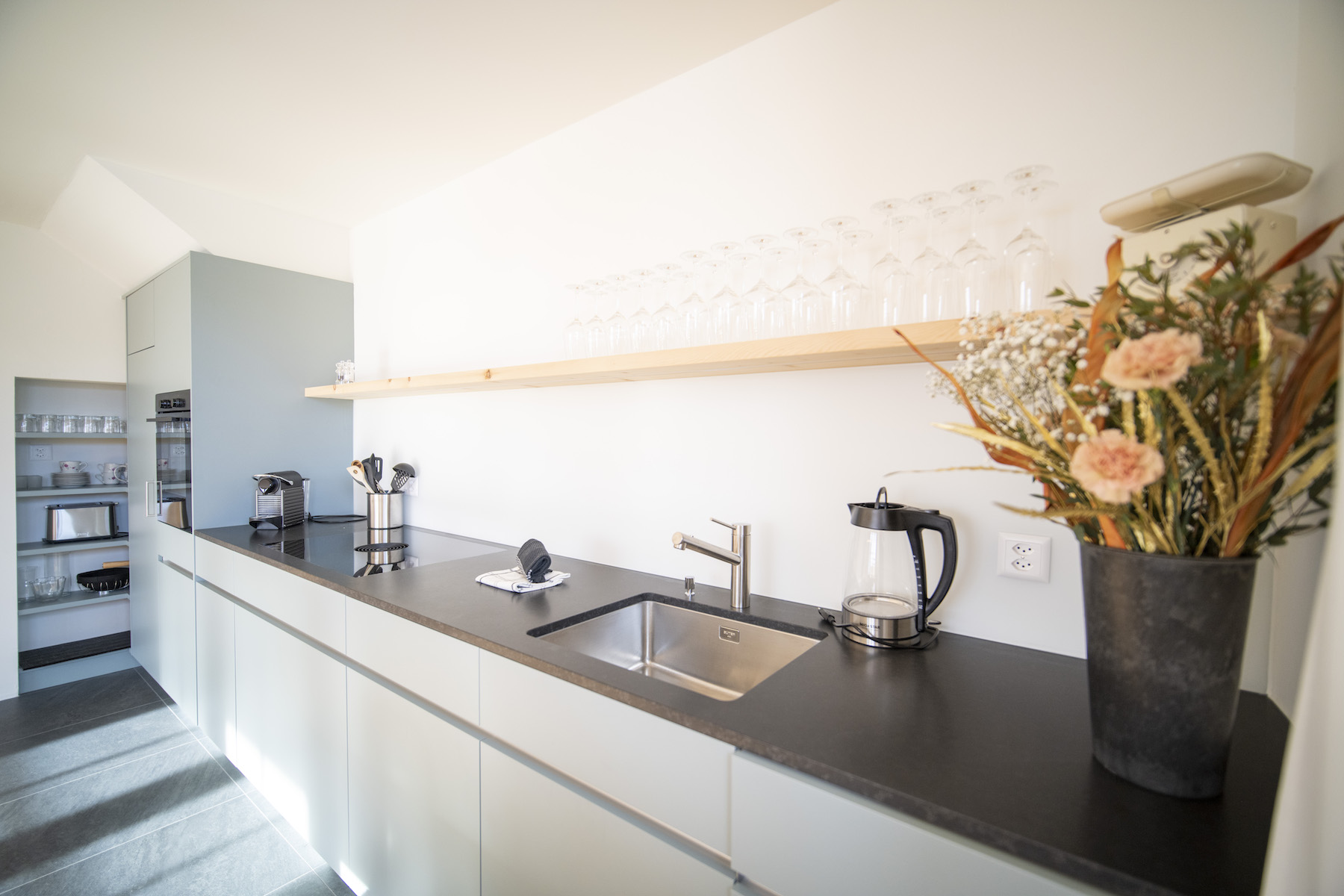 • Die Küche ist mit Geschirrspüler, Backofen, Induktionsherd, grossem Kühlschrank, Kaffeemaschine (Nespresso), Wasserkocher, Toaster, Fondueset und Raclette-Ofen ausgestattet