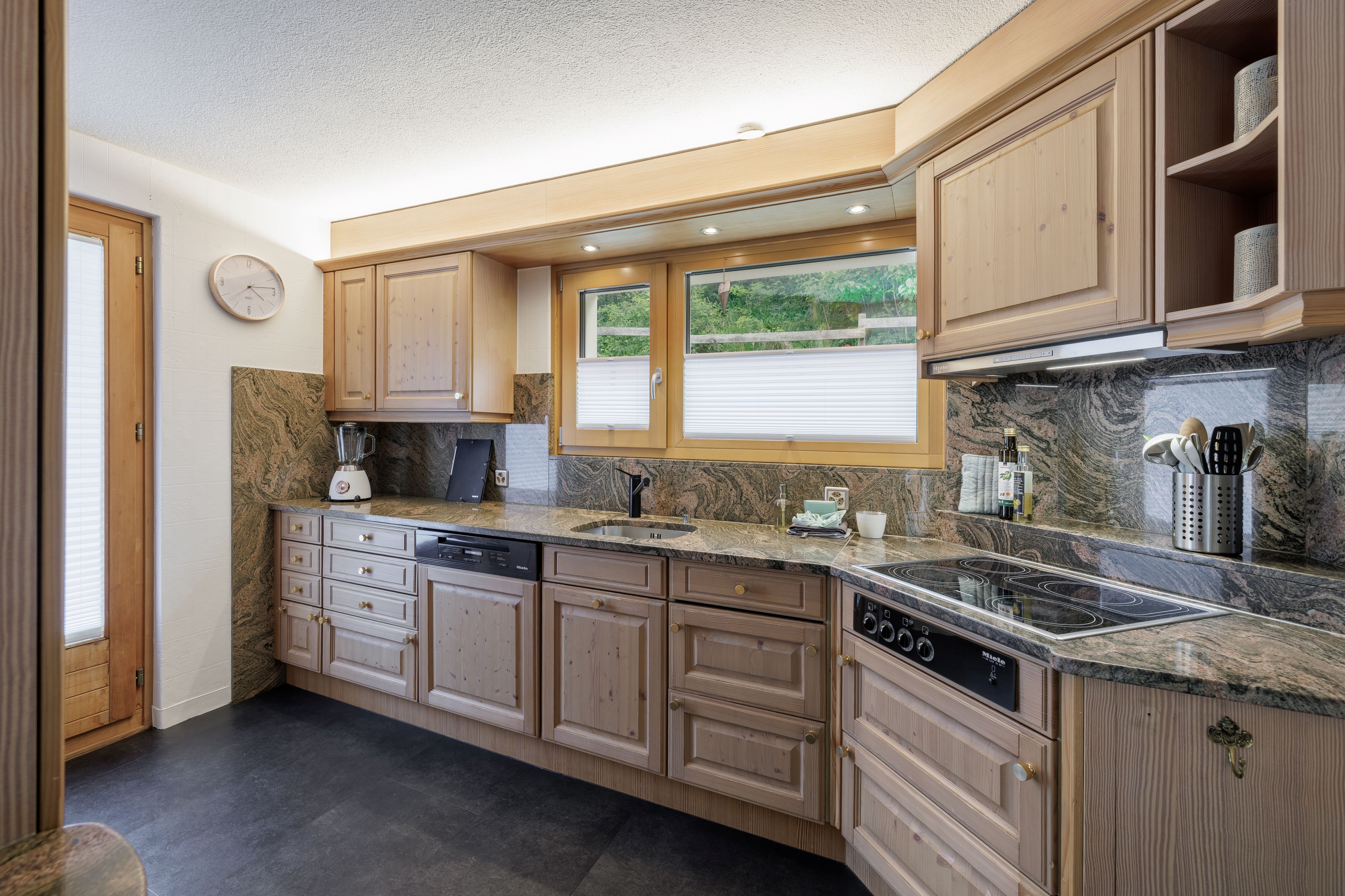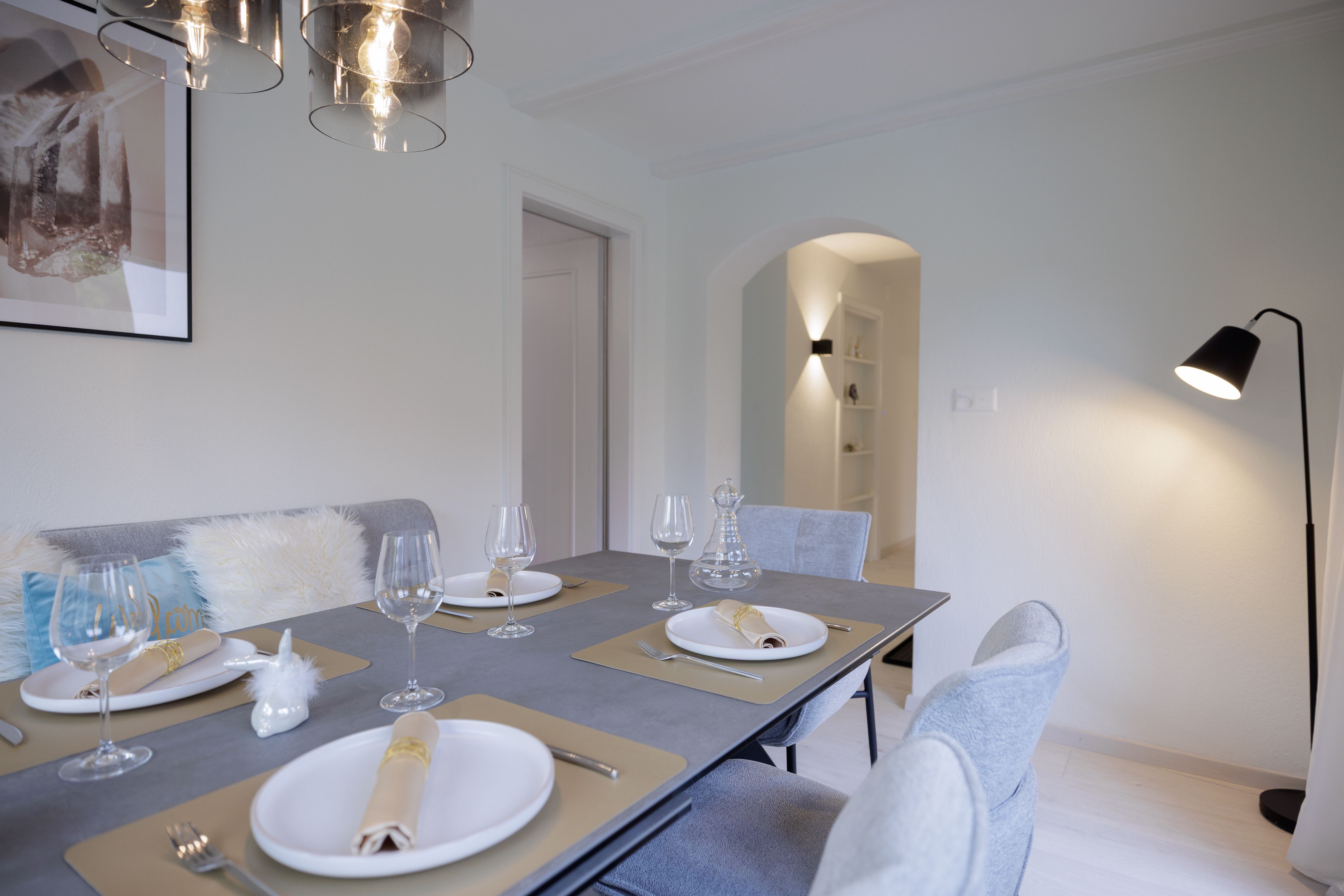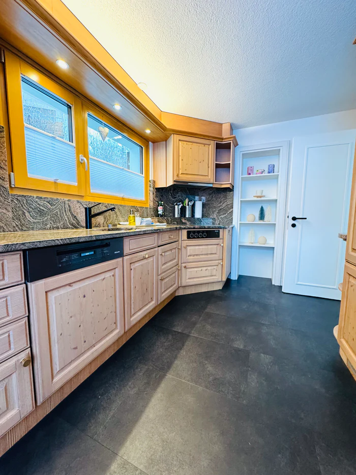 Küche und Esszimmer mit Willkommenspräsent, Kaffeemaschine inkl. Kaspeln für dein Anreisetag, Salz, Pfeffer, Paprika, Spülmittel, 2 Tabs für den Geschirspüler, 1 Kehrichtsack, Geschirrtücher