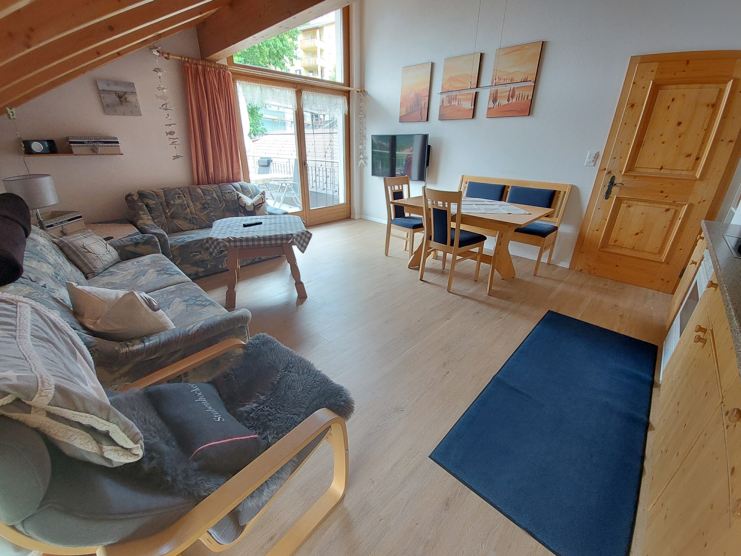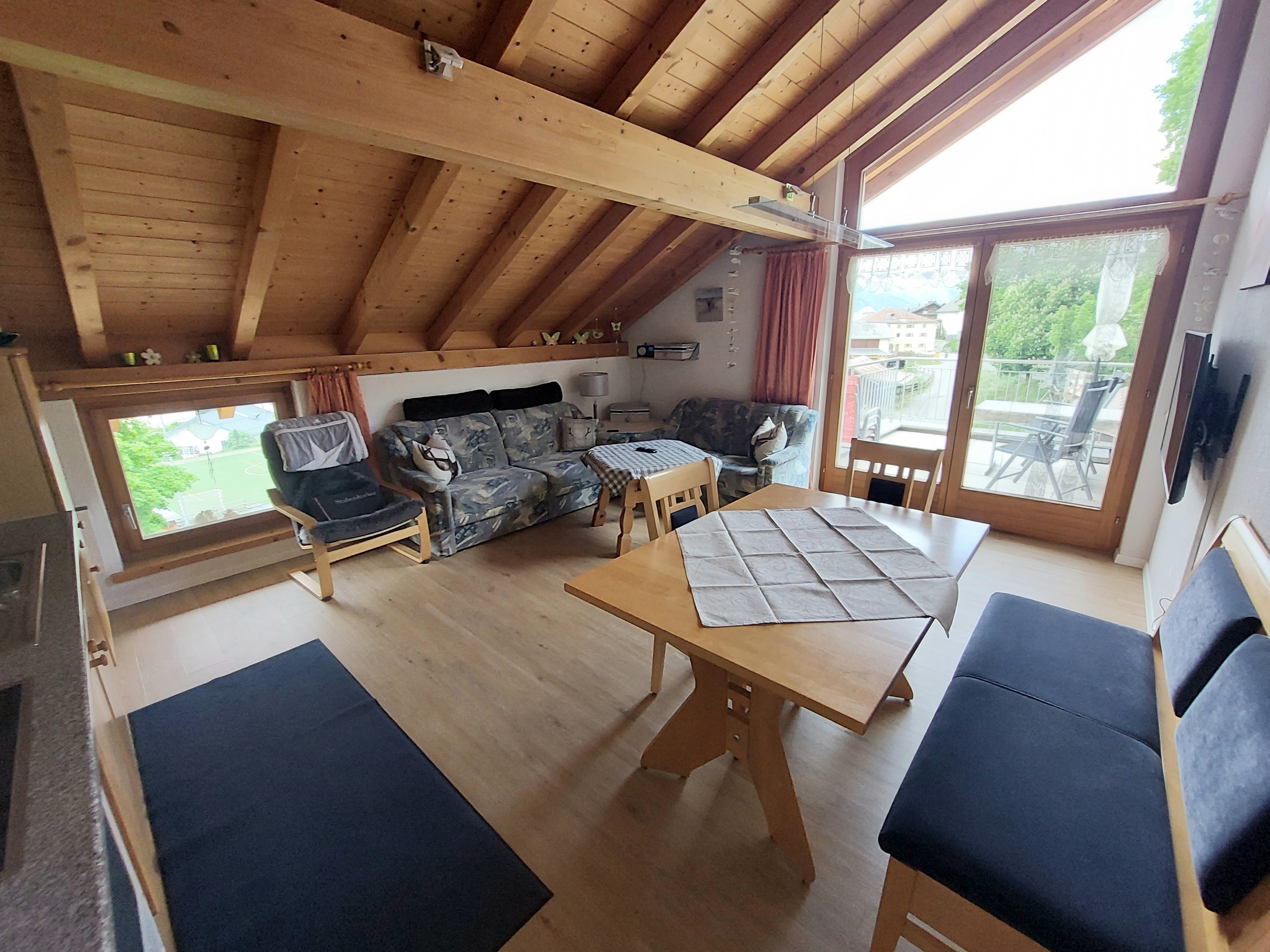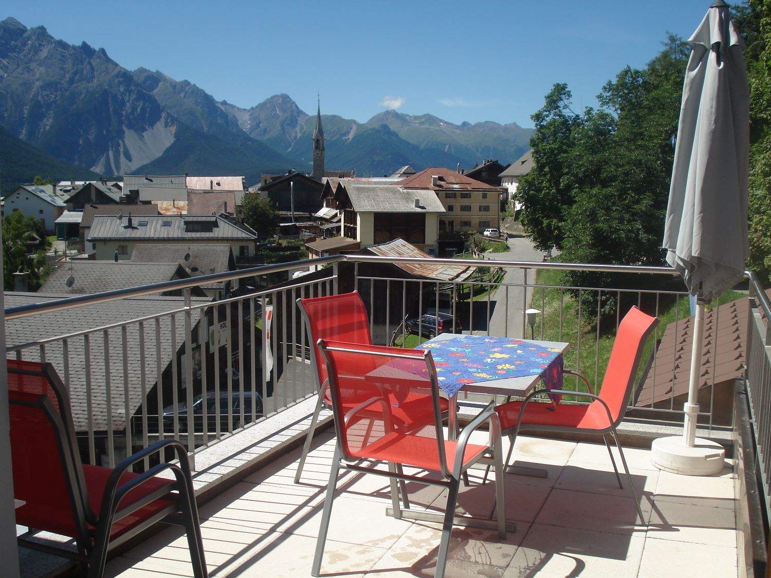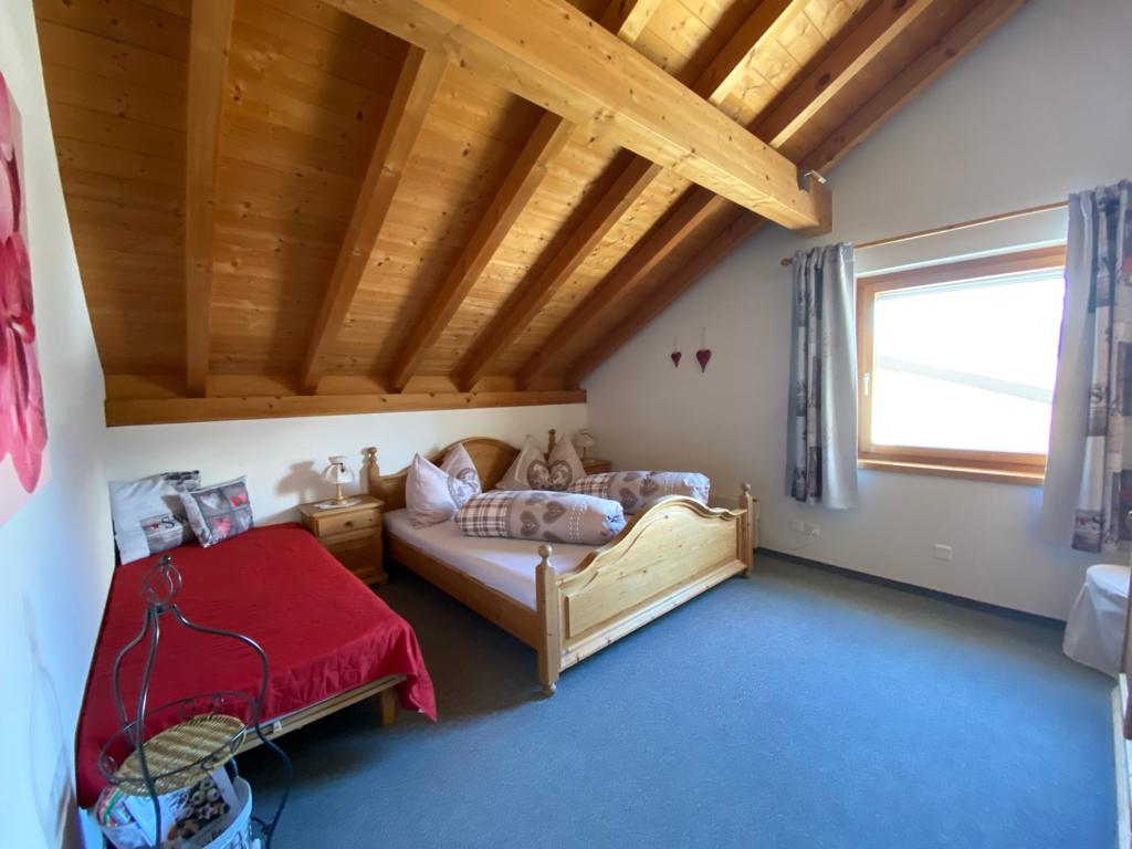 Komfortable und familienfreundliche **** 3 ½ Zimmerwohnung im Dachgeschoss an sonniger und ruhiger Lage mit herrlicher Aussicht. 5 Gehminuten vom Zentrum entfernt, direkt an der Skipiste, Ausgangspunkt für verschiedene Wanderungen. Die sichtbare Balkenlage verleiht eine romantische und überaus gemütliche Atmosphäre. Die Wohnung ist 77 m2 gross, hell, geräumig und mit jeglichem Komfort (gratis WLAN etc). Sehr sonniger Balkon (ausgestatte mit Gartenmöbel und Sonnenschirm) mit traumhafter Aussicht auf die Engadiner Bergwelt. Separate Garderobe, Nichtraucher-Wohnung, Parkplätze beim Haus, Spiel-, Sport- und Eisplatz befinden sich unterhalb des Hauses. FÜR UNSERE KLEINEN GÄSTE: Riesen-Trampolin (Durchmesser 4.20m) mit Sicherheitsnetz und Spielparadies im Heustall gleich neben dem Haus. Eigener Bio-Bauernhof mit Pferden, Ziegen, Schafe, Hühner etc.