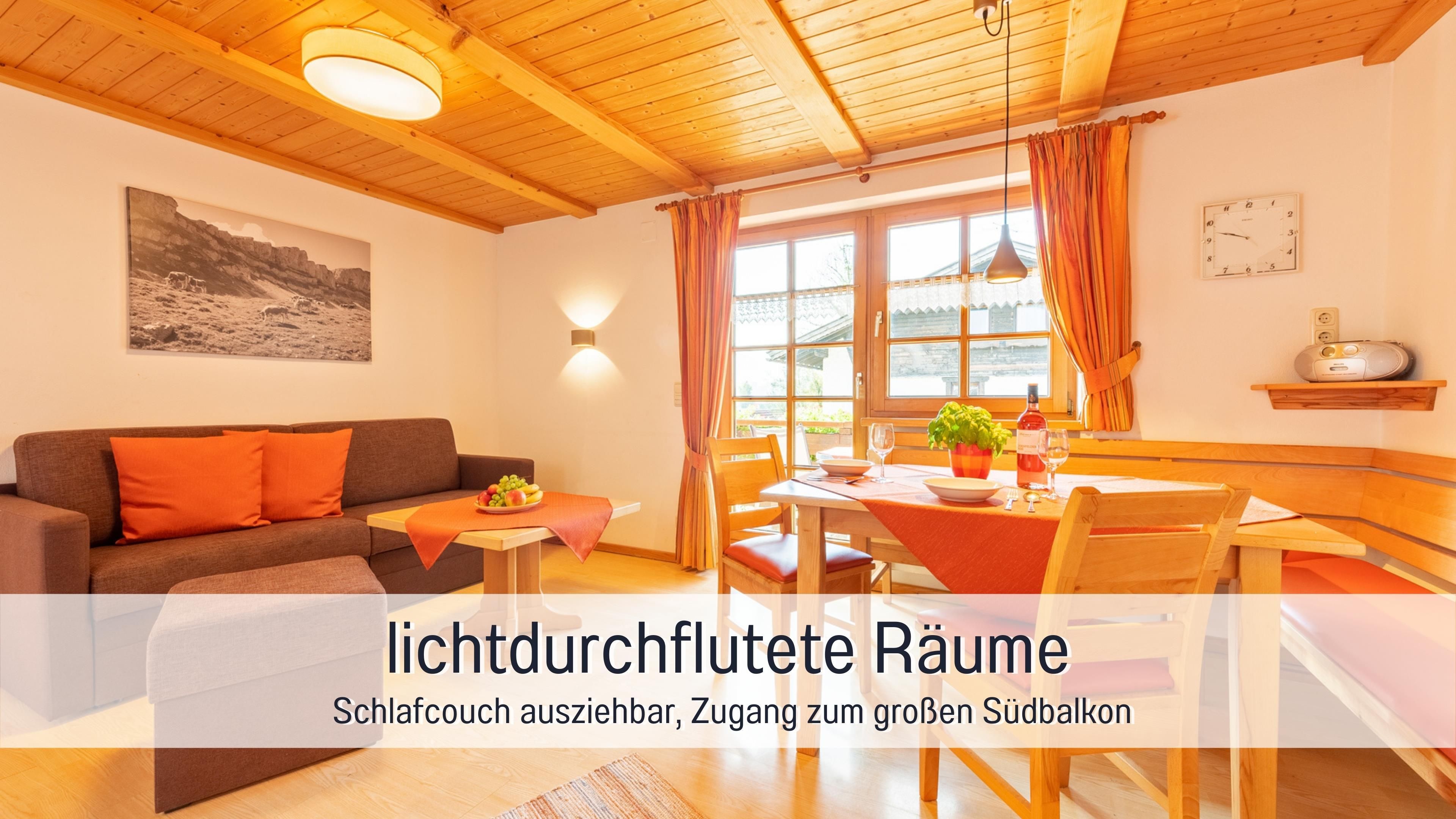 Urlaubsgefühl von Anfang an! Wir vermieten seit nunmehr 60 Jahren und bieten 3 helle, sonnige und gemütlich eingerichtete Ferienwohnungen an. Alle Wohnungen verfügen über einen Balkon, von dem man einen herrlichen Bergblick hat. Unser Hof eignet sich für naturverbundene Gäste, die ihren Urlaub gerne individuell gestalten möchten und dennoch den persönlichen Kontakt genießen.