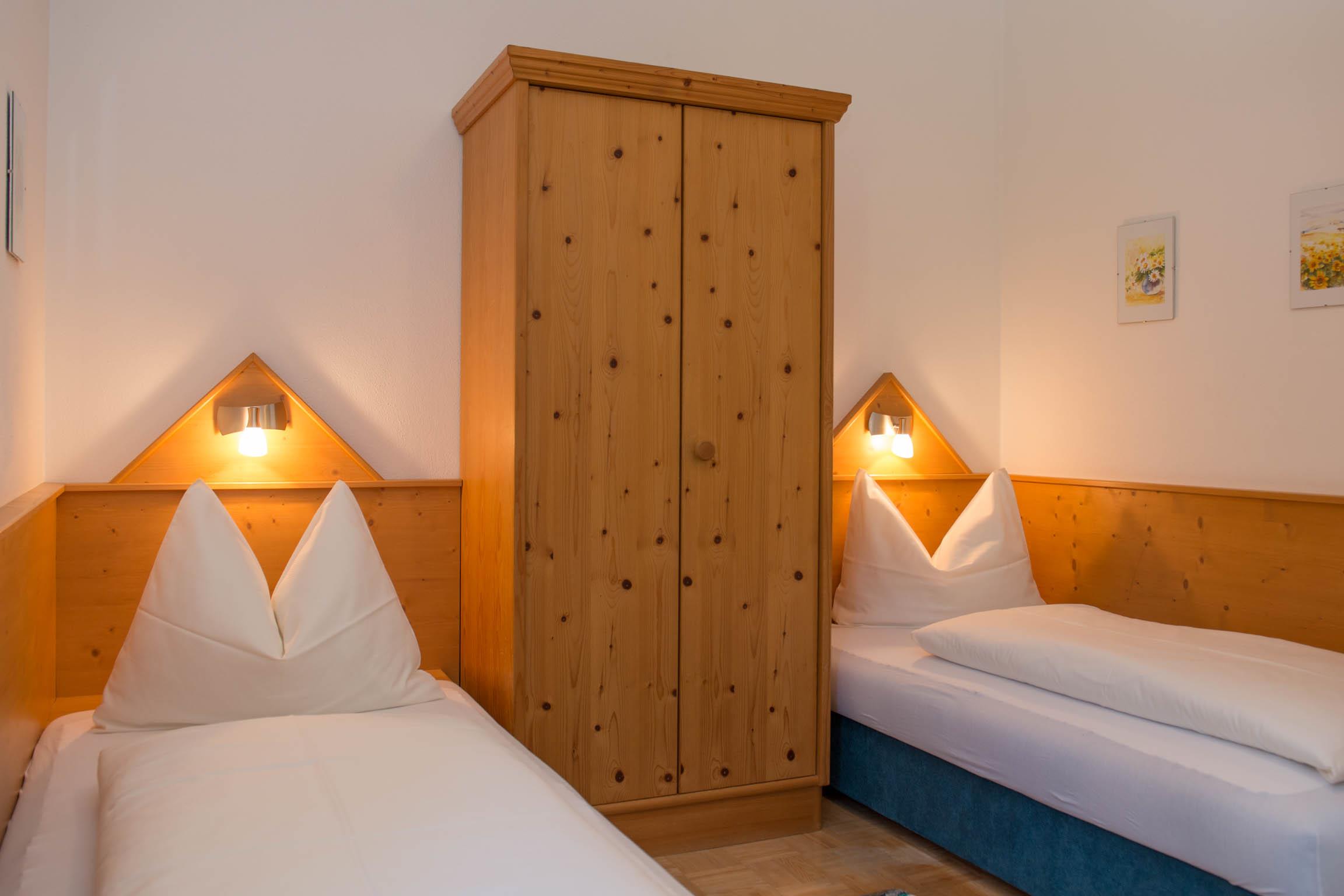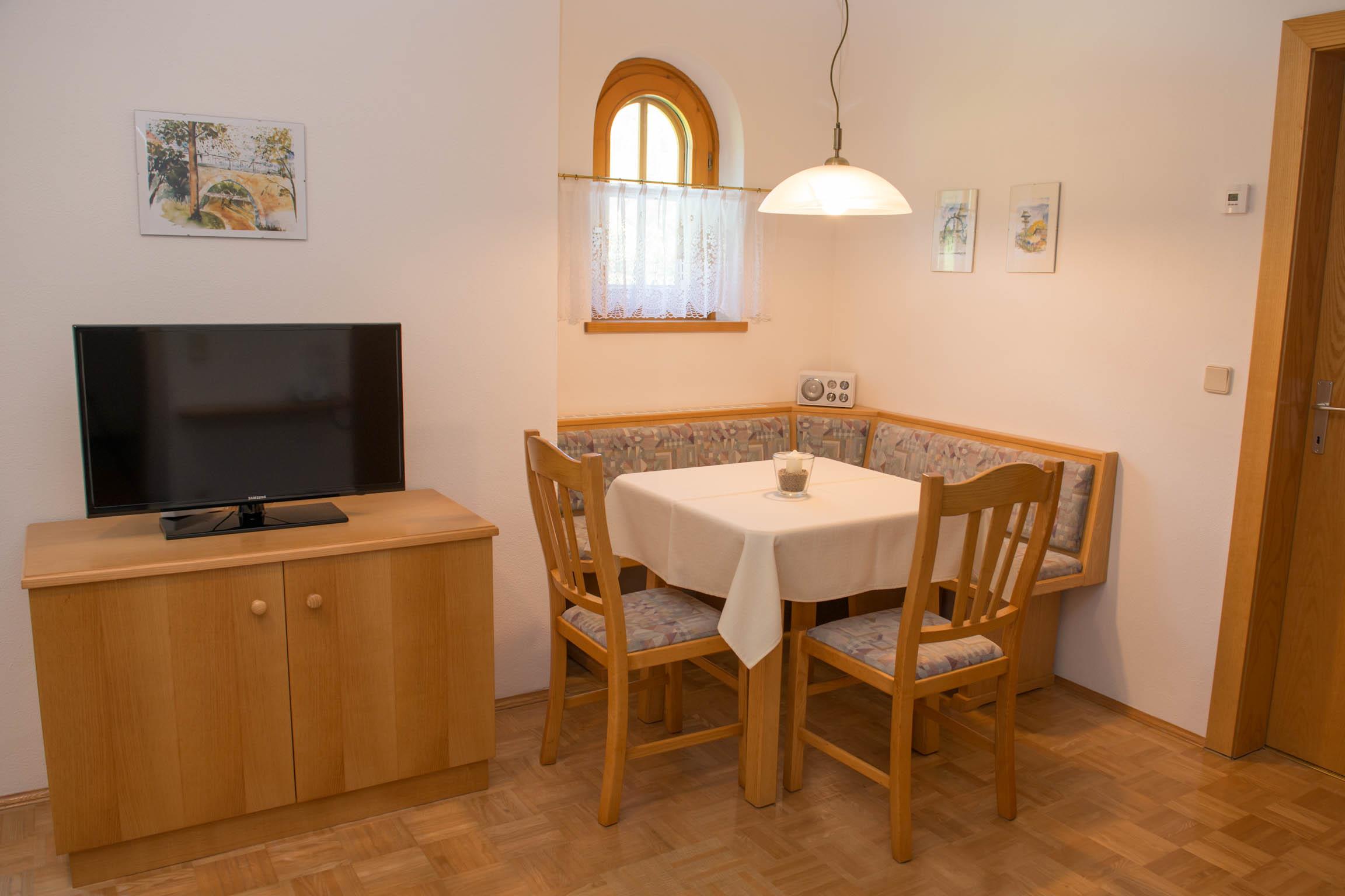 Ferienwohnung mit 55 m² für 2-4 Personen Lage: 1. Stock, Südseite mit Blick zum Garten Wohnzimmer mit Essecke Schlafzimmer mit Doppelbett Kinderzimmer mit 2 Betten kleine Küche mit Spülmaschine Vorraum Badezimmer mit Dusche WC Balkon