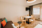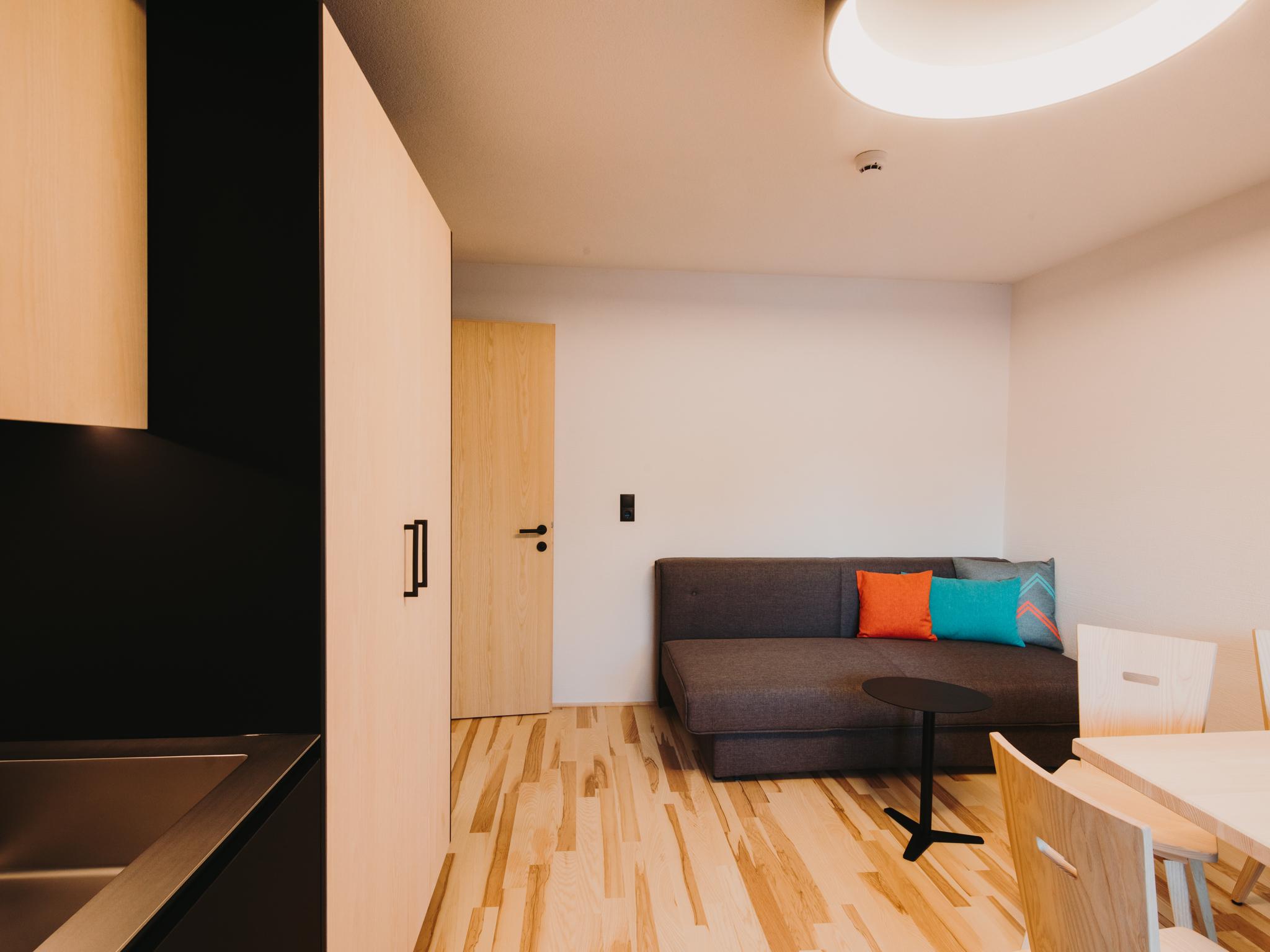 Bis zu 5 Personen einer Familie oder eine kleine befreundete Gruppe finden in den geräumigen Familienstudios Family Alpin Platz. Ein getrenntes Schlafzimmer mit Doppelbett und einem Einzelbett aus Zirbenvollholz sowie ein Wohnbereich mit hochwertiger Schlafcouch für die 4. und 5. Person sorgen für die nötige Erholung. Essbereich mit Kitchenette, Badezimmer mit Walk-In Regendusche und WC, Balkone für sonnige Stunden und panoramareiche Ausblicke. Glasfaser-TV im Schlaf- und Wohnzimmer, Telefon, Safe und kostenloses WLAN.