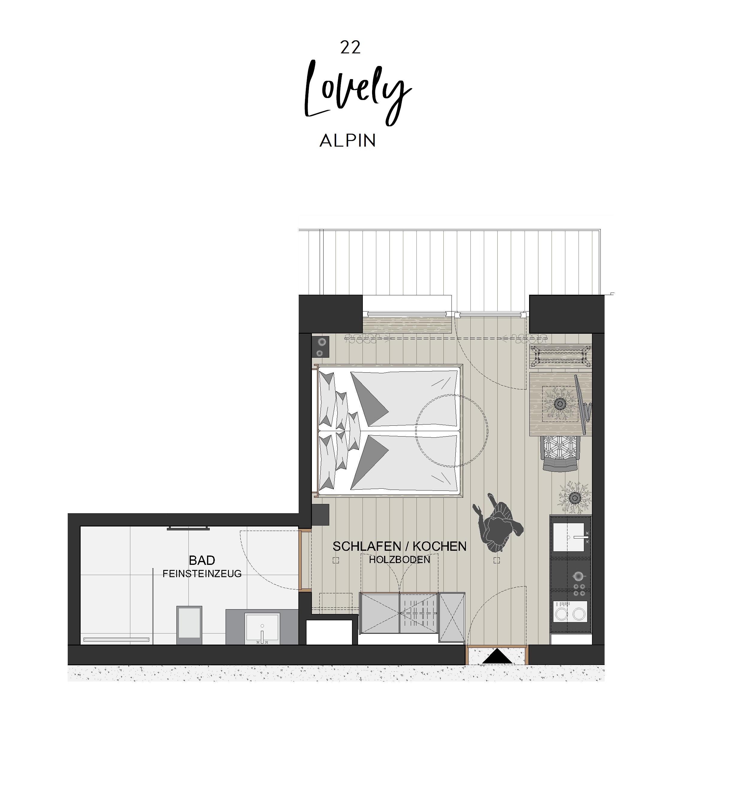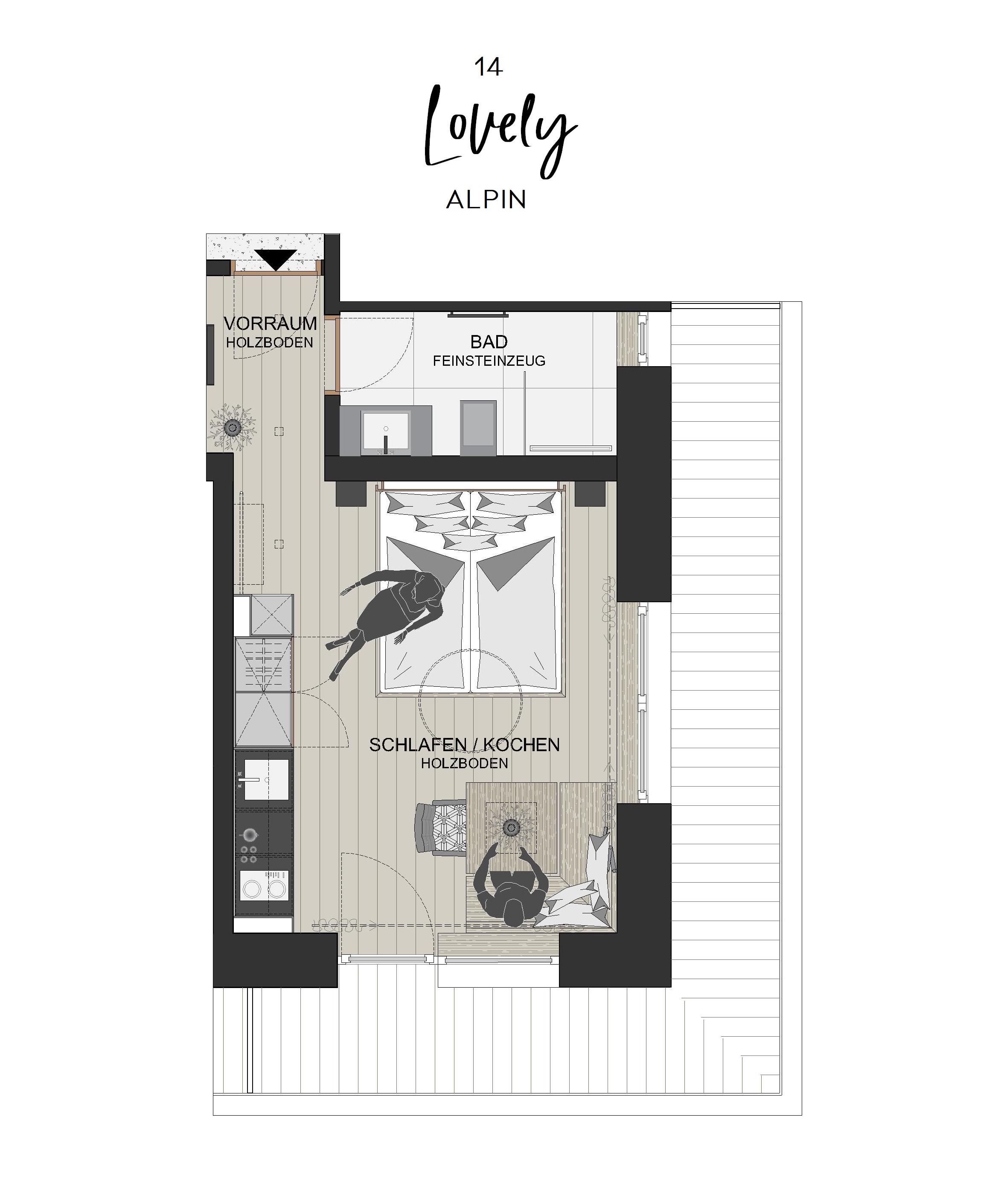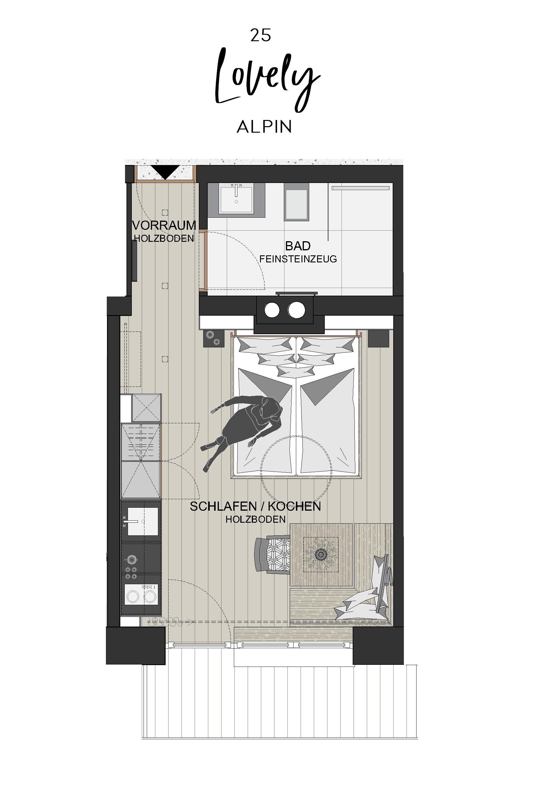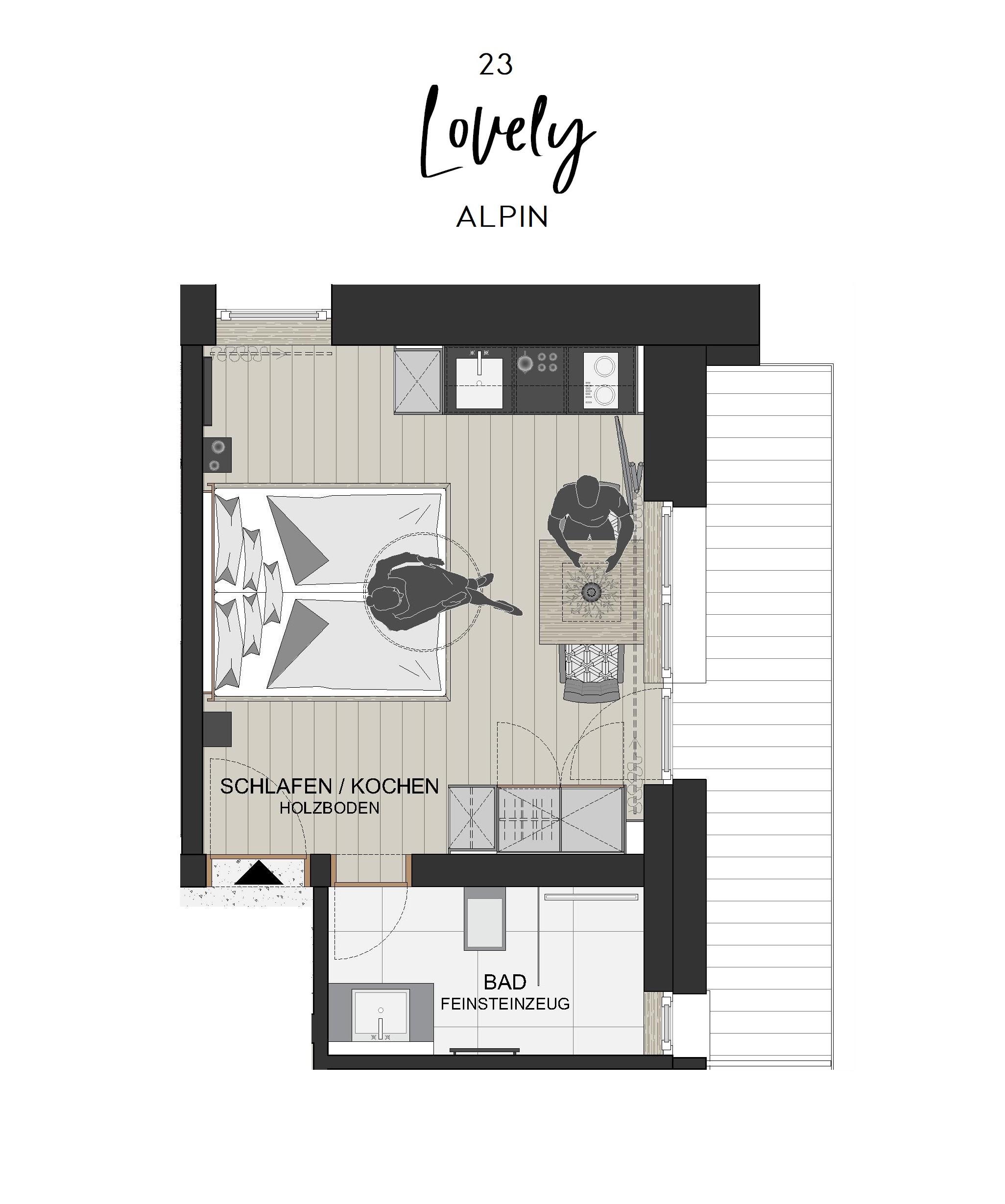 Hell, gemütlich, natürlich – einfach lovely! Die helle und freundliche Einrichtung der Doppelstudios Lovely Alpin gepaart mit dunklen Akzenten sorgt für sofortigen Wohlfühl-Effekt. Hochwertiges Bett aus Zirbenvollholz für pure Erholung während des Schlafs. Kitchenette für die nötige Flexibilität bei der Verpflegung. Kleiner Essbereich, Badezimmer mit Walk-In Regendusche und WC. Auf den Balkonen die Sonne und das Bergpanorama genießen. Glasfaser-TV, Telefon, Safe und kostenloses WLAN.