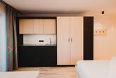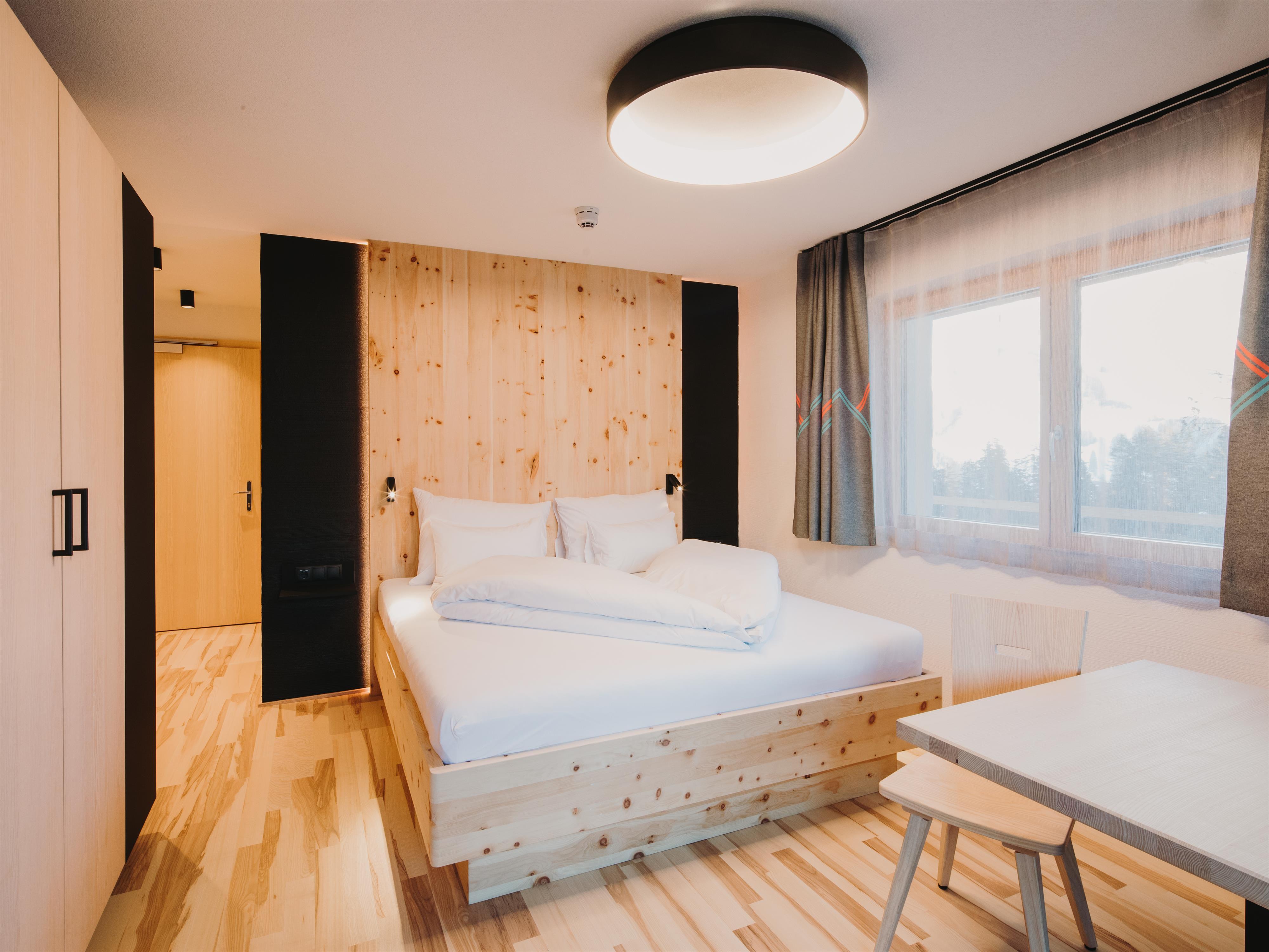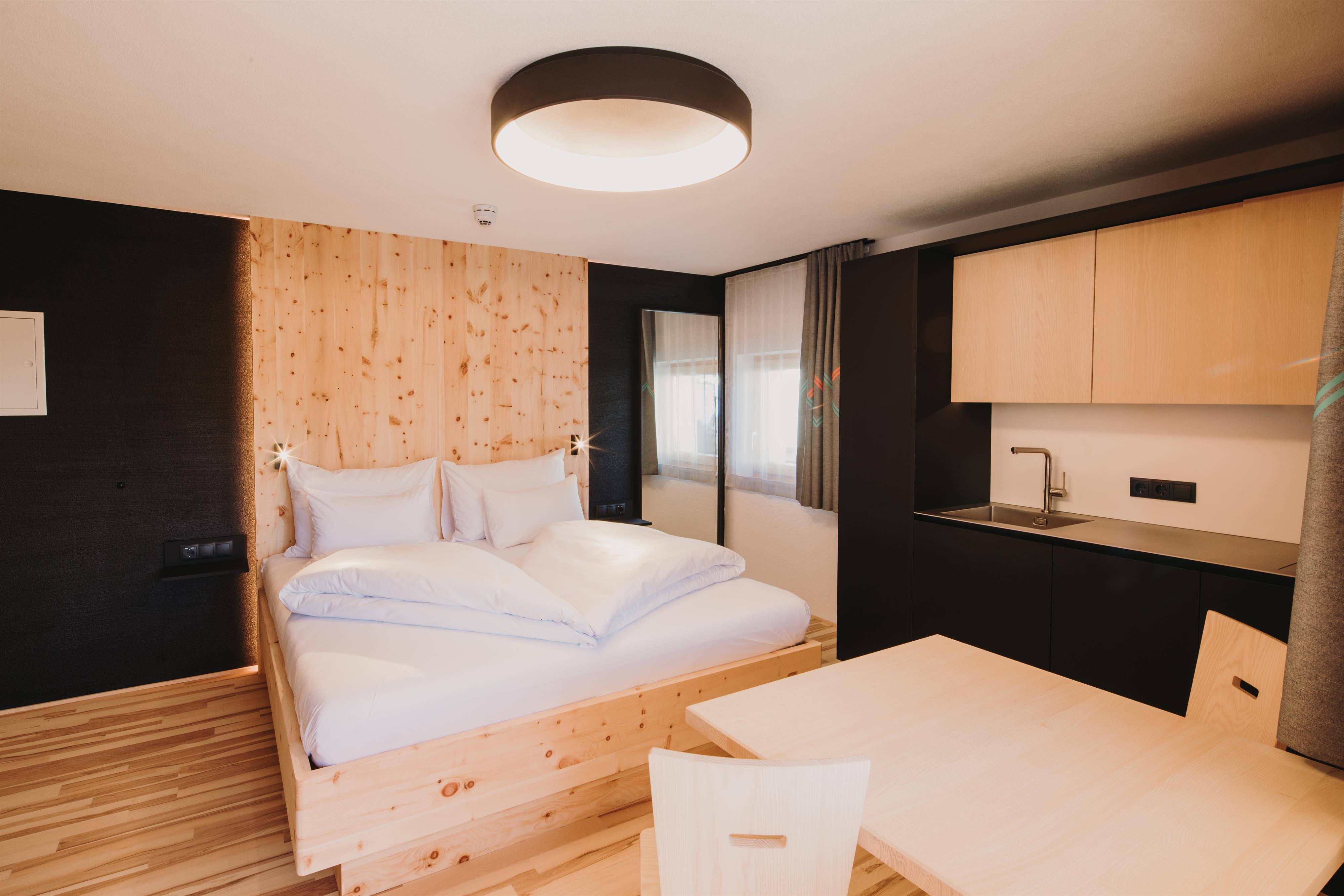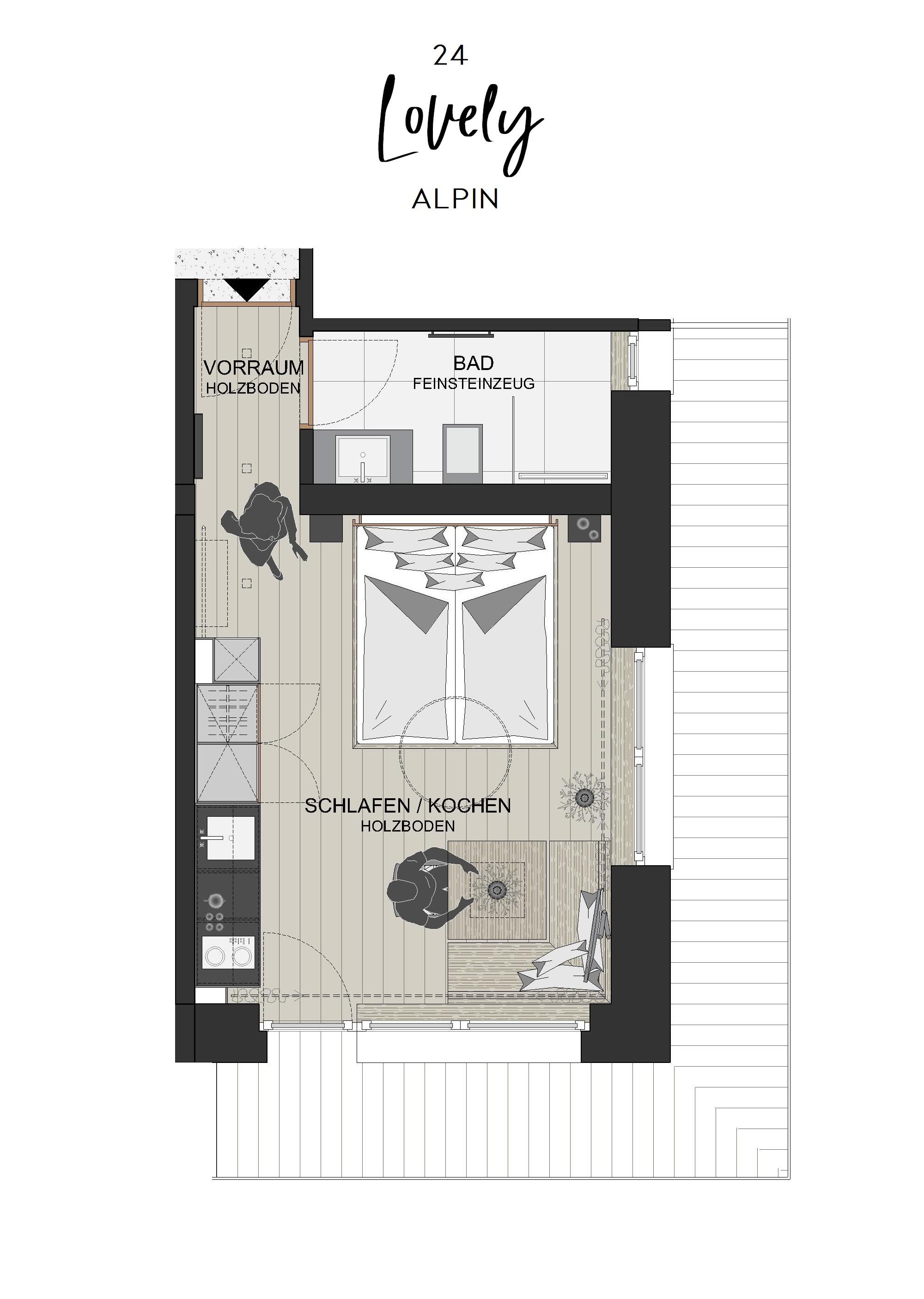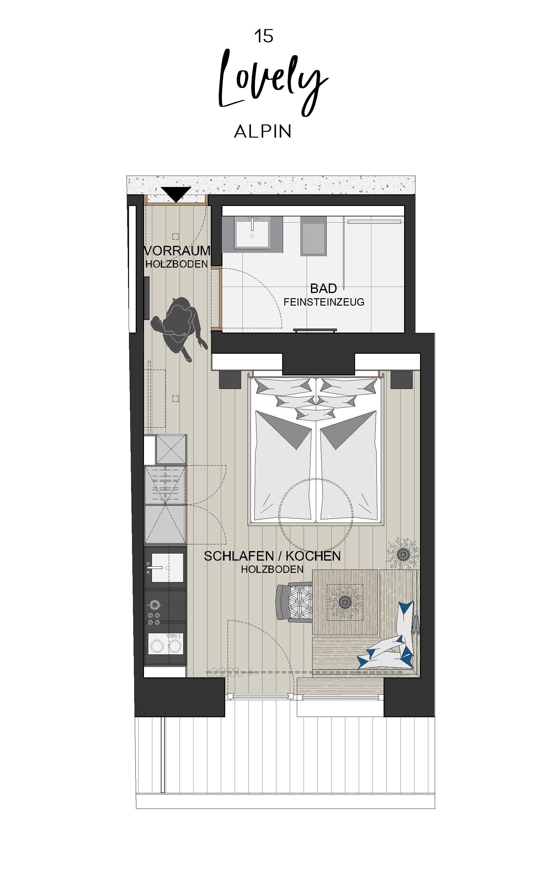 Hell, gemütlich, natürlich – einfach lovely! Die helle und freundliche Einrichtung der Doppelstudios Lovely Alpin gepaart mit dunklen Akzenten sorgt für sofortigen Wohlfühl-Effekt. Hochwertiges Bett aus Zirbenvollholz für pure Erholung während des Schlafs. Kitchenette für die nötige Flexibilität bei der Verpflegung. Kleiner Essbereich, Badezimmer mit Walk-In Regendusche und WC. Auf den Balkonen die Sonne und das Bergpanorama genießen. Glasfaser-TV, Telefon, Safe und kostenloses WLAN.