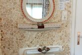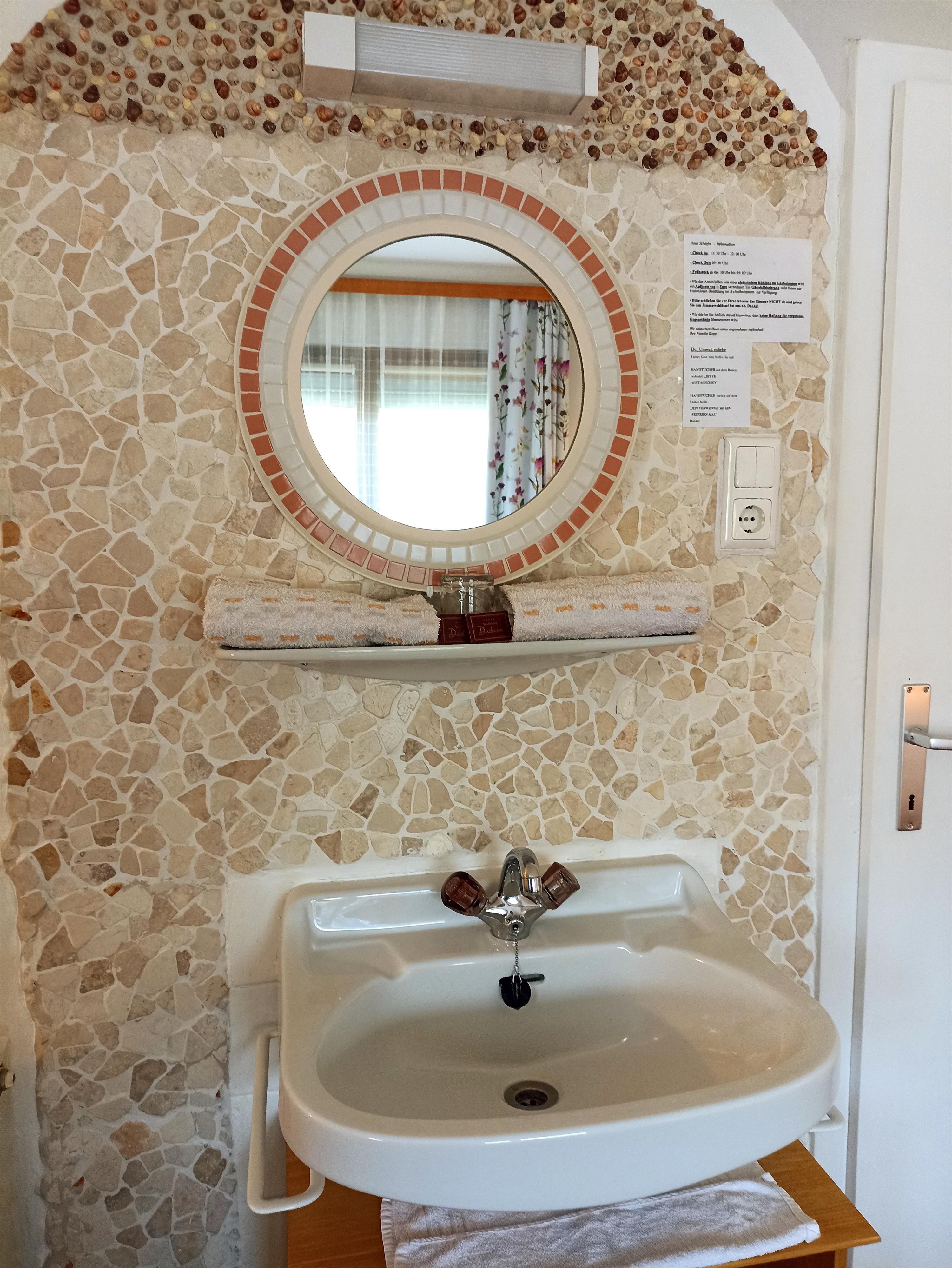 Badraum mit Dusche, Waschbecken, Ablage, Spiegel und WC, Dusch - und Handtücher