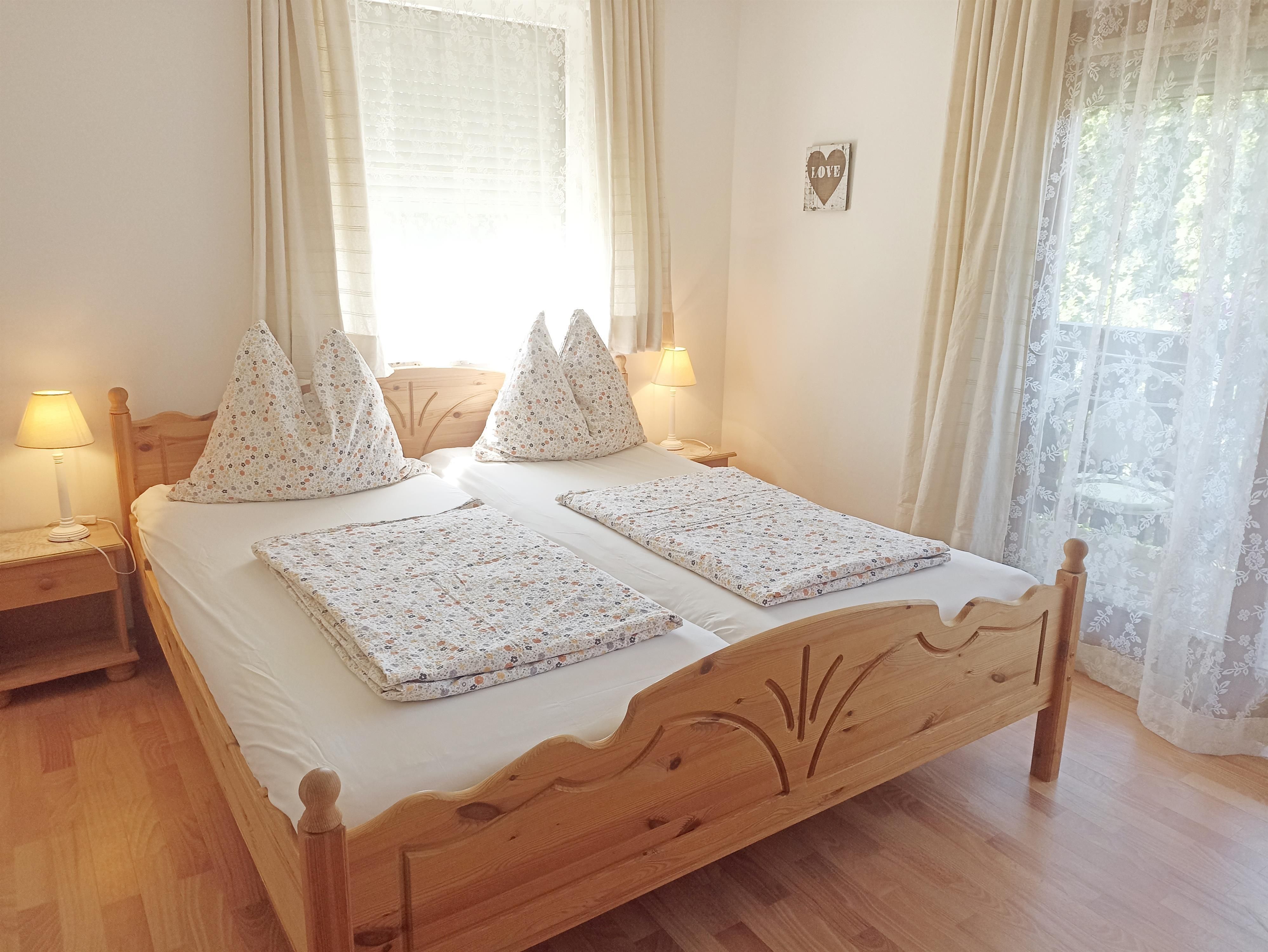 1 Doppelschlafzimmer mit Doppelbett fußfrei, Nachtkästchen, Kleiderschrank, ausziehbare Sitz - Schlafcouch, Beistelltisch und Balkon südseitig SAT-TV, Waschbecken mit Ablage, Spiegel