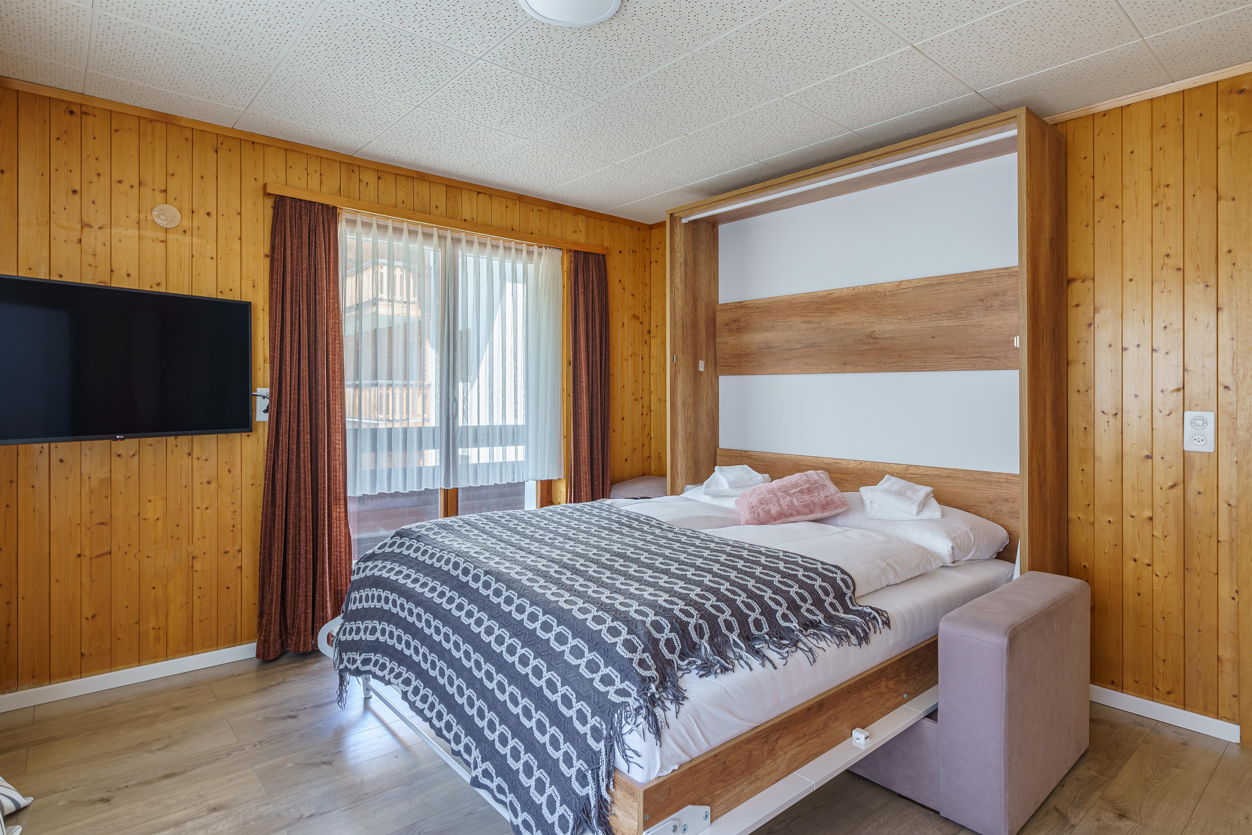 Vom Balkon genießen Sie einen schönen Blick auf die Berglandschaft. Das Badezimmer ist mit Dusche und WC ausgestattet. Bettwäsche und Handtücher sind inklusive.