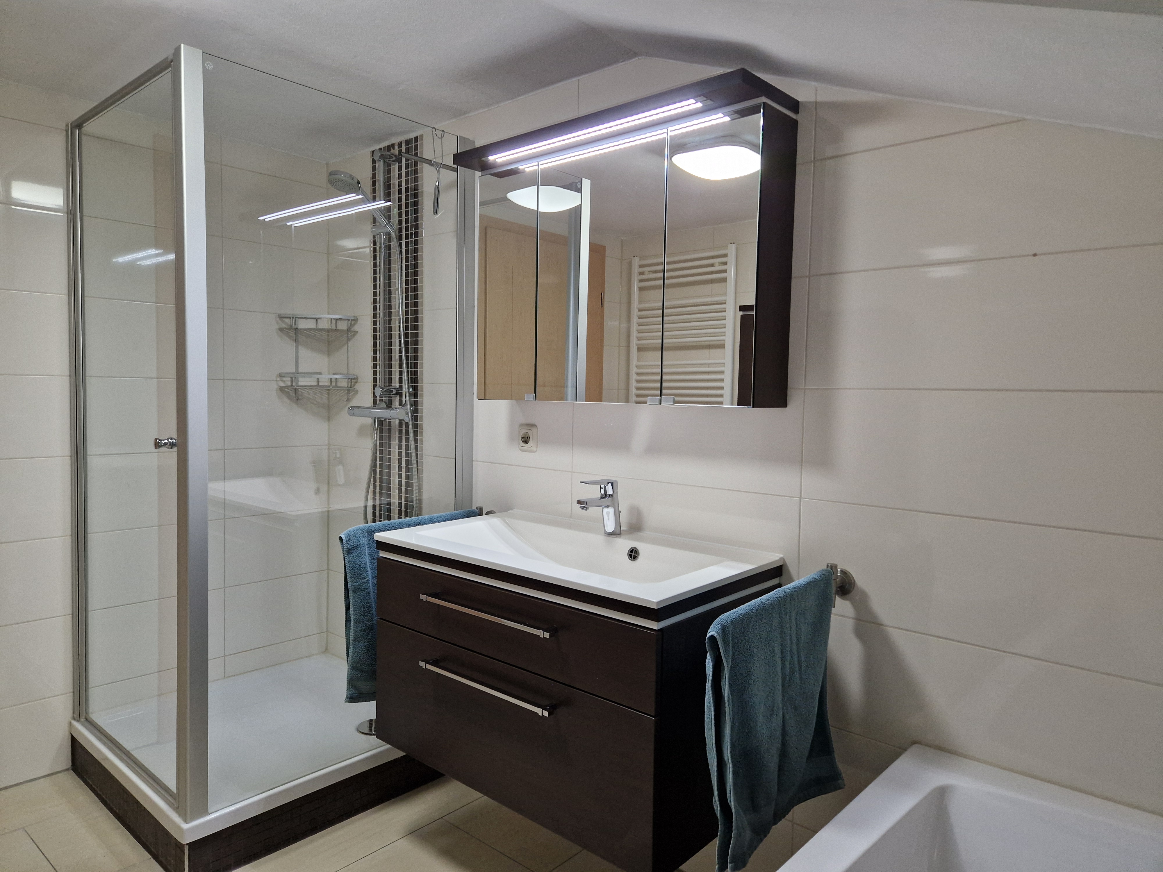 Unsere gemütlich-modern eingerichtete Ferienwohnung Kehlsteinblick befindet sich im Dachgeschoss (2. Stock) unseres Bauernhauses und wurde komplett renoviert. Mit 2 getrennten Schlafzimmern und einer großen Schlafcouch sowie einem Schrankbett im Wohnzimmer können hier bis zu 8 Personen und ein Kleinkind (Reisebett) ihren Urlaub verbringen. Die voll ausgestattete Küche (Spülmaschine, Senseo Kaffemaschine, Wasserkocher, Toaster, Backofen mit Ceranfeld) mit gemütlicher Essecke lädt zum gemeinsamen Kochen und Genießen ein. Backpapier, Gewürze, Spülmittel und -lappen, Geschirrtücher und Spülmaschinentabs stehen bereit. Im Badezimmer ist Seife vorhanden sowie 2 Rollen Toilettenpapier für den Anreisetag. Kostenloses WLAN und Parkplätze am Haus sind vorhanden. Auf Anfrage stellen wir für unsere kleinen Gäste gerne kostenfrei ein Reisebett (60cmx120cm),einen Hochstuhl, eine Wickelkommode und einen Windeleimer zur Verfügung. Nach Absprache und gegen Gebühr kann eine Waschmaschine und ein Wäschetrockner genutz werden.