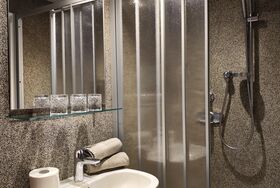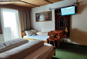 Doppelzimmer (ca. 22 m²) mit gemütlicher Sitzgelegenheit, TV und einem Badezimmer mit Dusche/WC. Auf dem möblierten Balkon lässt sich das einzigartige Bergpanorama genießen.