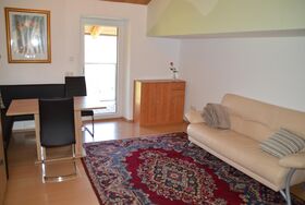 Unser preiswertes Apartment mit 55 m² Wohnfläche für 1-4 Personen. Vom Vorraum mit Garderobe geht es in den Wohnraum mit Küchenblock, Couch und Sitz-Essecke. Daneben befindet sich ein kleiner Balkon mit Tisch und 2 Stühlen mit Seeblick.