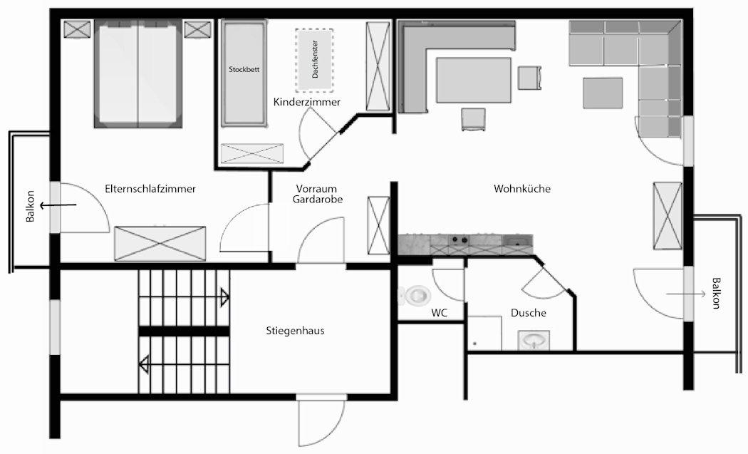 Die Wohnung verfügt über 2 Schlafräume, 1 Doppelzimmer und ein Einzelzimmer. Einzelzimmer kann mit Stockbett zweibettig gemacht werden.