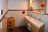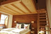Diese barrierefreie Ferienwohnung in Vollholz mit offenem Dachstuhl, Galerie und Balkon besteht aus einem Wohnzimmer mit Essplatz, Küchenbereich, 2 Schlafzimmern (eines davon mit Galerie), Bad mit Dusche, Doppelwaschbecken, WC und zusätzlichem separaten WC.