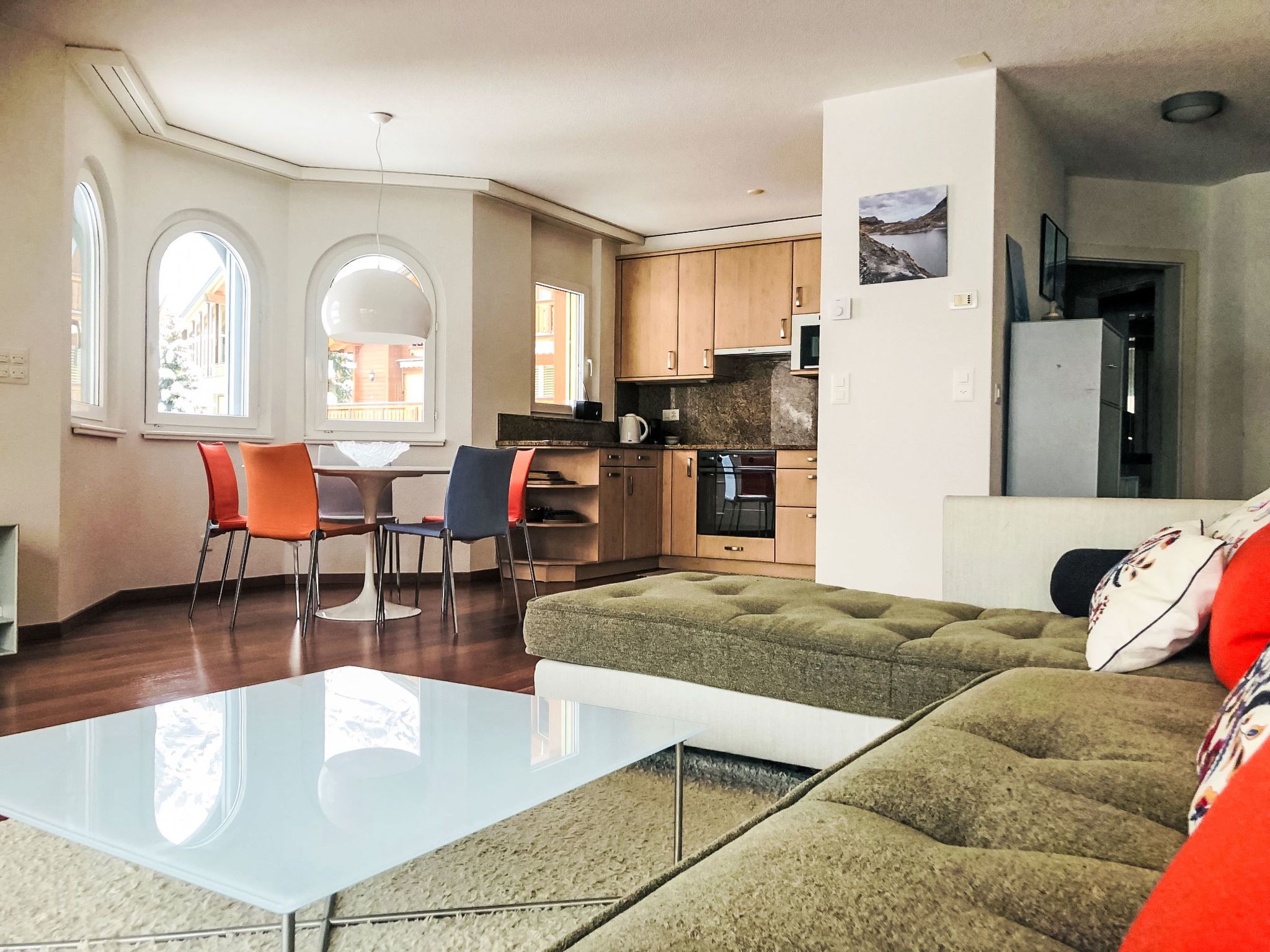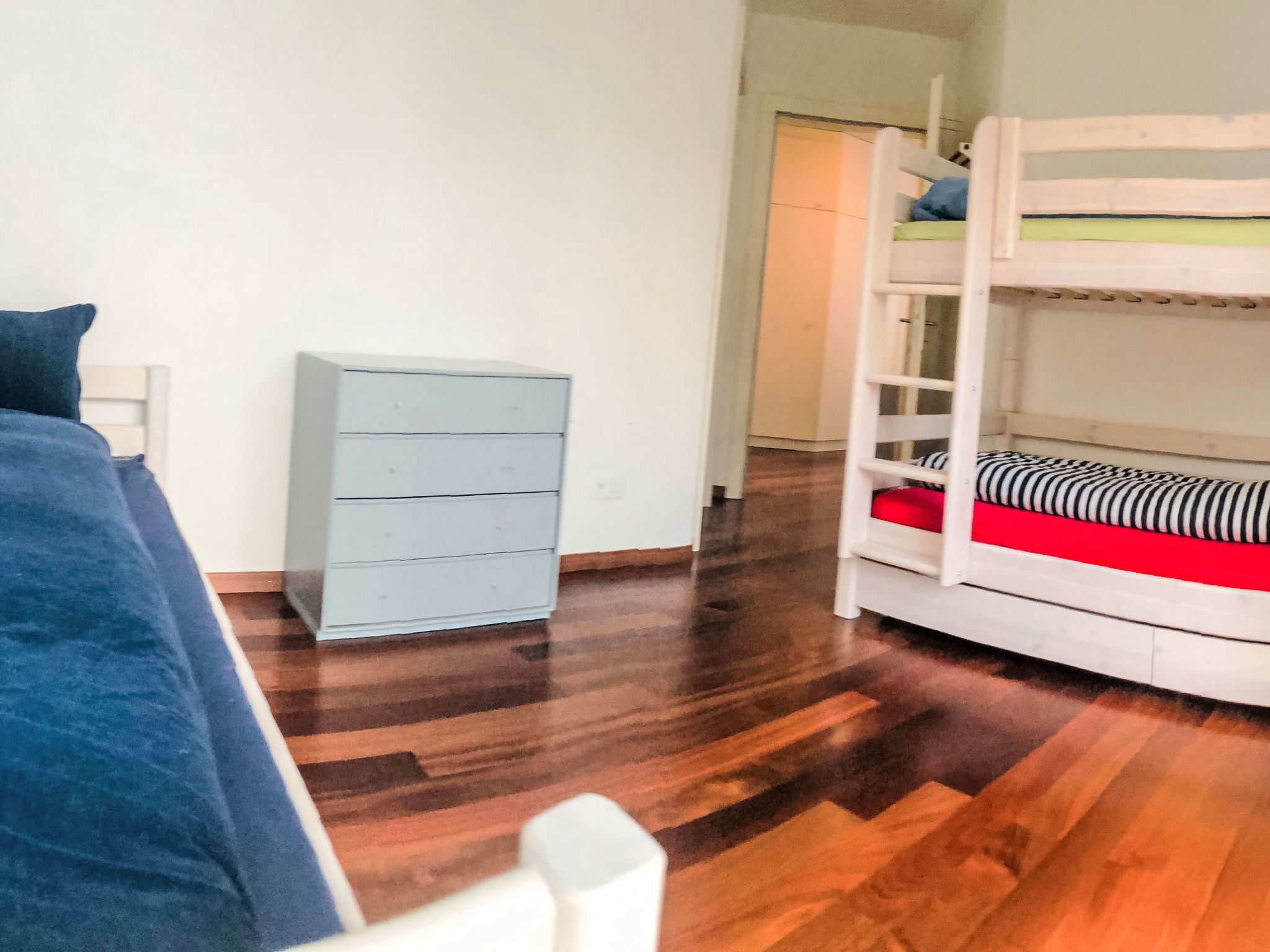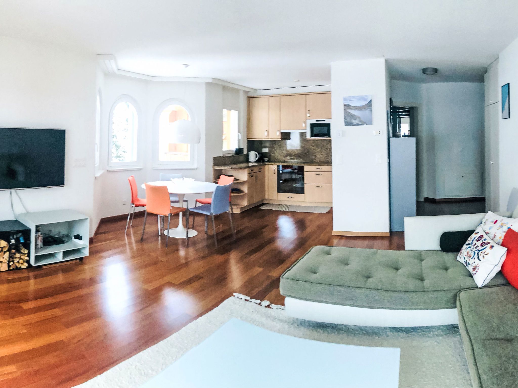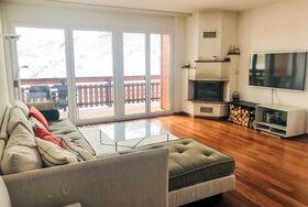 3-Zimmer-Wohnung 90 m2 im 3. Stock. Komfortabel und gemütlich eingerichtet: Wohn-/Esszimmer mit Kabel-TV (Flachbildschirm), Radio und DVD. Ausgang zum Balkon. 1 Doppelzimmer mit 1 Doppelbett. 1 Zimmer mit 1 Bett und 1 x 2 Etagenbetten. Offene Küche (Backofen, Geschirrspüler, 4 Glaskeramikplatten, Wasserkocher, Mikrowelle). 2 Duschen/WC, sep. WC. Balkon 6 m2, Südlage. Balkonmöbel. Schöne Sicht auf die Berge und die Landschaft. Bitte beachten: Nichtraucher-Unterkunft.