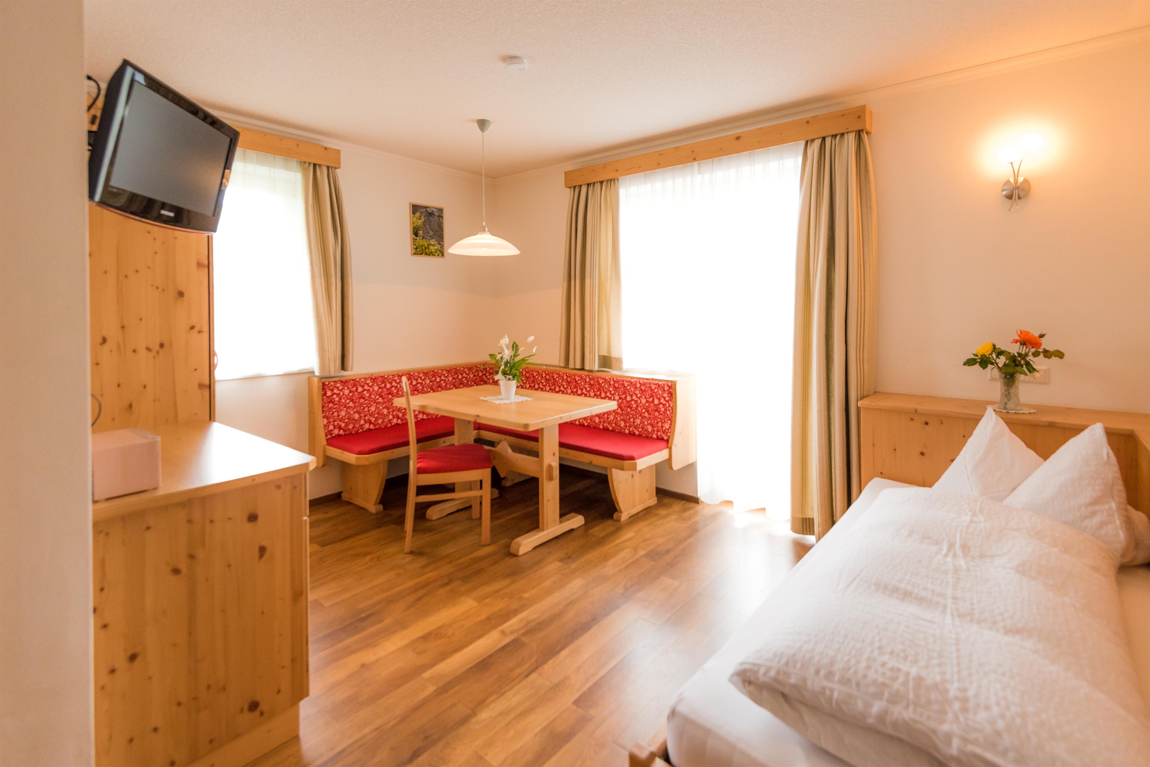Dusche, separates WC, Schlafzimmer, separater Wohnschlafraum mit einer Federkernschlafcouch oder Einzelbett Massiv mit Sitzecke, eigener Balkon. 2 X TV, W-Lan, Kühlschrank***, Wasserkocher, Telefon, Radio, Föhn, und Safe.