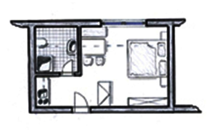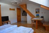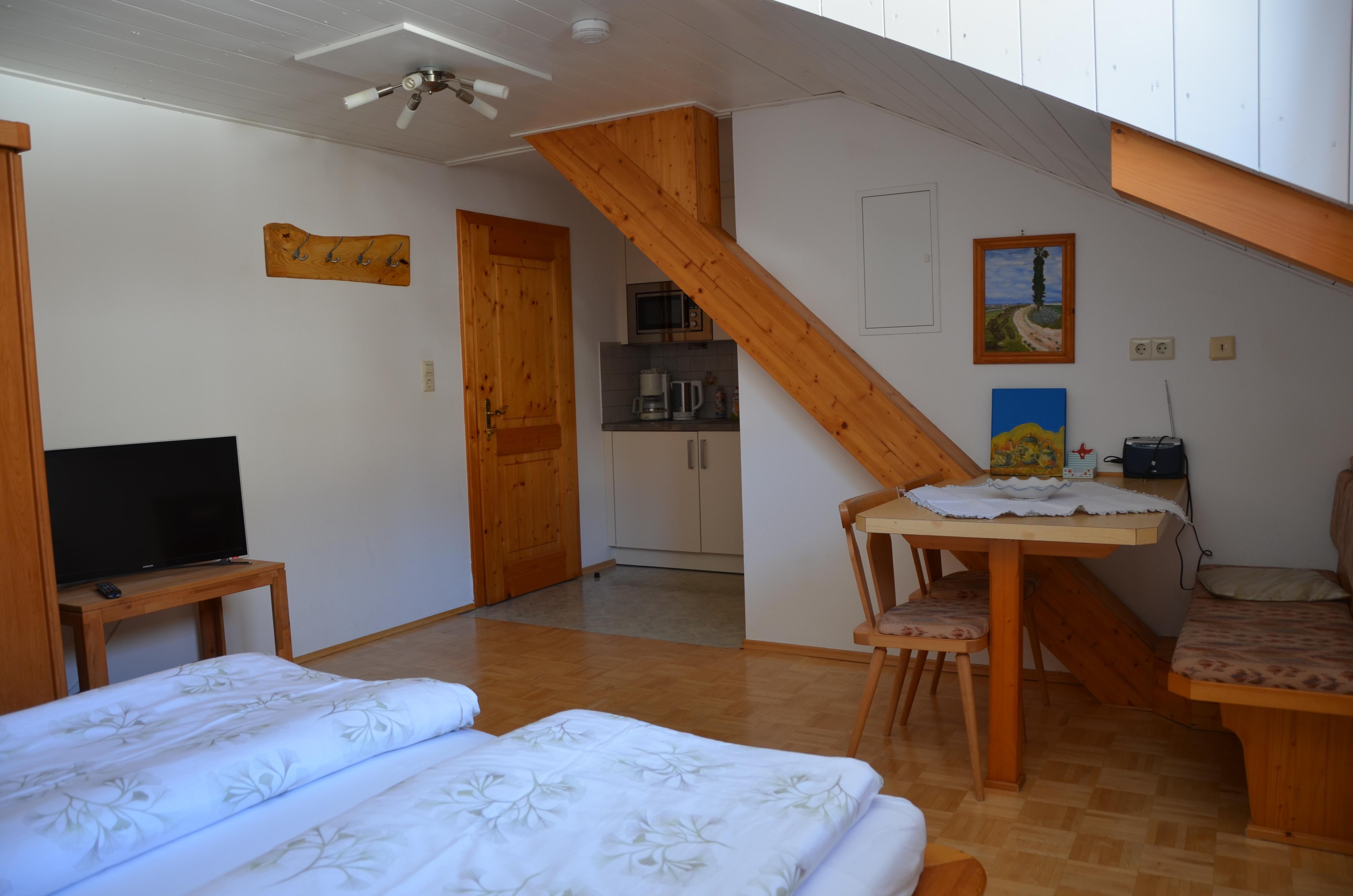 Freundlich eingerichtetes 30m² Studioapartment für 2 Personen mit Platz für Kinder-Zusatzliege od. Gitterbett. Wohnschlafzimmer, Kochnische, Radio, Mikrowelle, 2 Cerankochfelder, Kühlschrank mit Gefierfach, Kaffeemaschine, Wasserkocher. Dusche/WC.