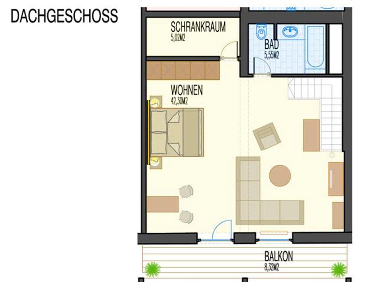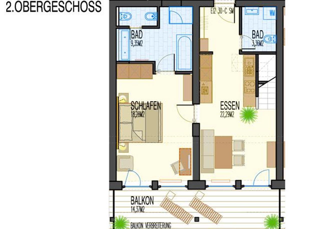 *ca. 115m² *1-6 Personen *Wohnung über 2 Etagen unten: *1 Schlafzimmer *1 Küche mit Essbereich *1 Badezimmer mit Doppelwaschtisch, Badewanne, Dusche und separatem WC/Bidet *1 WC extra *großzügiger Balkon oben: *1 Schlafzimmer mit großem Wohnbereich *1 Badezimmer mit Badewanne und WC *ein weiterer großzügiger Balkon