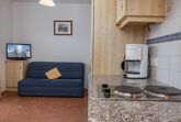 Die Appartements sind ca. 35 m2 groß im Nebengebäude (ca. 50m vom Haupthaus entfernt), haben 1 Schlafzimmer, Dusche/WC, Wohnküche mit ausziehbarer Couch (150x200, auf der die Kinder schlafen könnten), Mikrowelle, Herd, Kaffeemaschine und Kühlschrank mit Gefrierfach, Essecke, 2xSat-TV und Balkon; Nichtraucher