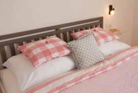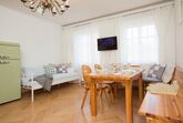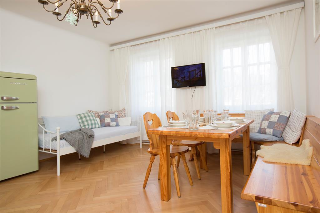56er.3 Gemeinsam urlauben zu viert, fünft oder sechst Das 56er.3 ist ein überaus kommodes Apartment im ersten Stock. Auf den 70 Quadratmetern können auch sechs Personen noch entspannt chillen. Schlafzimmer 1 wartet mit einem Doppelbett auf. Das Familienzimmer mit einem Doppelbett & einem schnuckligen Daybed geht locker für drei Personen. Mit der Familie oder Freunden auch während der Essenszubereitung im Gespräch bleiben, ist dank der geräumigen Wohnküche superleicht. Eine überaus gemütliche wie große Leder-Essecke und ein Sofa zum komfortablen Sitzen und Liegen laden zu bunter Gemeinschaftlichkeit ein. Entspannung pur finden Gäste aber auch im eleganten, weißen Badezimmer. Entweder in der Badewanne oder in der Dusche. Ein getrenntes WC, ein kleiner Abstellraum und ein großes Entree mit Garderobe runden das Raumangebot des 56er.3 ab.