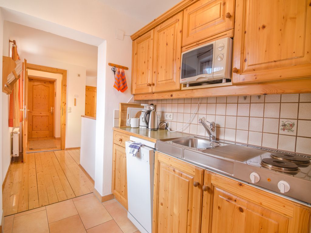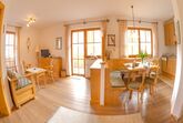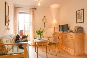 Heimelige, gemütliche, komfortable Vollholzmöbel-Wohnung mit viel Liebe zum Detail eingerichtet. Vorraum mit Garderobe, Wohnbereich mit SAT-TV, W-LAN, Radio, Couch, Essecke für max. 5 Personen. Kleinküche mit Geschirrspüler, Wasserkocher, Mikrowelle, Kaffeefiltermaschine, Kühlschrank mit Gefrierfach, Koch- und Essgeschirr, u.s.w. Zwei getrennte Schlafzimmer, Dusche, WC getrennt. Großer Südbalkon.