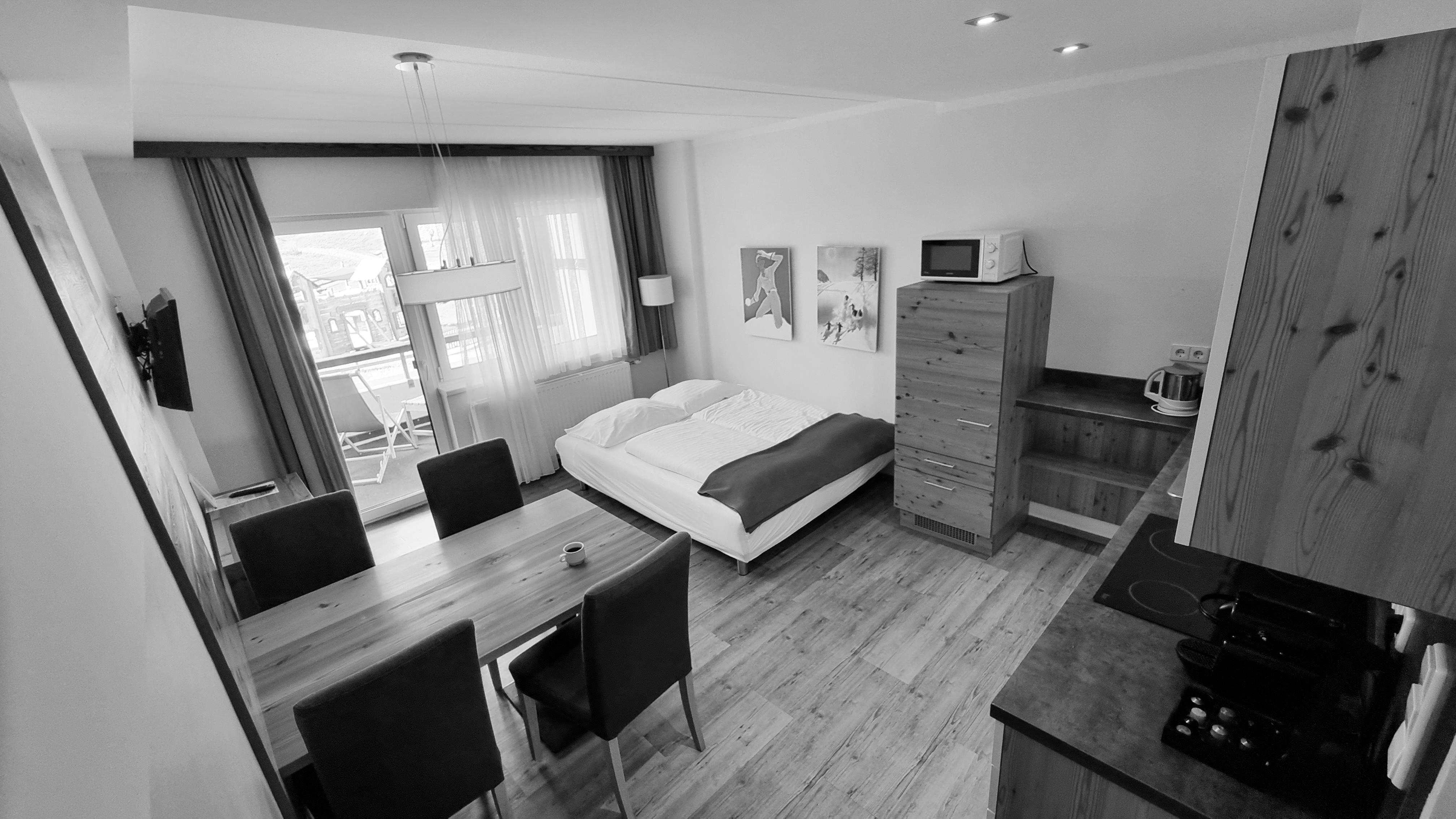 Sportlich und gemütliches Einraum-Appartement für 2 Personen: 1 Doppelbett oder Schlafsofa mit Bettwäsche; Kochnische mit Kühlschrank, Kochfeld, Geschirr, Kaffeemaschine und Wasserkocher; Dusche/WC mit Hand-/Duschtücher, Sat-TV, kein Balkon!