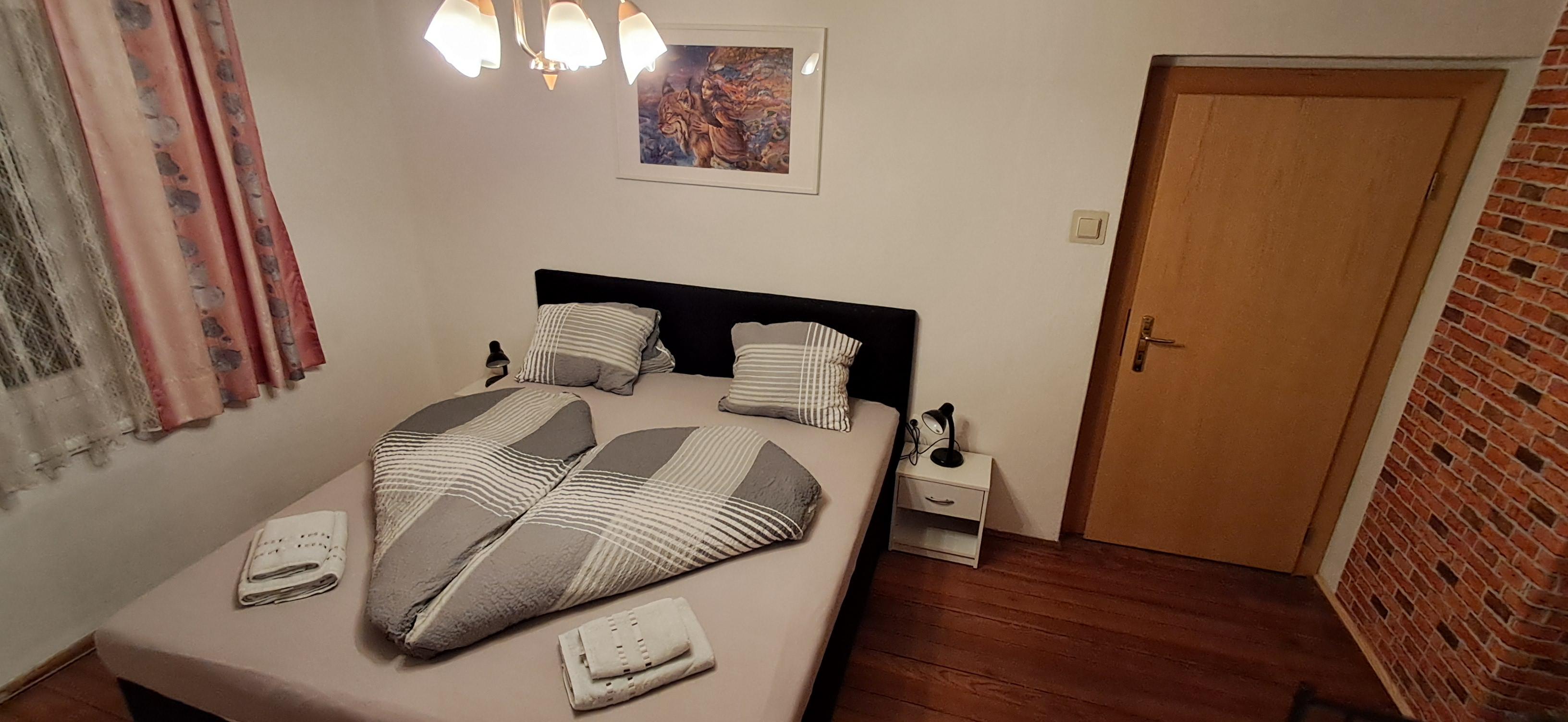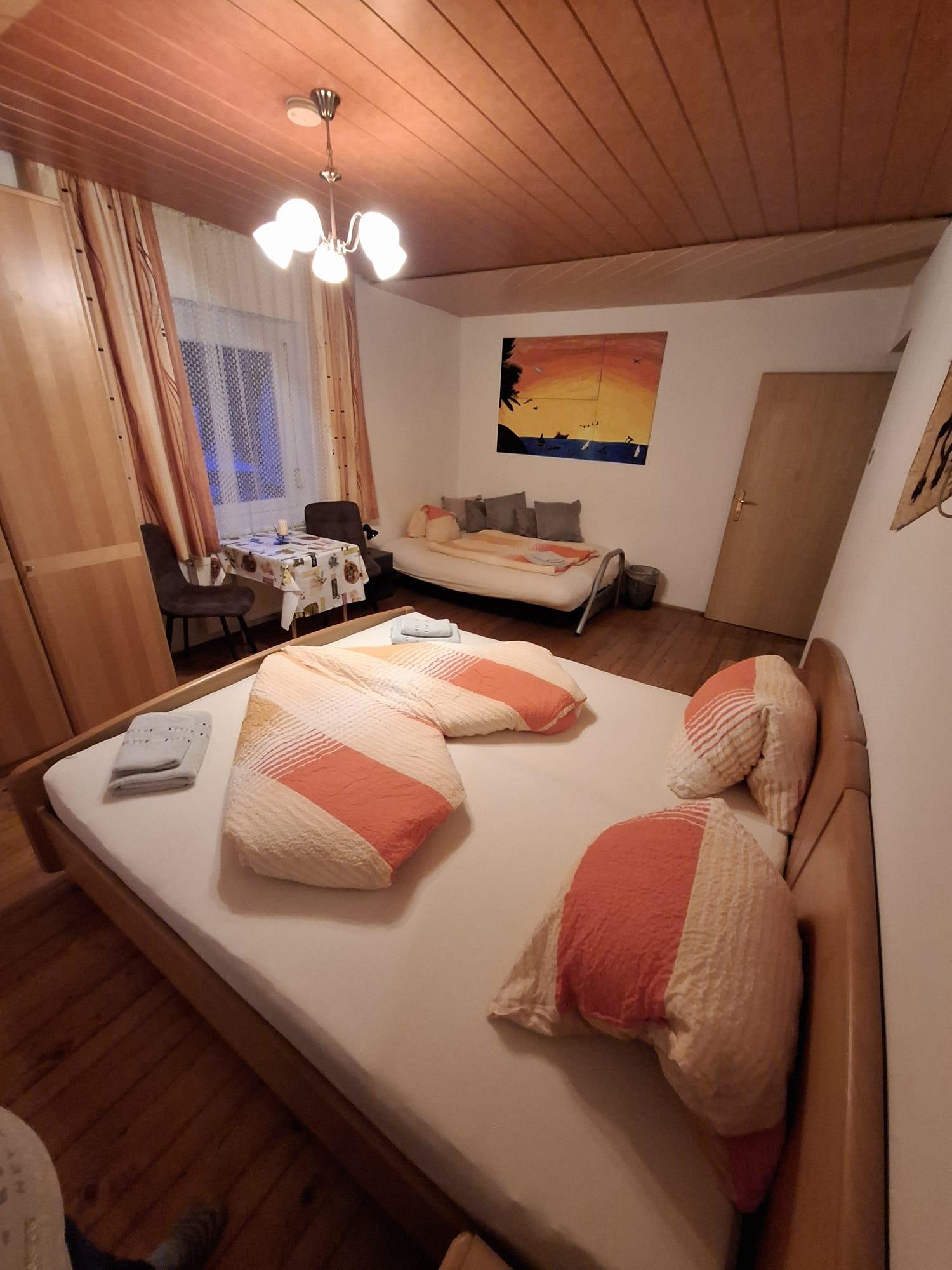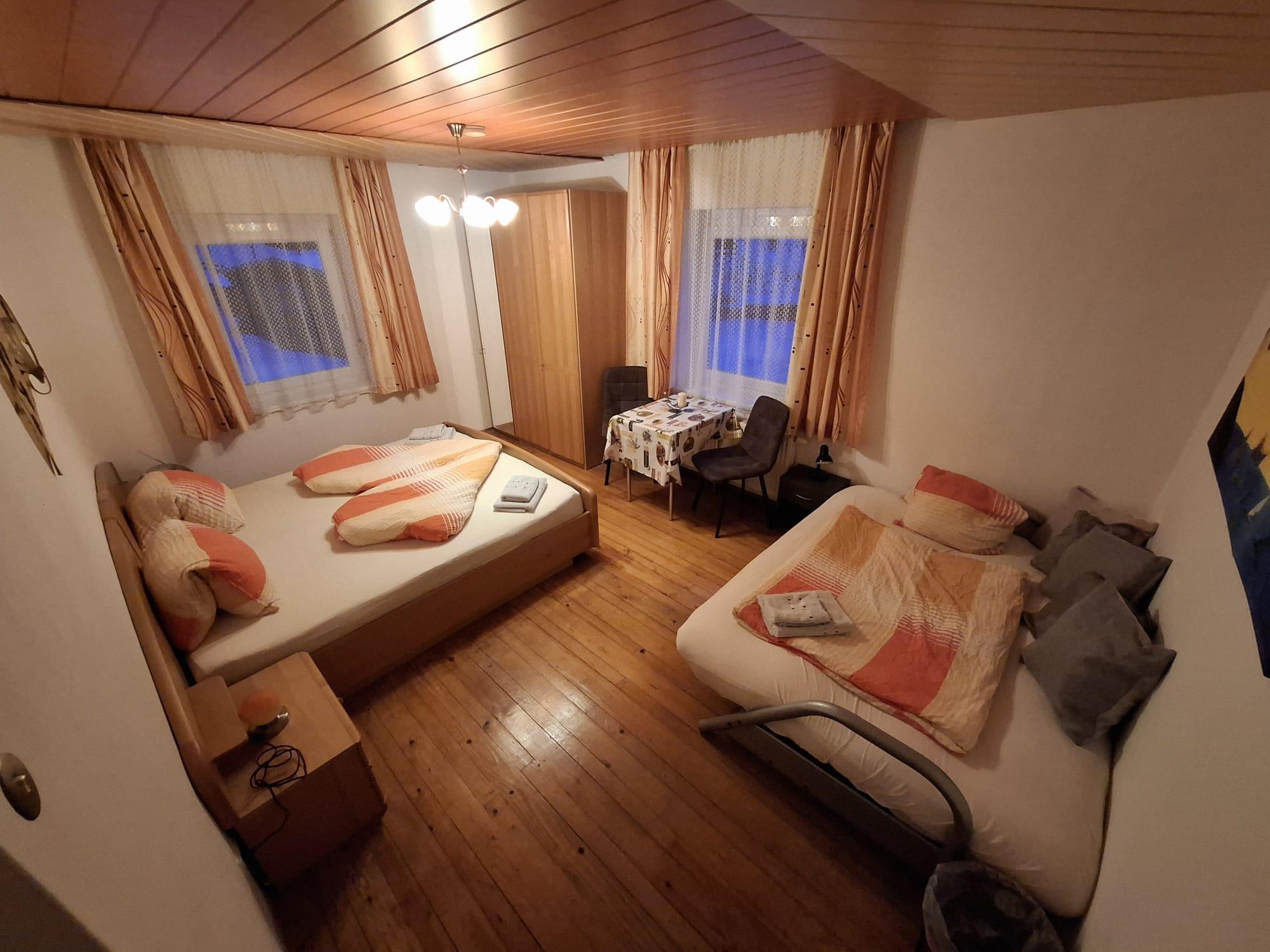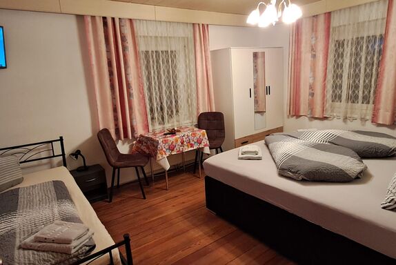 In zwei Zimmern befinden sich jeweils ein Doppelbett sowie ein Einzelbett. In beiden Zimmern sind ebenso Fernseher mit Satellitenanschluss zu finden. Im dritten Zimmer steht ein weiteres Doppelbett. In unserer Ferienwohnung gibt es auch einen schönen Vorraum mit Garderobe. Das Badezimmer verfügt über eine Dusche, ein WC und einen schönen Waschbereich. In der Küche findet man genügend Platz für bis zu 8 Personen. Mit einem großen Esstisch und einem Fernseher mit Satellitenanschluss steht auch gemütlichen Fernsehabenden nichts im Wege. Direkt von der Küche aus kommt man auf die Terasse wo sich auch der direkte Anschluss an den Garten mit Kamingrill befindet. Dort kann man gemütliche Grillabende genießen.