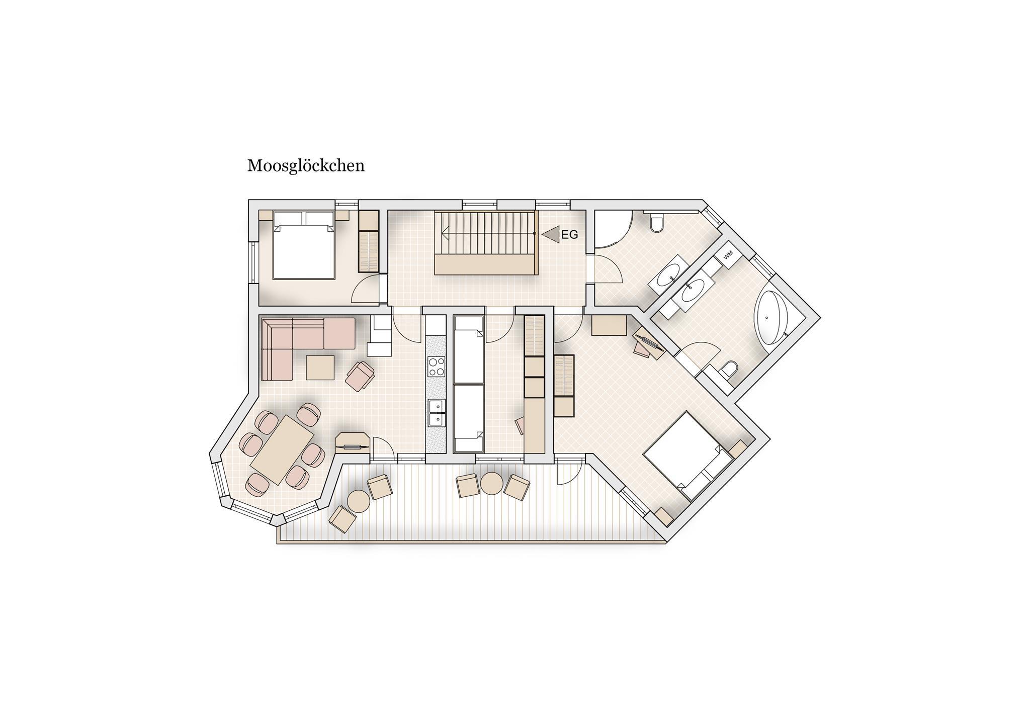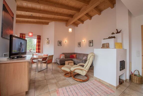MOOSGLÖCKCHEN - luxuriöse Großraumwohnung - ca. 100 m² (6 Personen) - für gehobene Ansprüche mit toller Aussicht, geräumigem Süd-Westbalkon, weitläufigem Wohnraum mit Essecke im gemütlichen Erker, komfortabler Sitzgarnitur, schönem Kachelofen, kompletter Küchenzeile (Geschirrspüler), Flat-Screen-HD-TV, Vorraum. Zwei Doppelbettzimmer, ein Twin-Bett-Zimmer, Bad mit Dusche/WC, Bad mit Bad/WC/Föhn und Waschmaschine. Traumhafter Blick über die Geigenbühel-Lichtung zur Hohen Munde, zauberhaft!