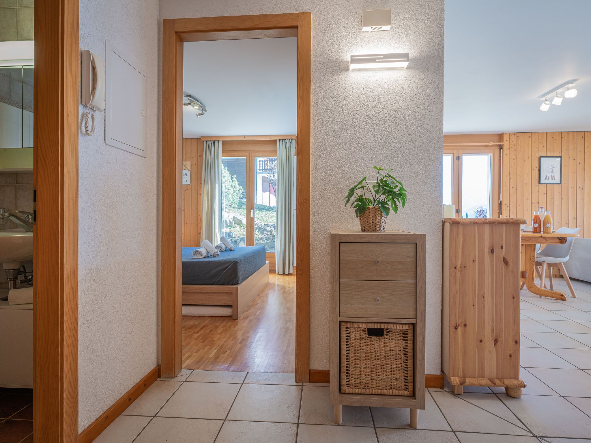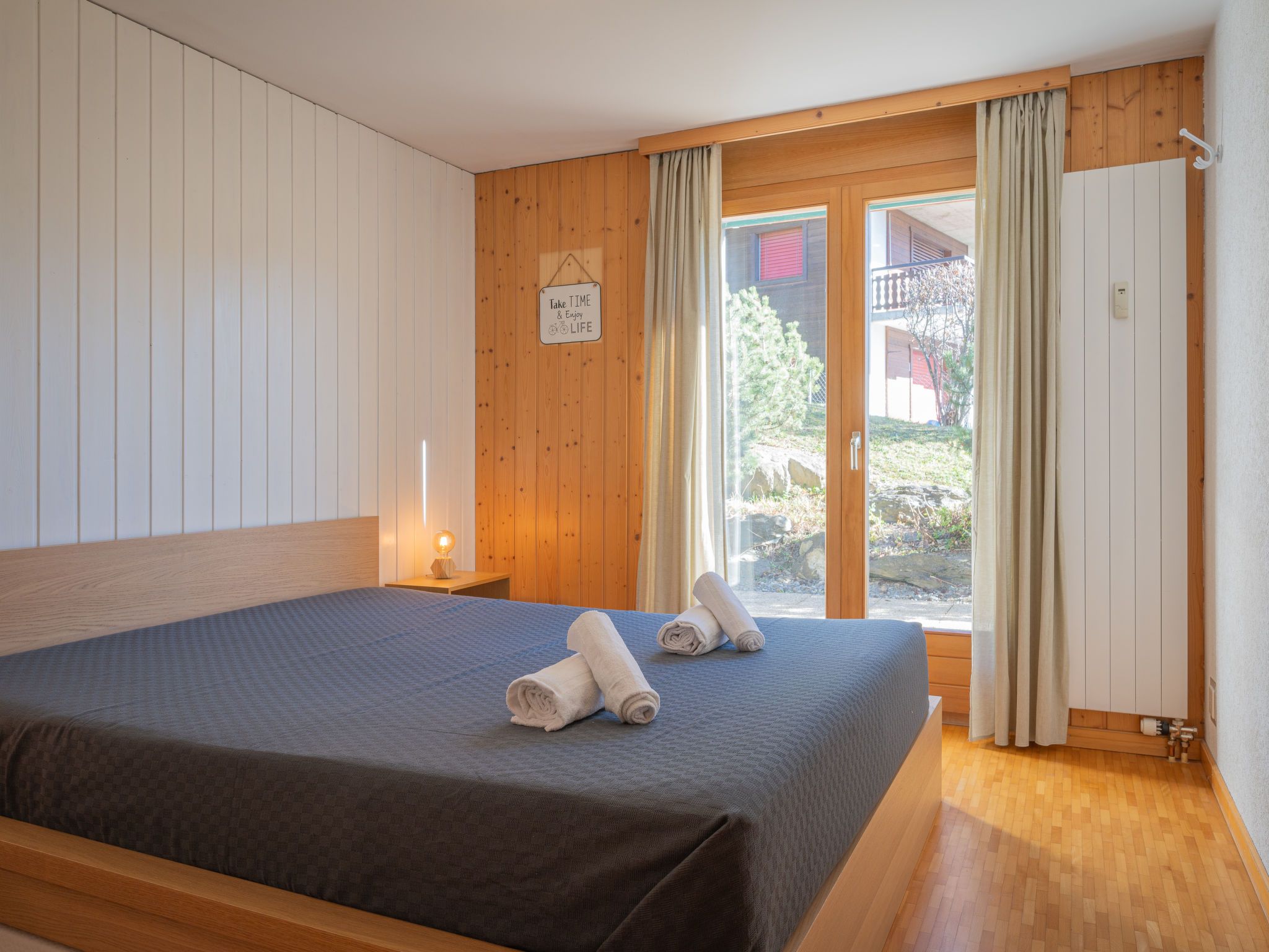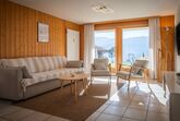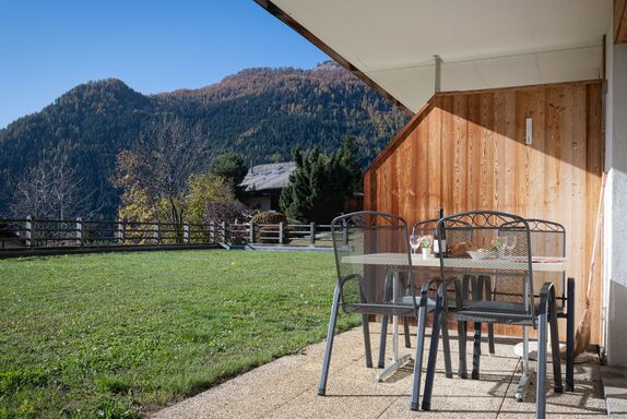 Seya 15, 2-Zimmer-Wohnung 48 m2, im Erdgeschoss, Südlage. Hell, zweckmässig und komfortabel eingerichtet: Eingang. Wohn-/Esszimmer mit 1 Diwanbett (140 cm, Länge 200 cm), Kabel-TV. Ausgang zur Terrasse, Richtung Südosten. 1 Zimmer mit 1 franz. Bett (160 cm, Länge 200 cm). Ausgang zur Terrasse, Richtung Osten. Küche (4 Glaskeramikplatten, Toaster, Wasserkocher, Mikrowelle, elektrische Kaffeemaschine, Kapseln für die Kaffeemaschine (Nespresso) extra, Racletteofen, Fondue Set (Käse)). Bad/WC. Grosse Terrasse 39 m2, Südlage. Balkonmöbel, Liegestühle (2). Schöne Sicht auf die Berge. Zur Verfügung: Haartrockner. Internet (Wireless LAN, gratis). Garage Nr. 15 (1 Auto), Höhe 260 cm, Breite 250 cm. Bitte beachten: Nichtraucher-Unterkunft.