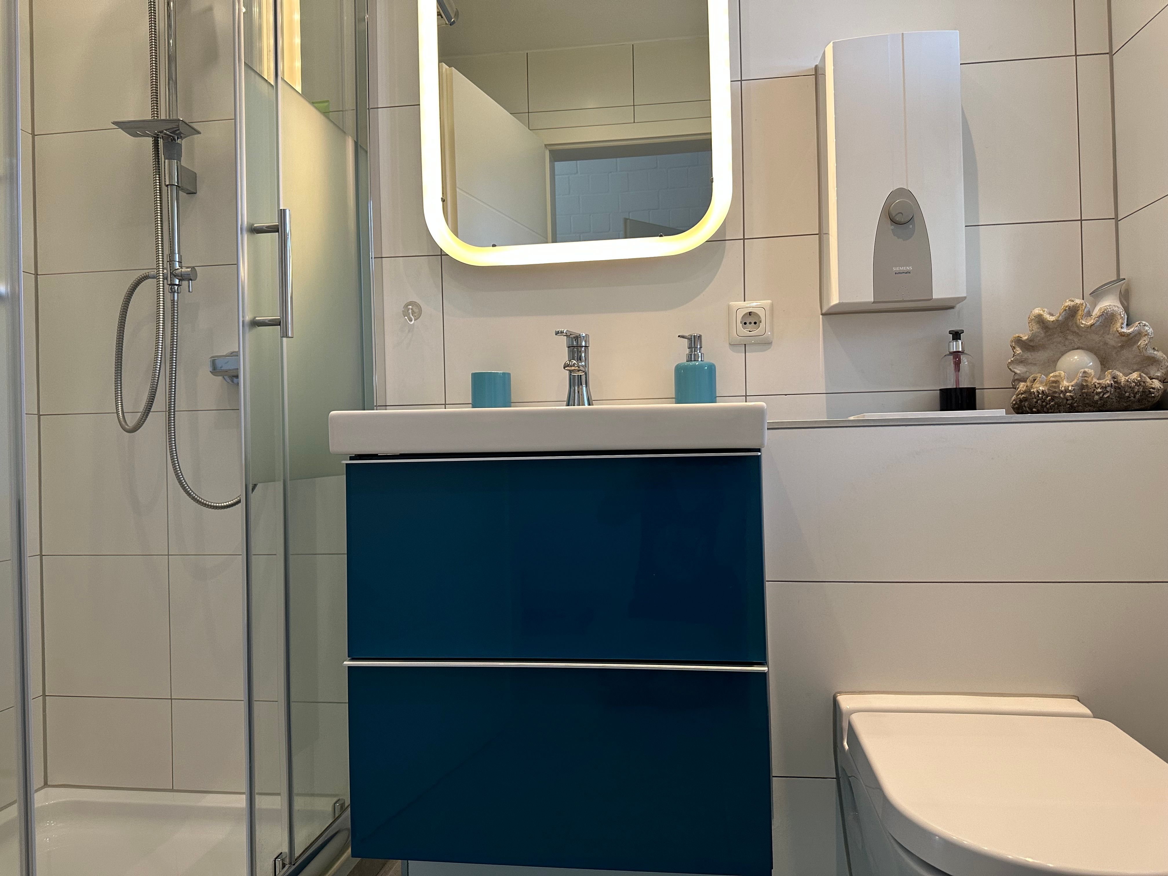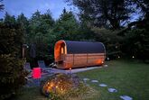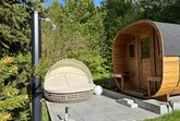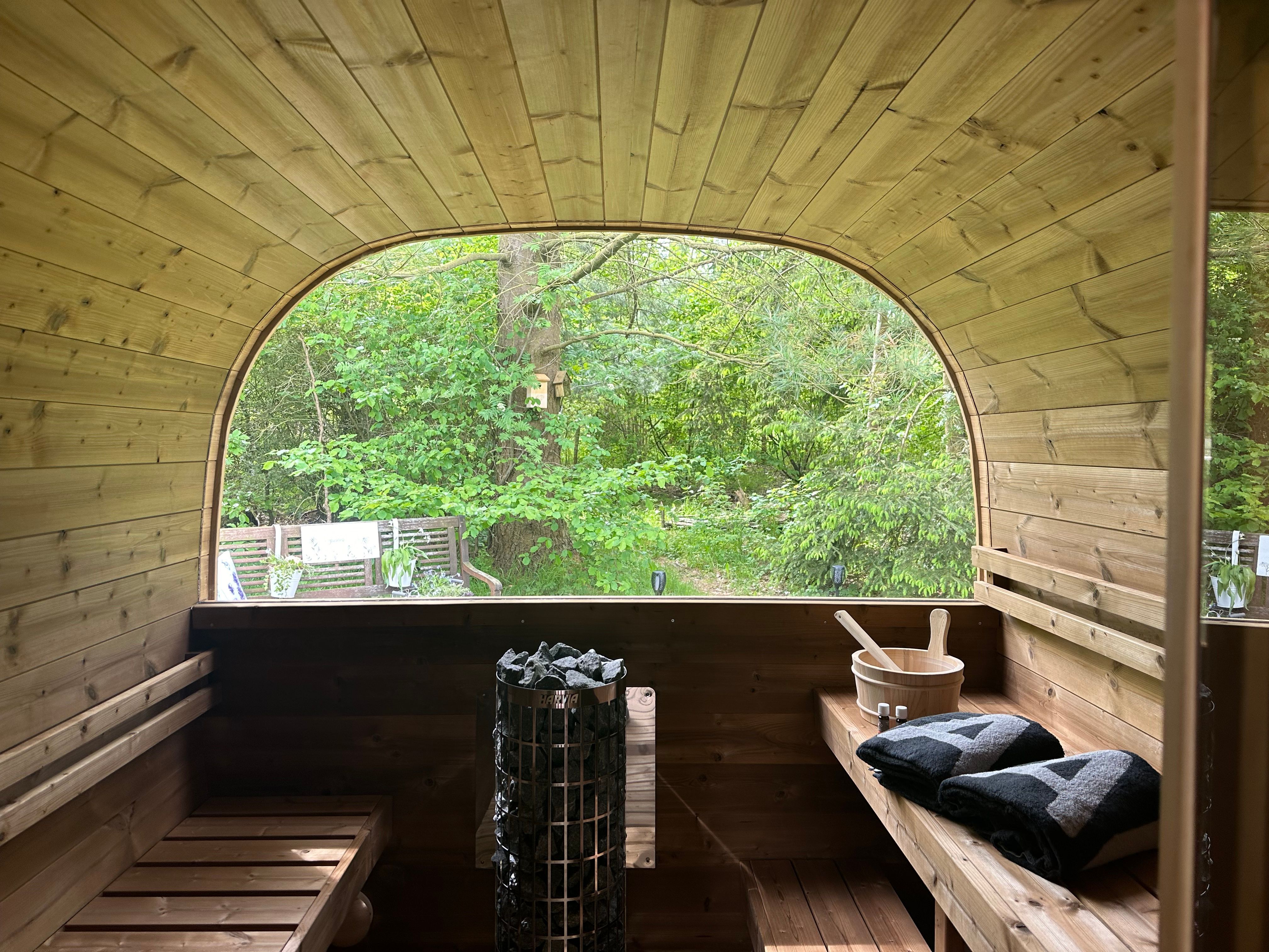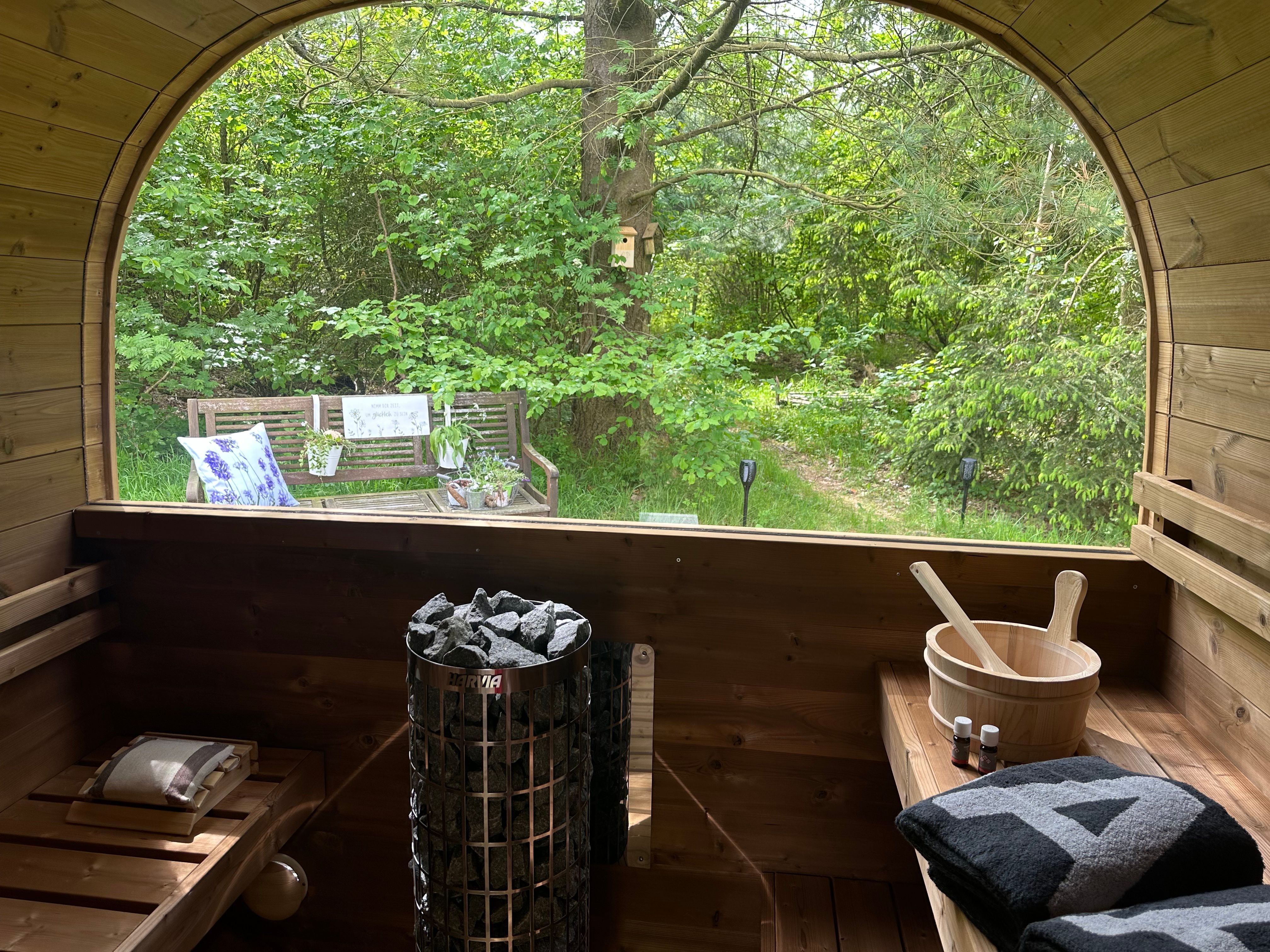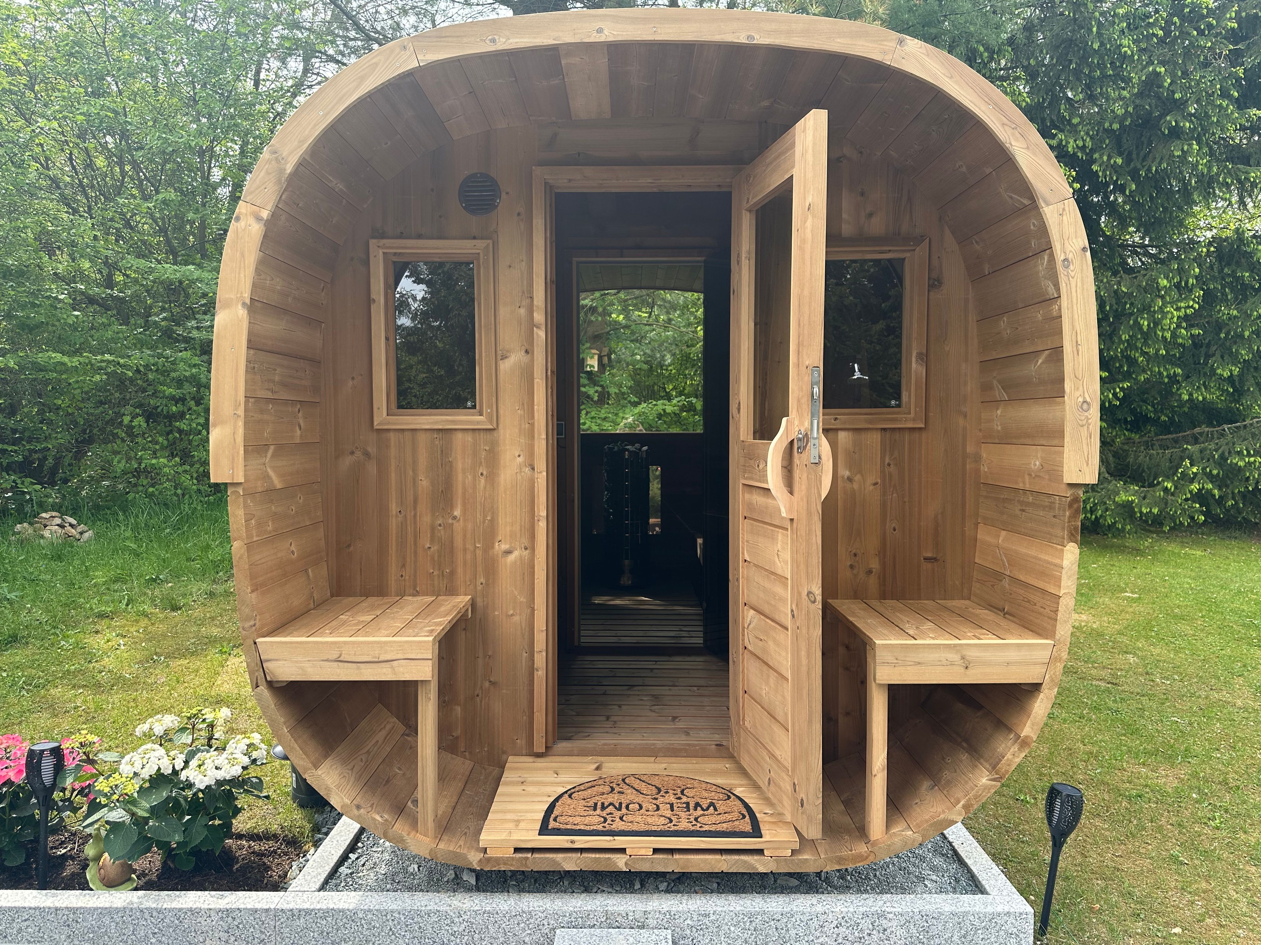 neue Sauna im Außenbereich mit Solardusche, die Solardusche ist nur in frostfreien Zeiten in Betrieb