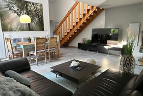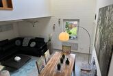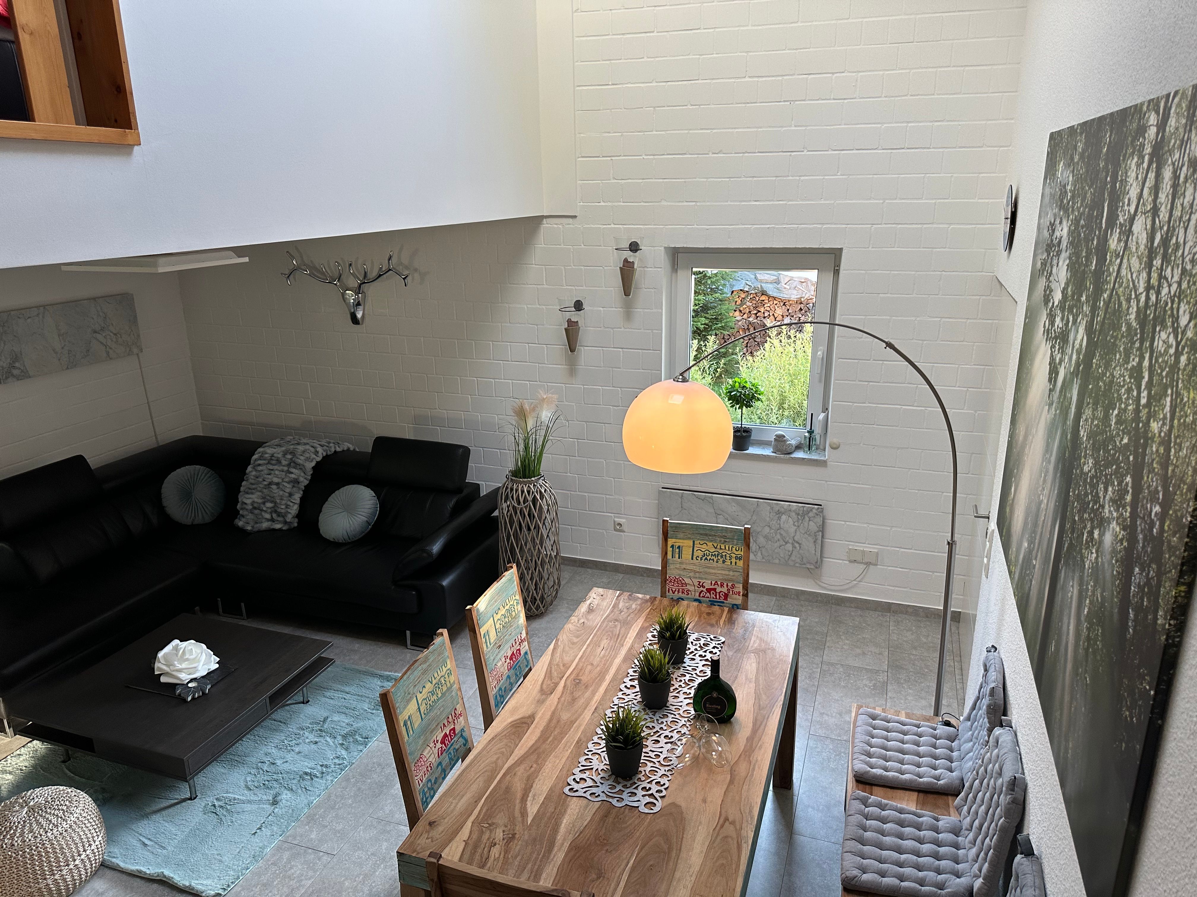 vom Wohnzimmer kommt man über eine Seitentreppe direkt ins Obergeschoss