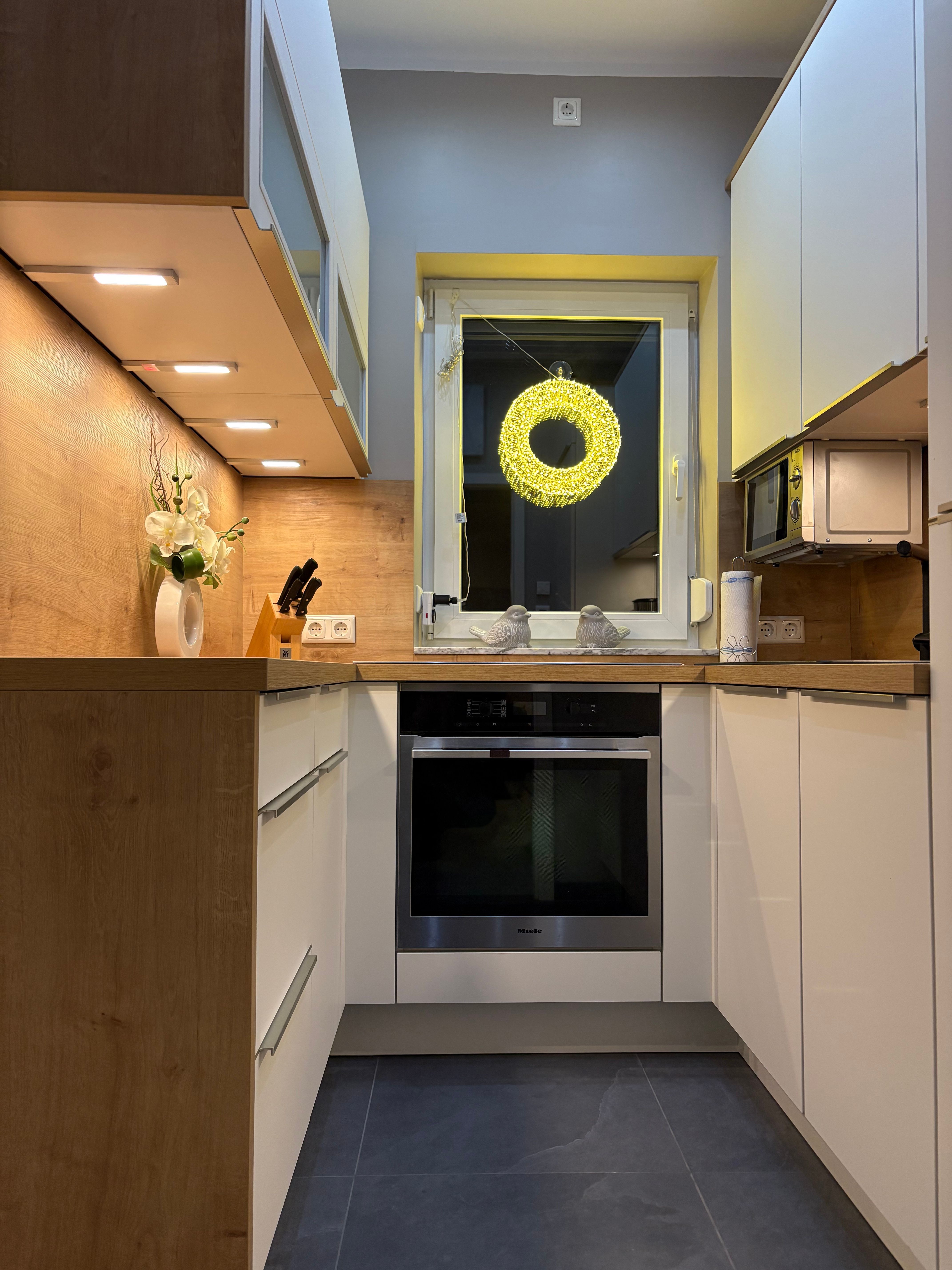 eine schöne neue Küche, Geschirrspüler, Mikrowelle, Kühlschrank, Wasserkocher, Kaffeemaschine