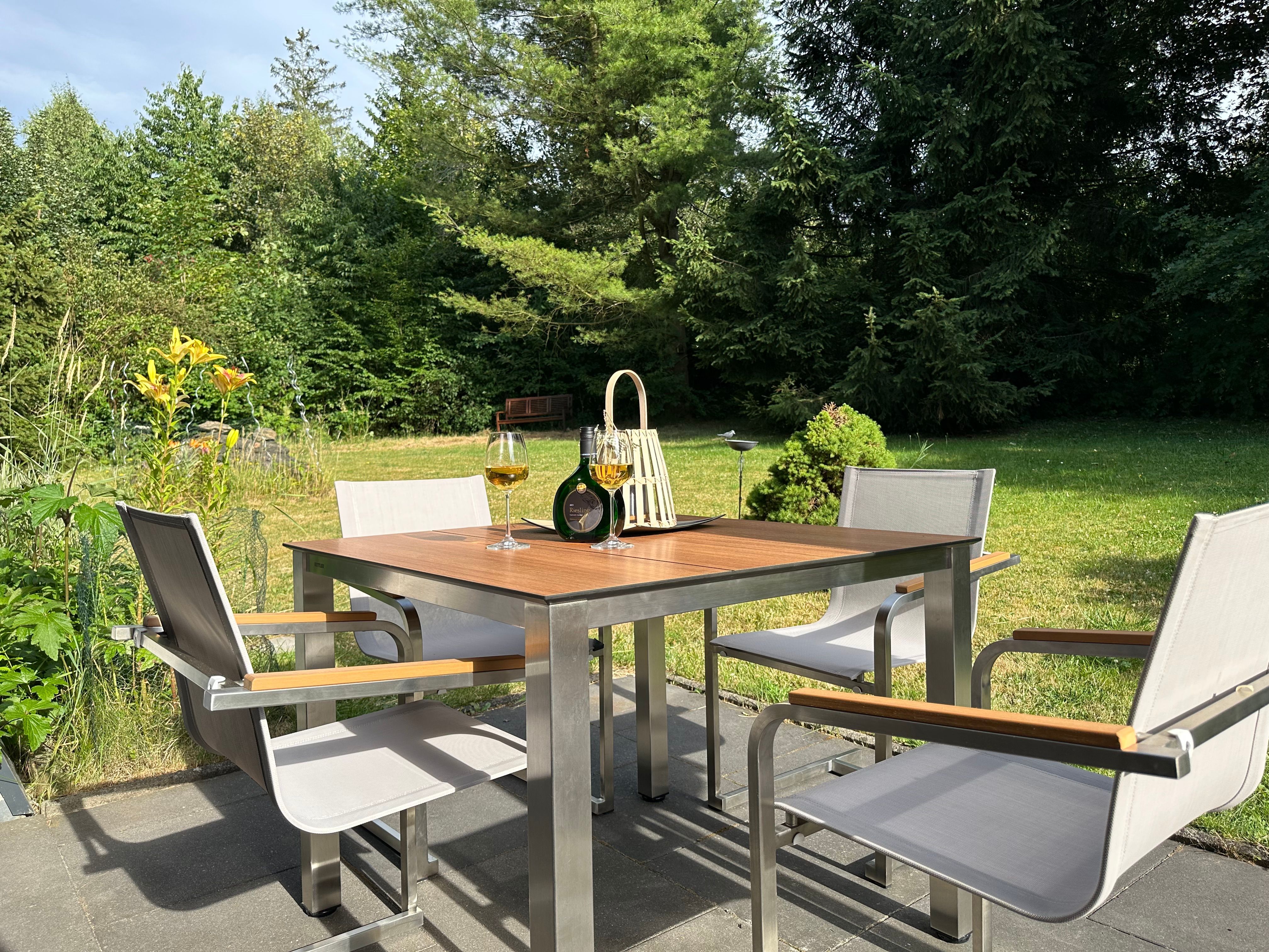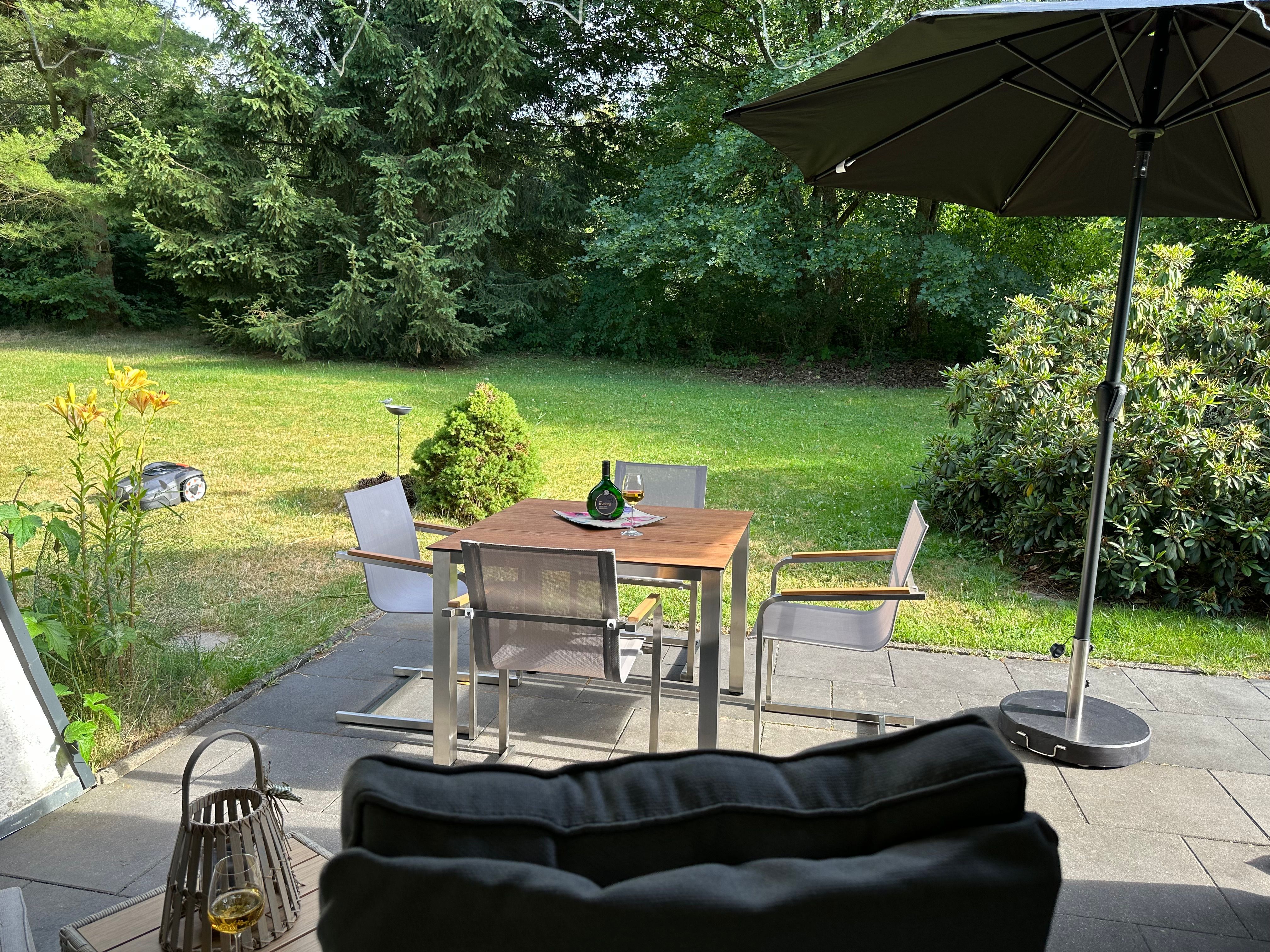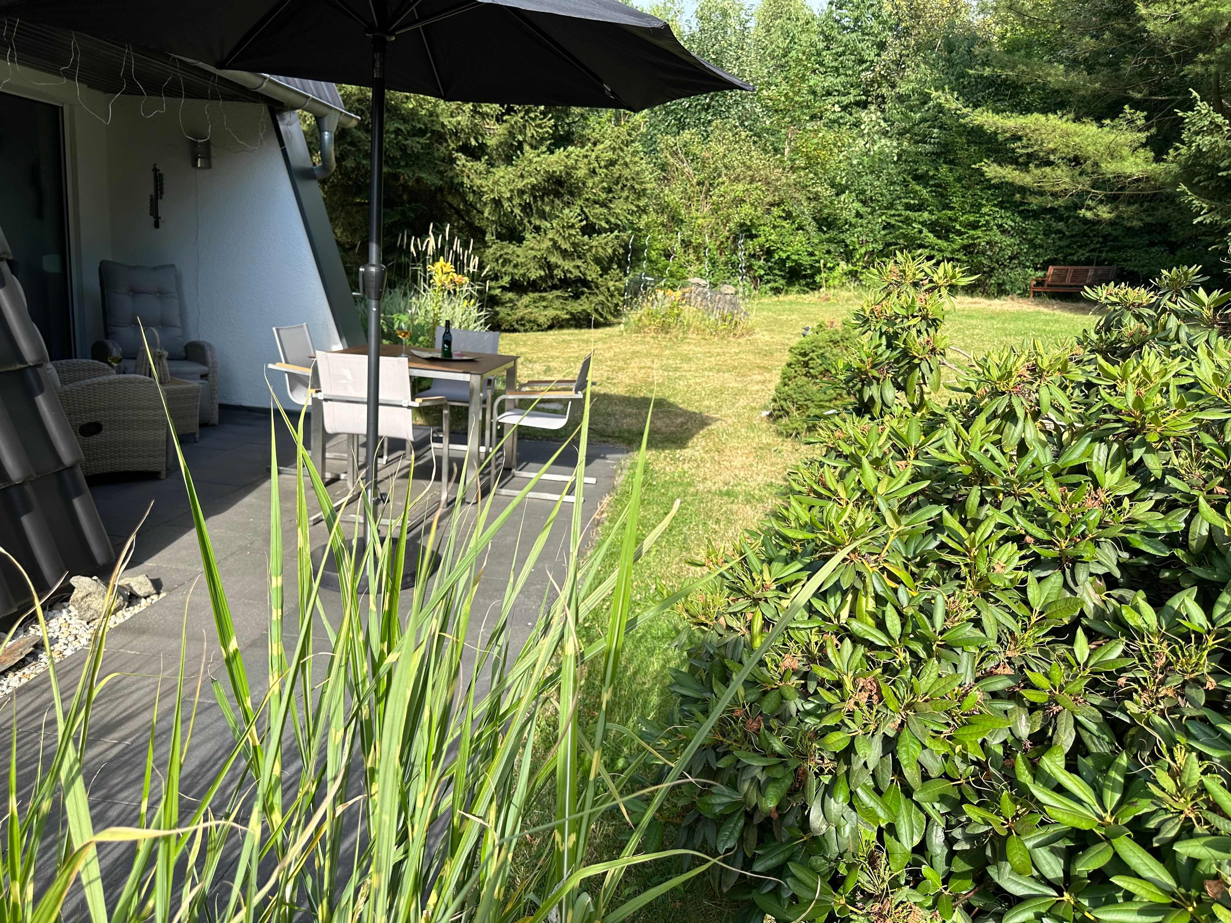 erste Süd-West - Terrasse am Haus, mit bequemen Stühlen und Esstisch, Sonnenschirm, Loungemöbeln mit weicher Auflage