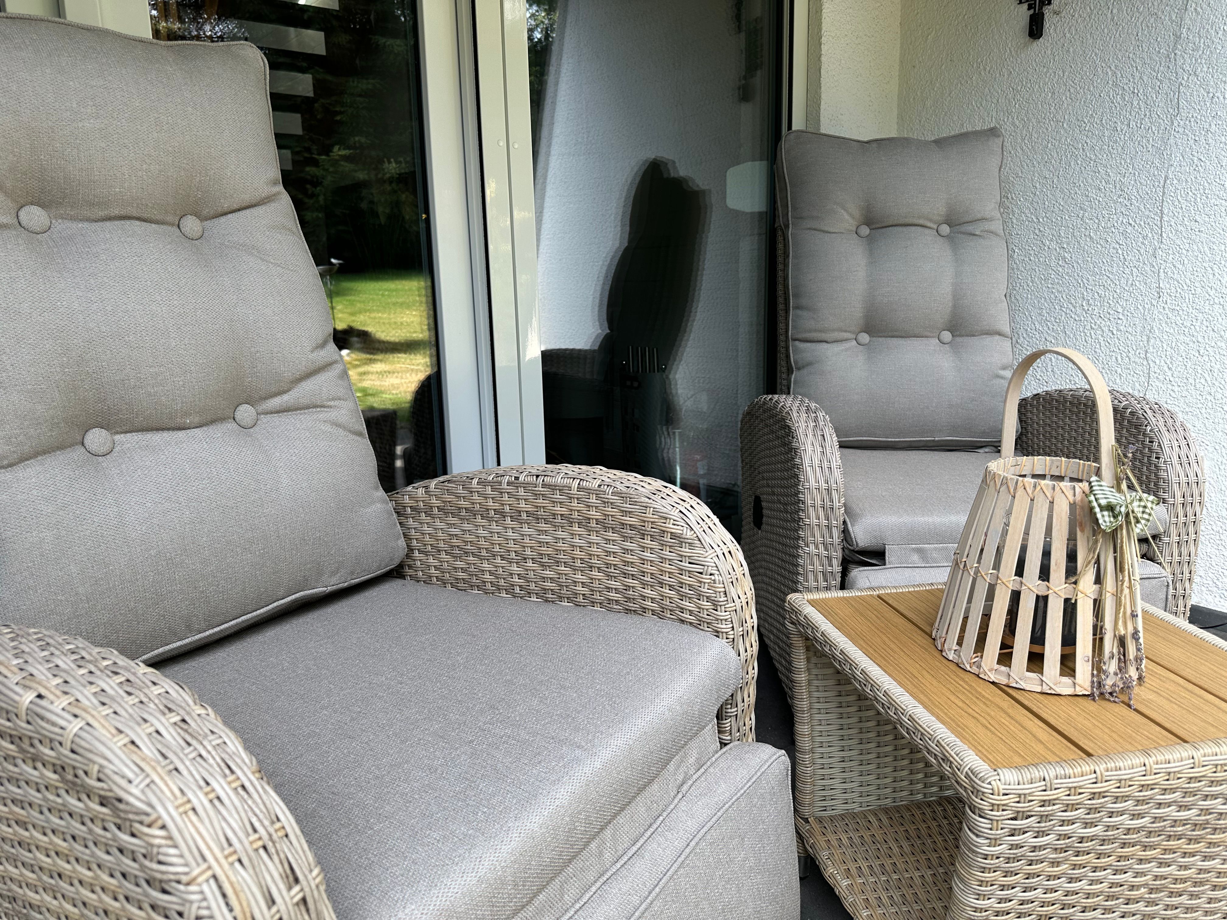 erste Süd-West - Terrasse am Haus, mit bequemen Stühlen und Esstisch,