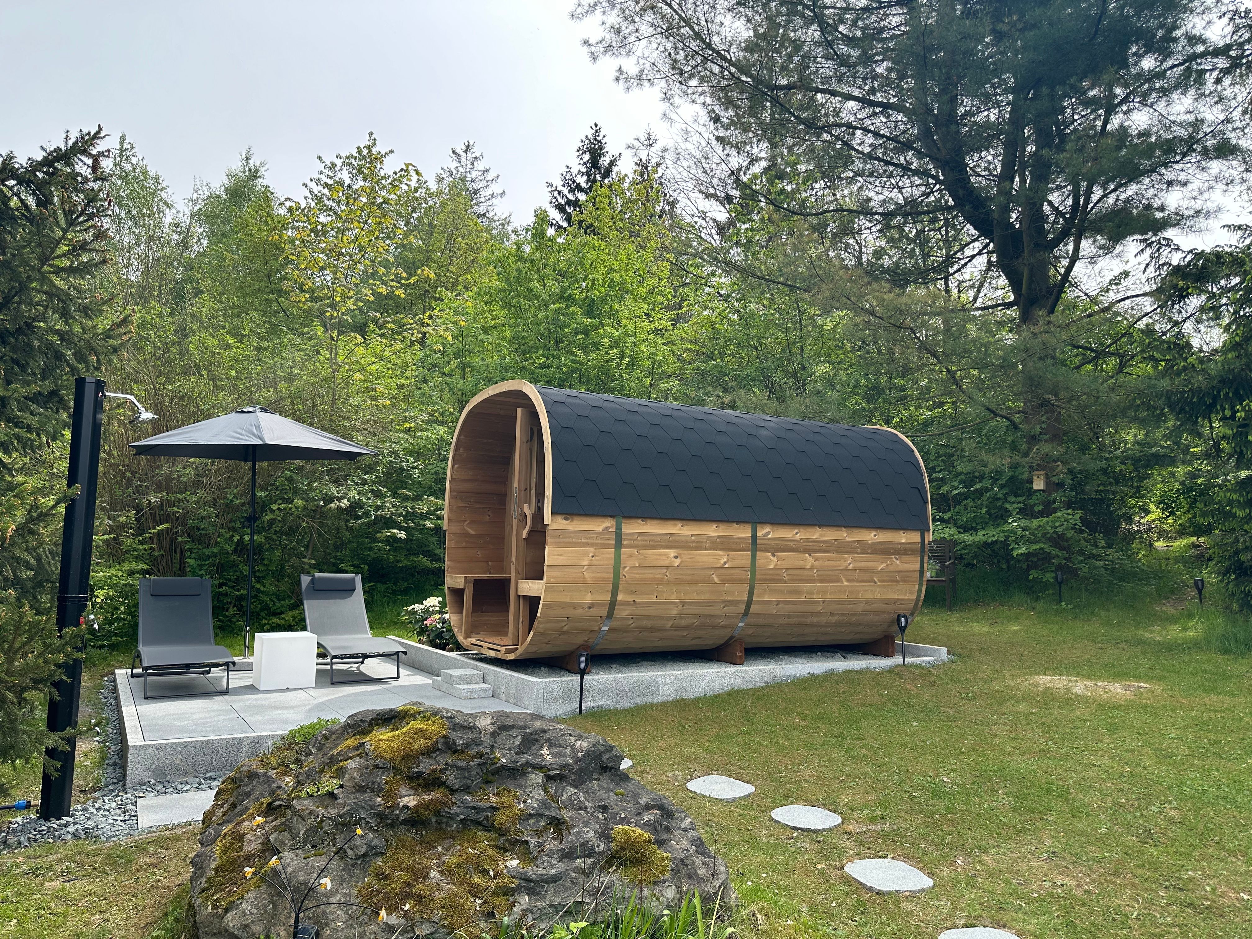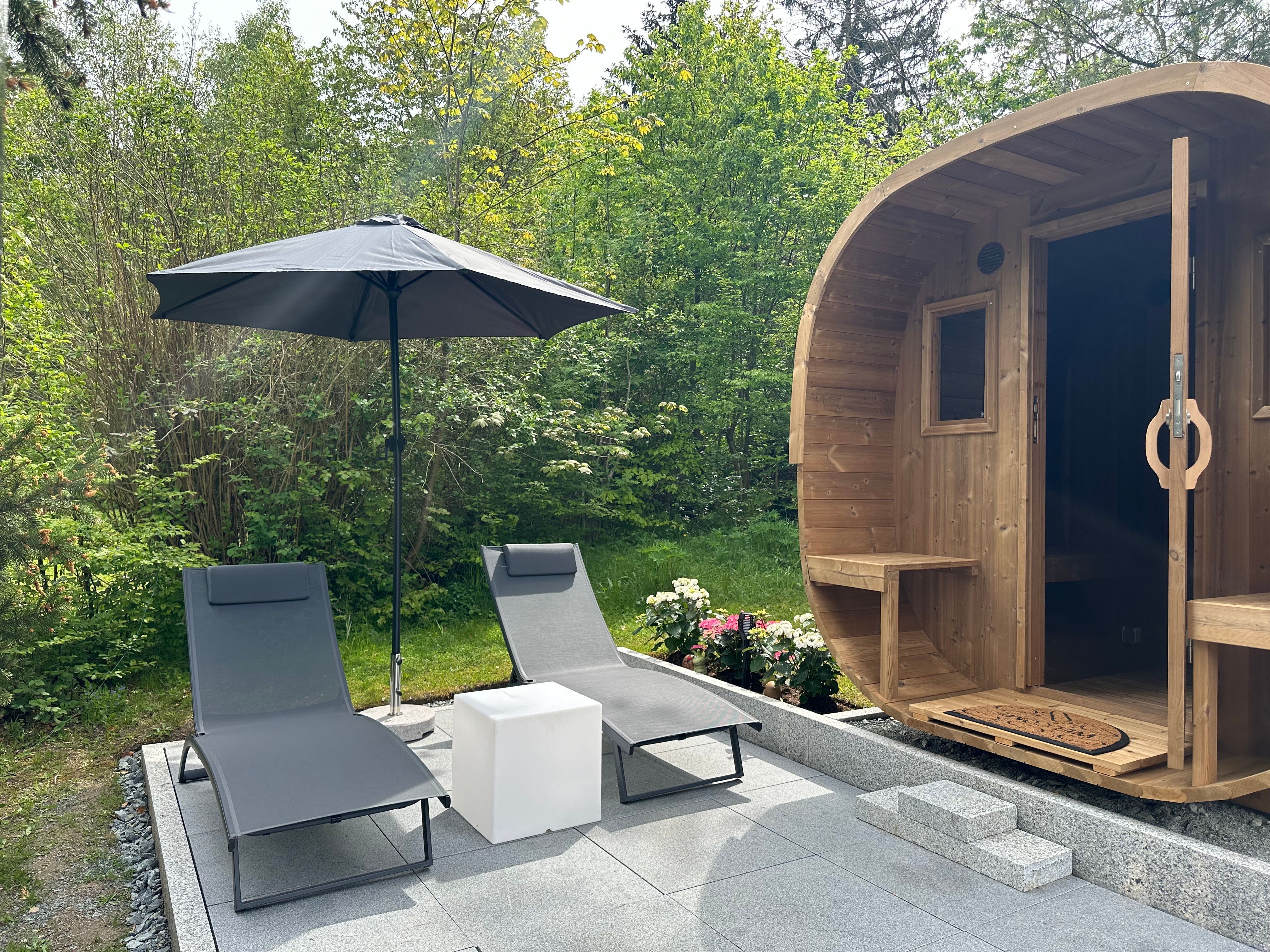 Terrasse an der Sauna mit zwei Sonnenliegen und Sonnenschirm