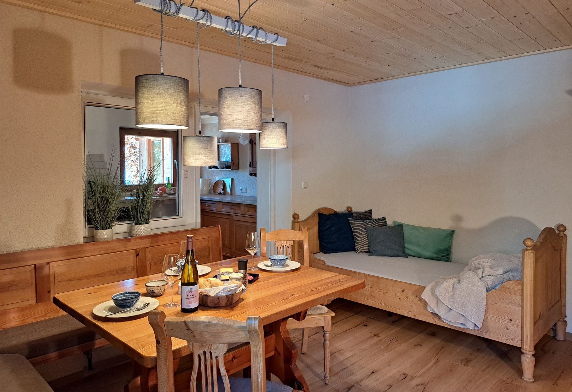 Im Wohn- und Esszimmer könnt ihr es euch an der großen Eckbank gemütlich machen. Das neue Ausziehsofa bietet den Kindern einen kuscheligen Schlafplatz.
