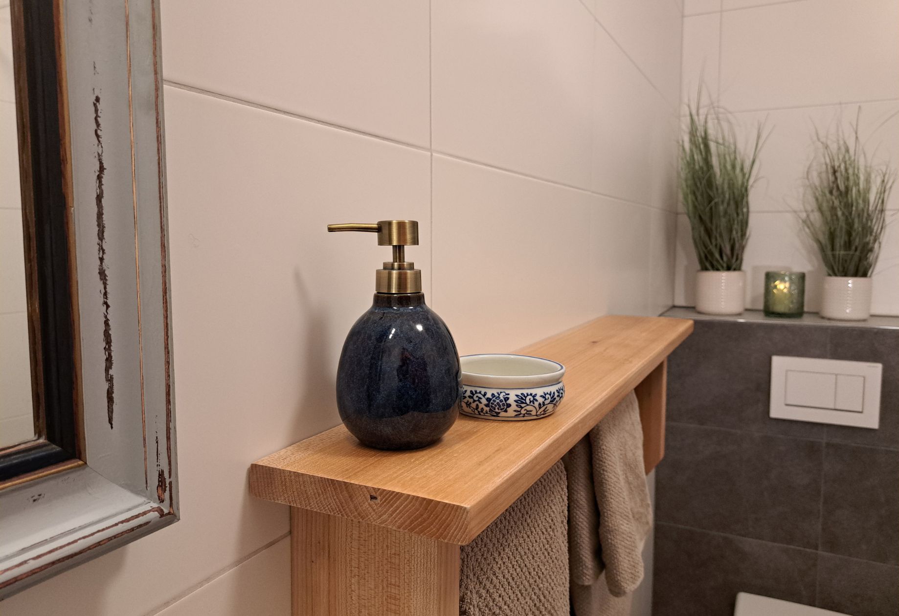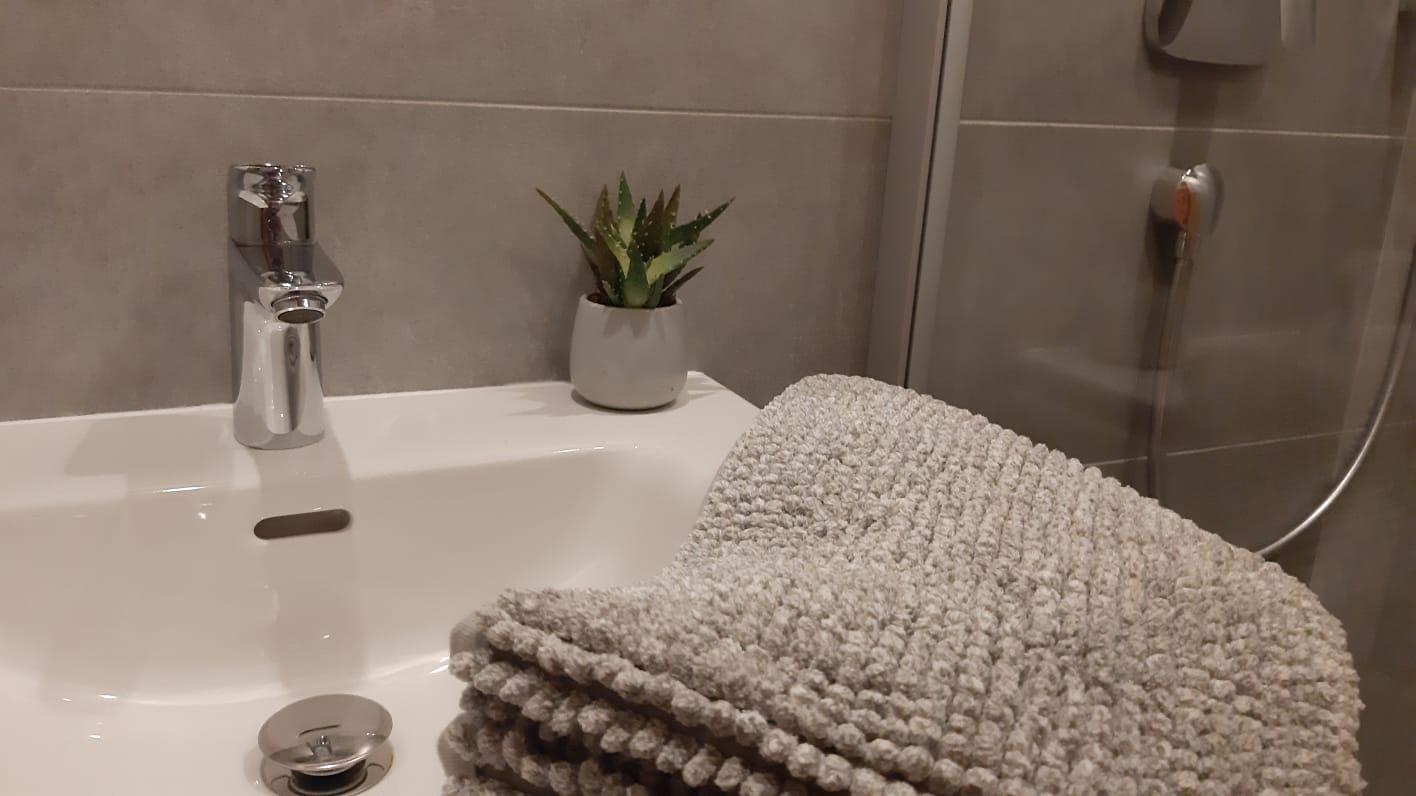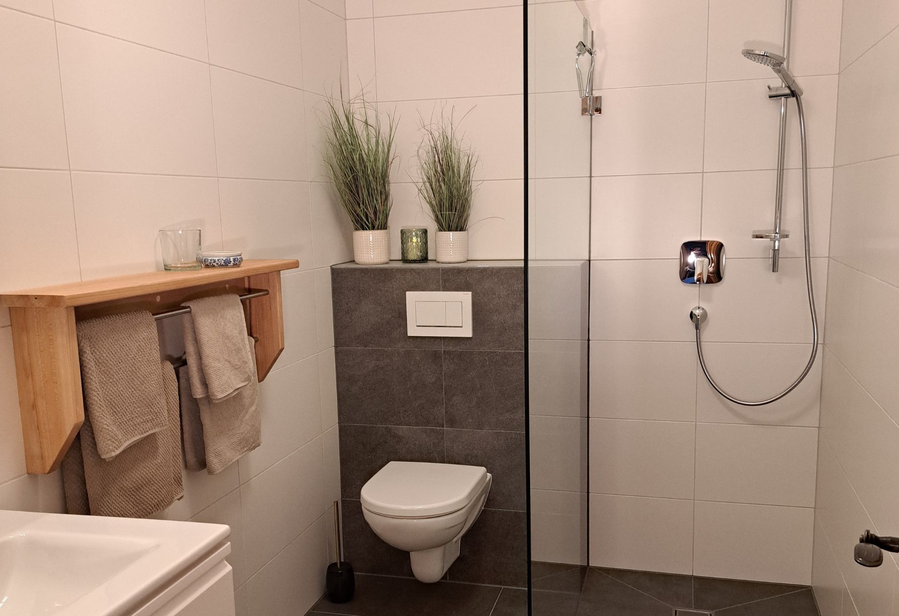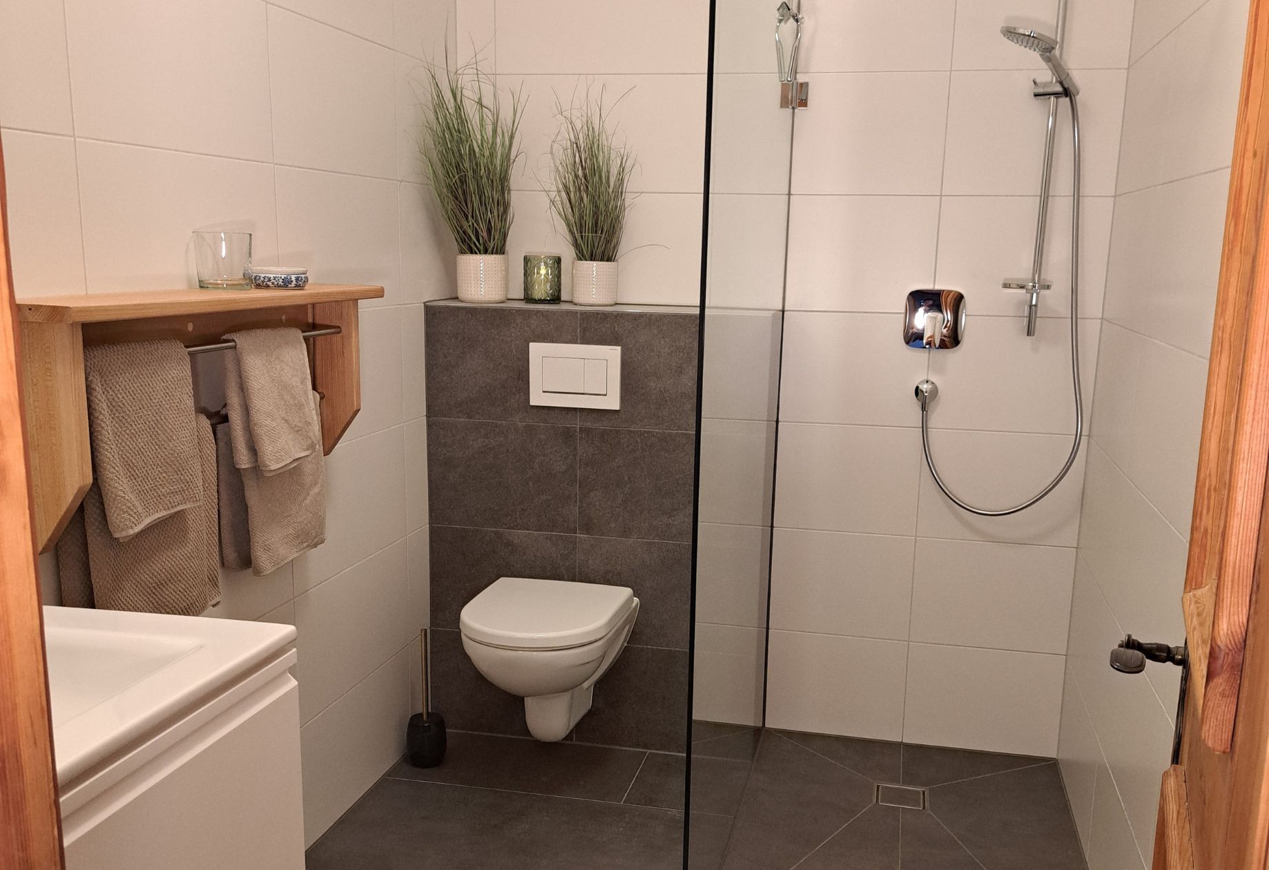 Nebenan geht es ins neue Badezimmer mit großer Dusche und WC.