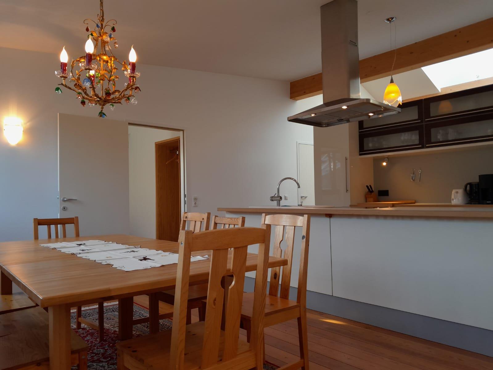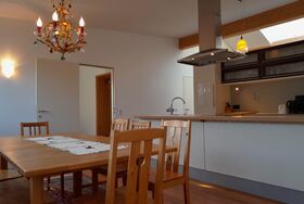 Sehr geräumiges Penthouse-Appartement (140 m²), hell und modern eingerichtet, 3 Schlafzimmer mit Doppelbett (Holz), Wohnraum mit Couchlandschaft mit weiterer Schlafmölgichkeit für 2 Personen, Lärchenholzfußboden, Badezimmer mit Dusche und Wanne, WC separat, hochwertige Küche mit Geschirrspüler, Ceranfeld, Backrohr, Dampfgarer, Dunstabzug, Wasserkocher, Kaffeemaschine, Kühlschrank mit Kühl-Gefrier-Kombination. Eßtisch mit 8 Sitzplätzen, große Terrasse (möbliert) mit Panoramaausblick zur Schmittenhöhe.