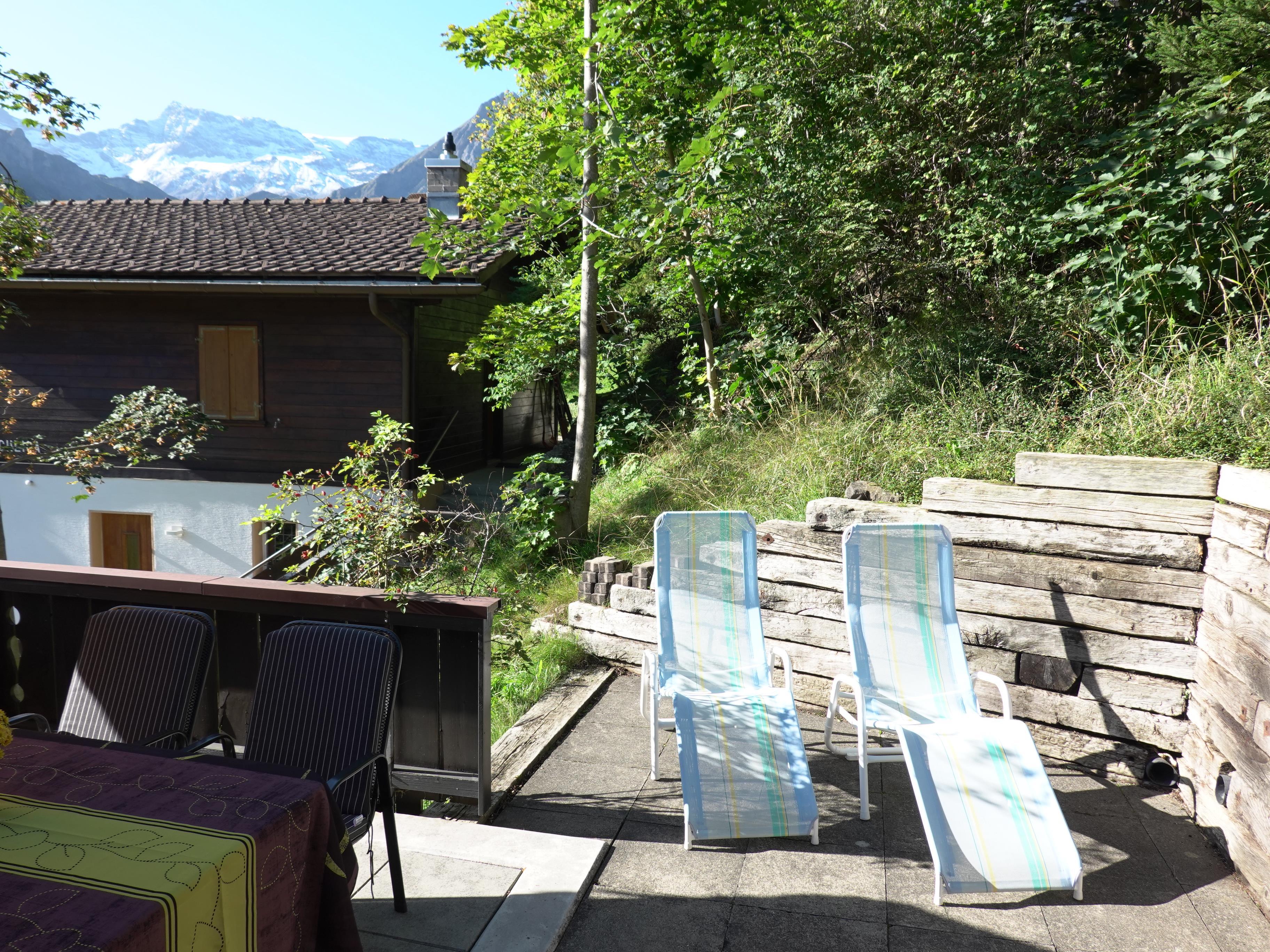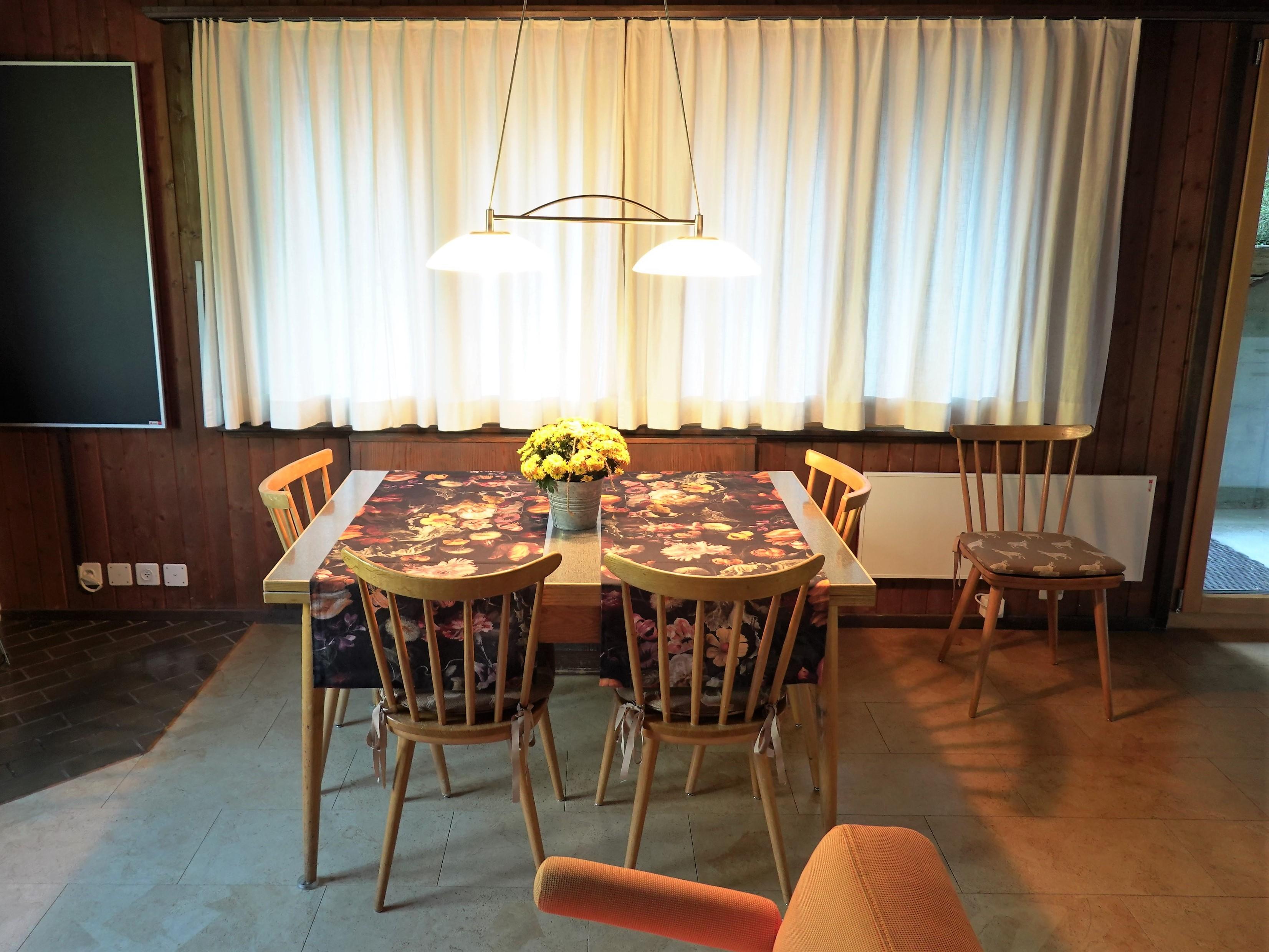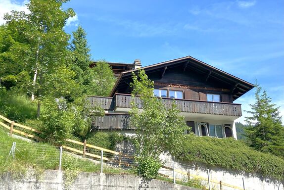 Schöne, sonnige, 3-Zimmer-Wohnung (70 m2), mit Blick auf den Wildstrubel und den Lohner in einem Chalet mit 2 Wohnungen. Parkplatz vorhanden. Wohnzimmer mit Sofa, 4 Fauteuils, Esstisch mit Sitzbank und vier Stühlen und einem Schweden-Holzofen. Offene Küche mit Backofen, kleiner Nespresso Katfeemaschine (Kapseln).