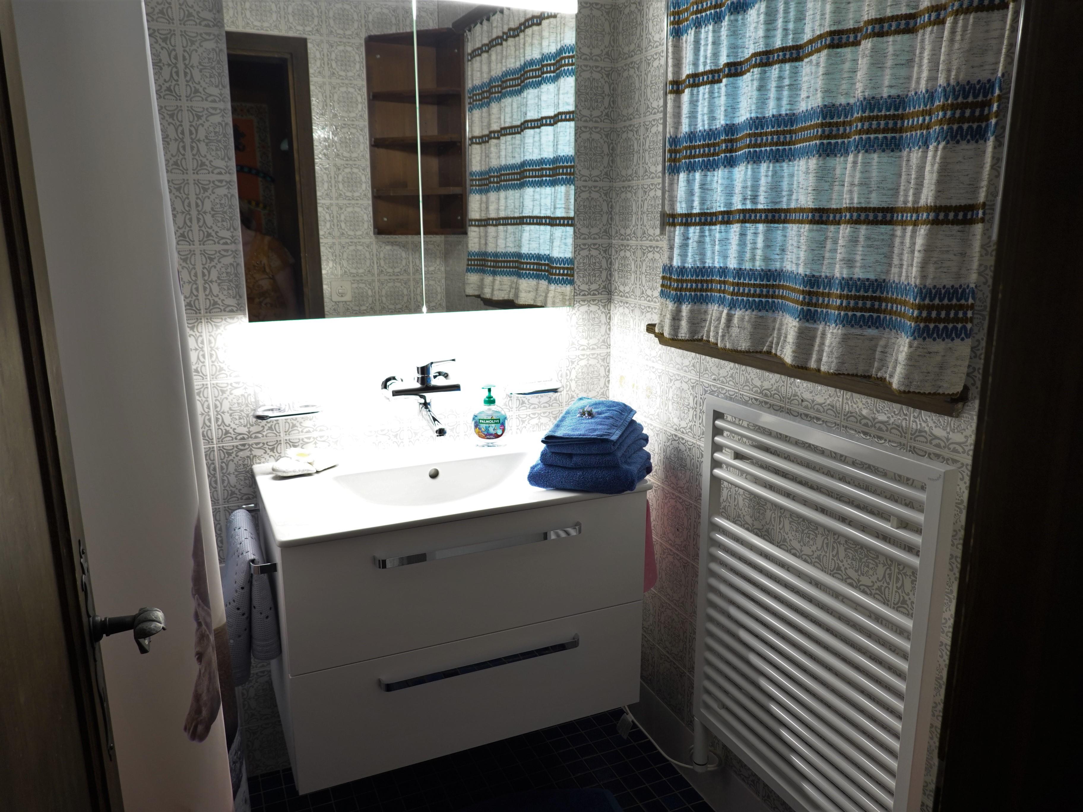 Ein Badezimmer mit Dusche. Balkon und grosse Terrasse mit schöner Bergsicht. Tisch und Stühle Sonnenschirm und Store vorhanden.