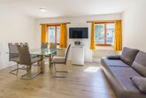 Das gemütliche Wohnzimmer lädt mit einem großen Esstisch für gemeinsame Mahlzeiten und einem bequemen Sofa zum Verweilen ein. Für Unterhaltung sorgen ein Flachbild-TV und kostenloses WLAN, die Ihren Aufenthalt noch angenehmer machen.