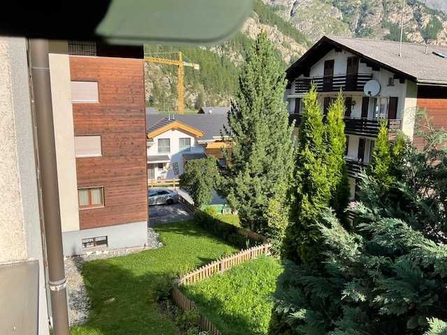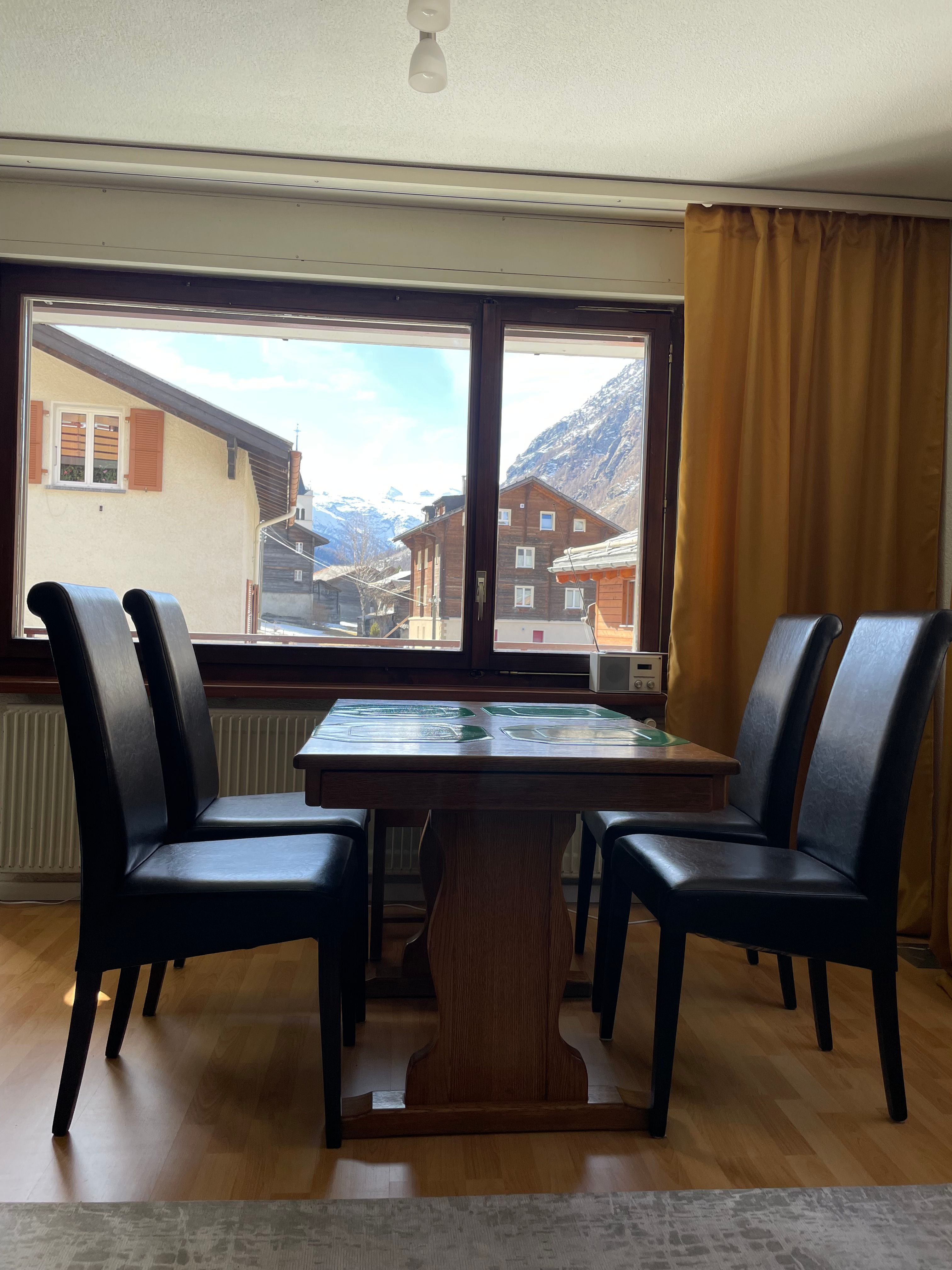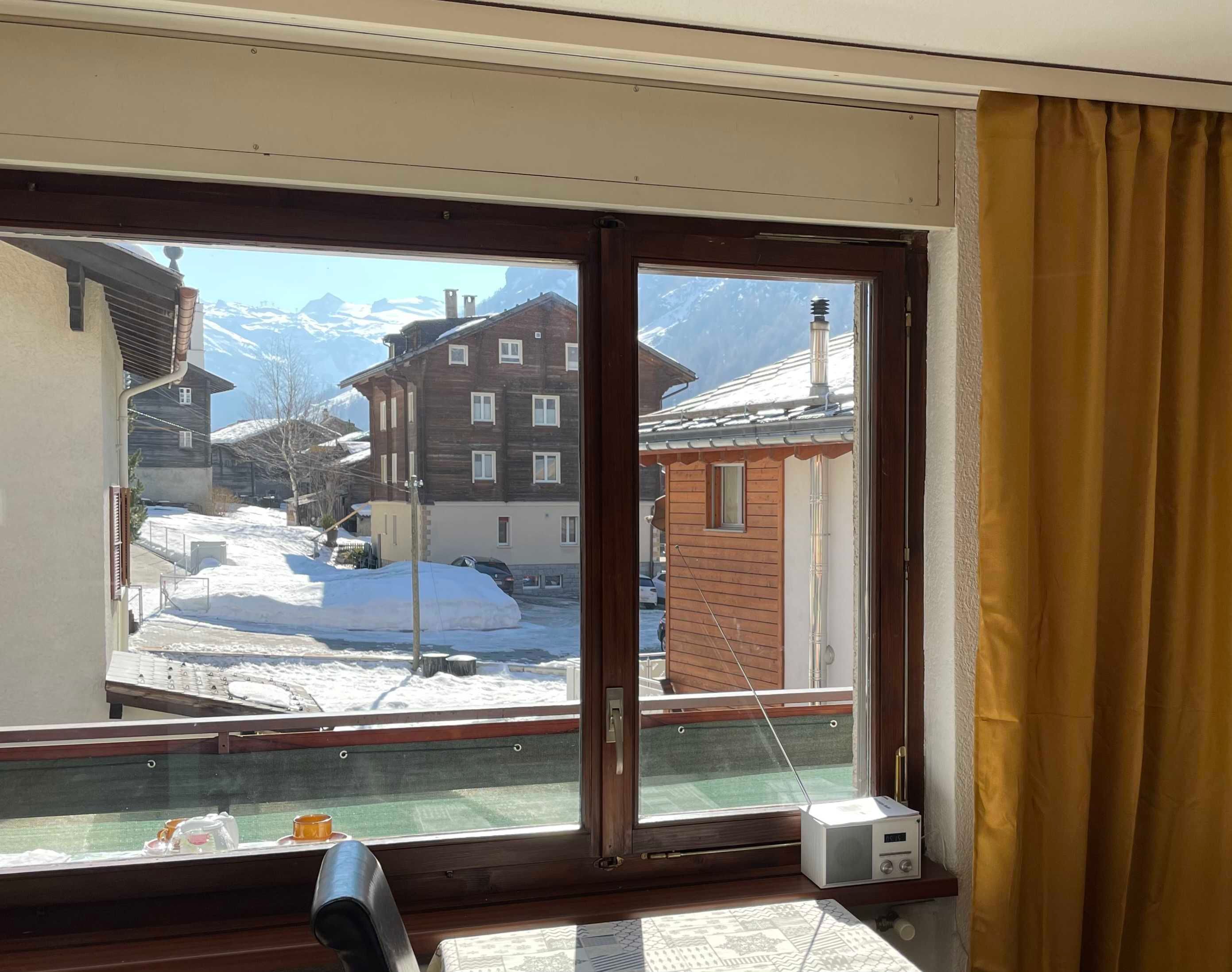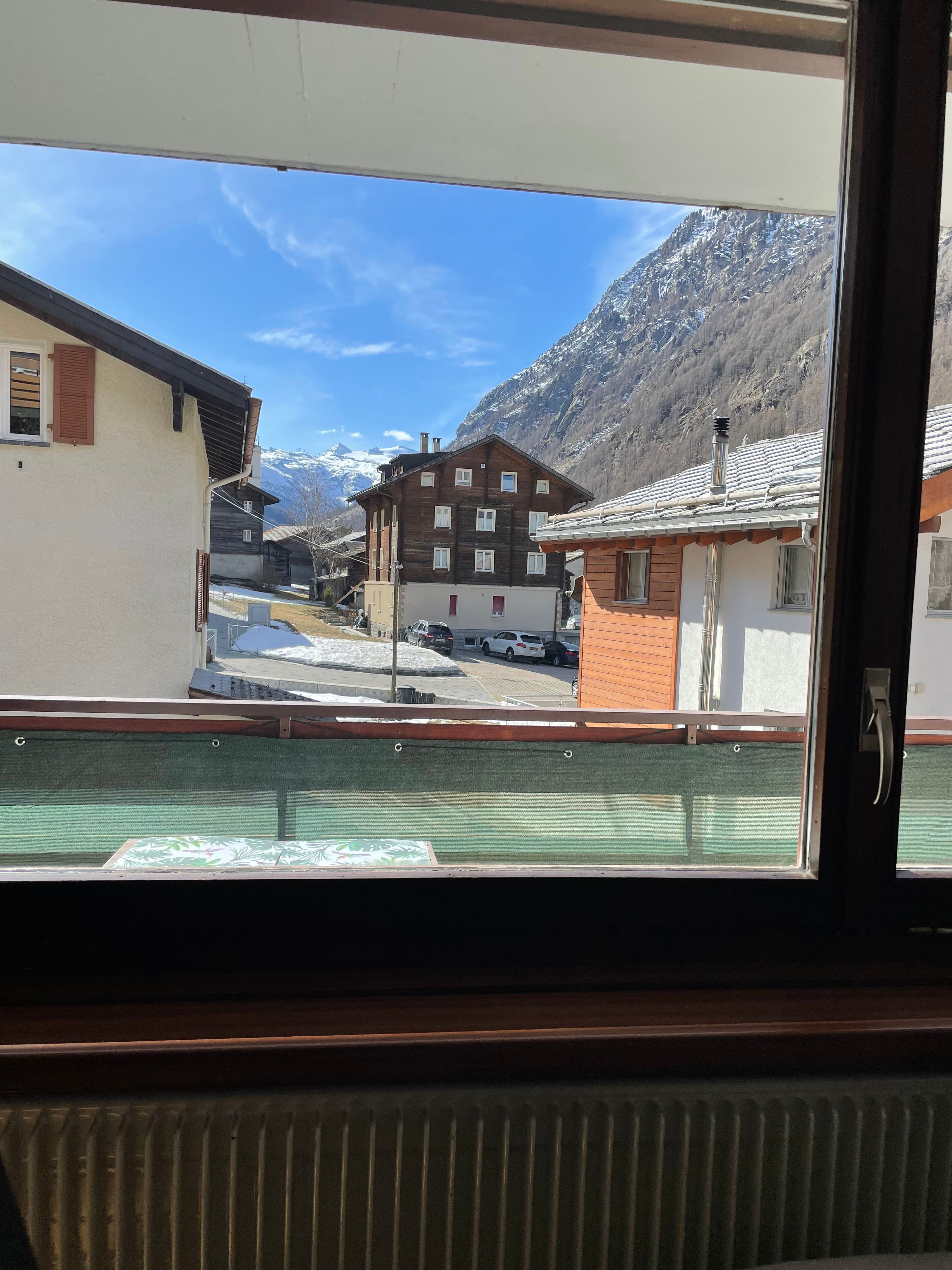 Schöne Zweizimmer-Wohnung im ersten OG im Haus Castor, Südlage mit 56 m2. Schlafzimmer mit Sicht auf die Berge, Wohnzimmer, Wannenbad mit Fenster, separate voll eingerichtete Küche, Flur und Balkon mit Blick auf Klein-Matterhorn und Theodulgletscher.