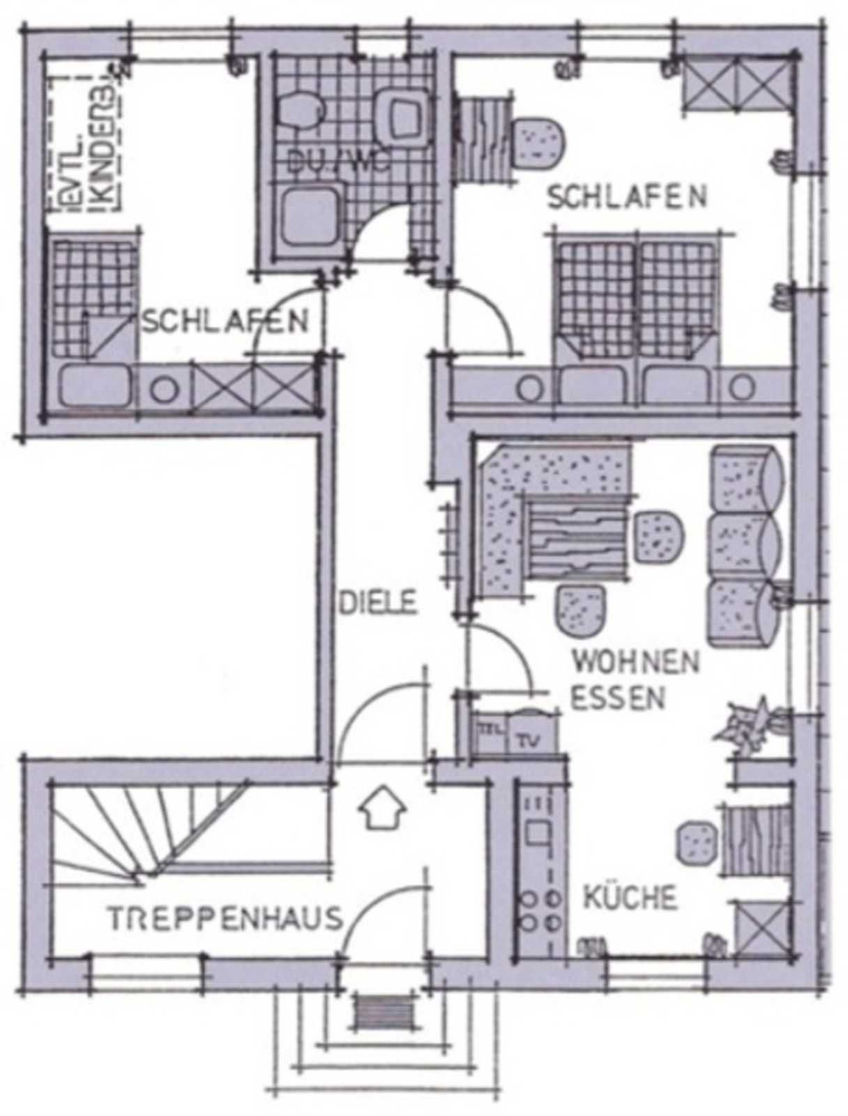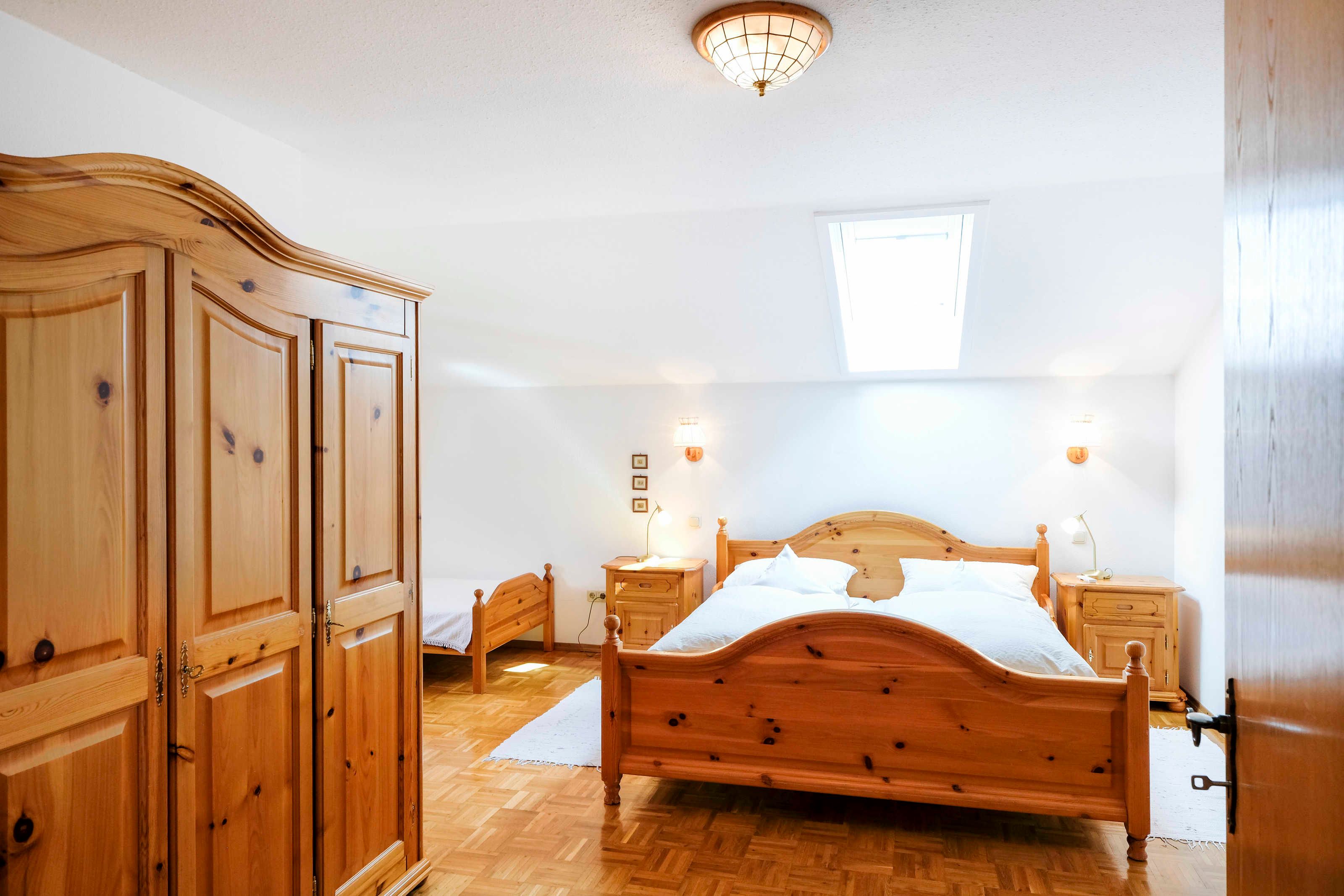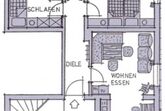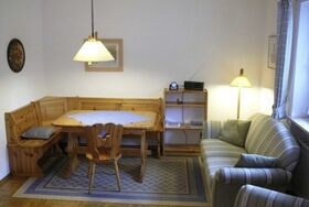 Wohnung mit zwei getrennten Schlafzimmern. Wohnküche mit Eckbank, Couch und Sessel.