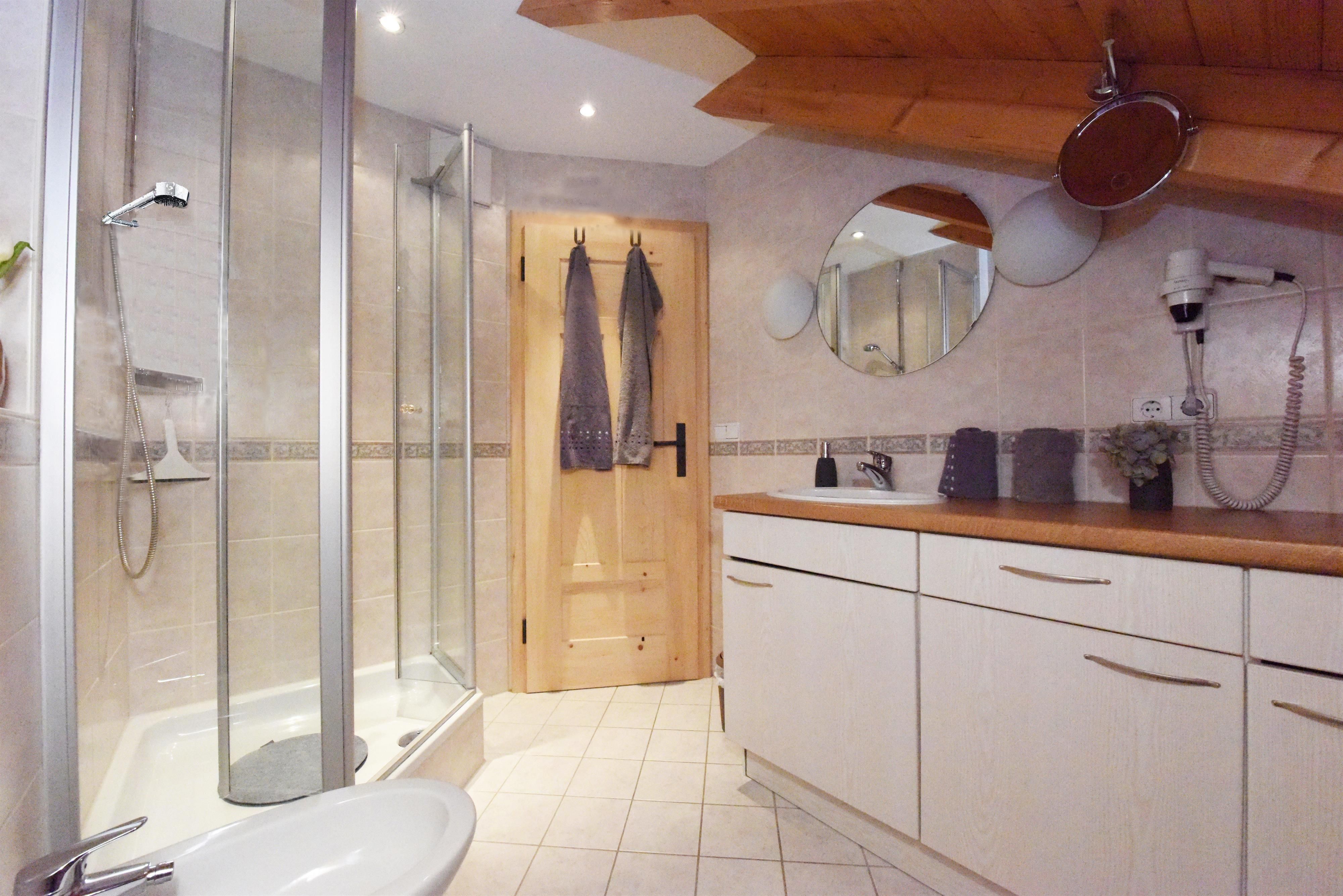 Die Ferienwohnung (renoviert 2021) liegt im 1. Stock und verfügt über zwei Balkone (Ost- und Südbalkon) mit Blick auf unseren Garten und die umliegenden Berge.
