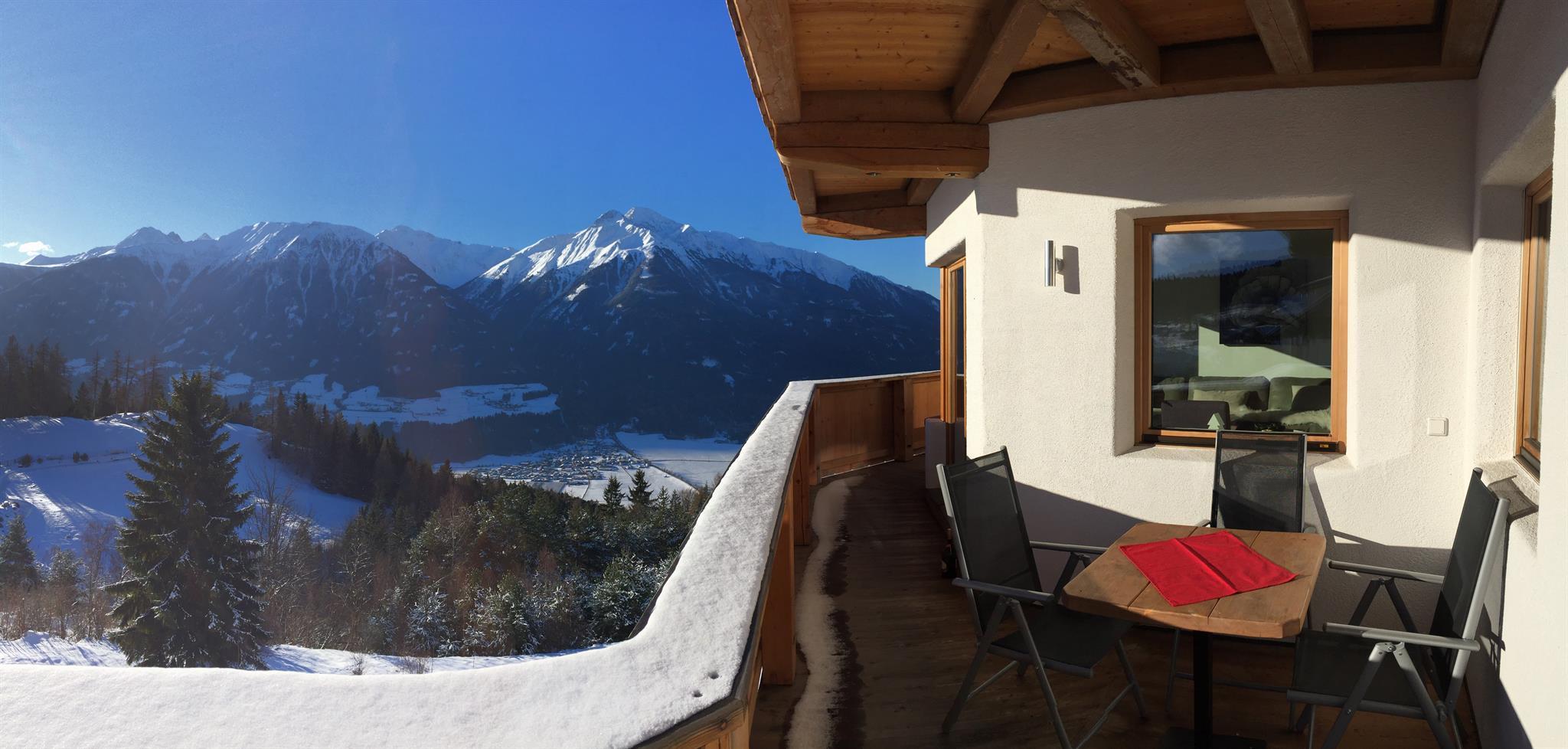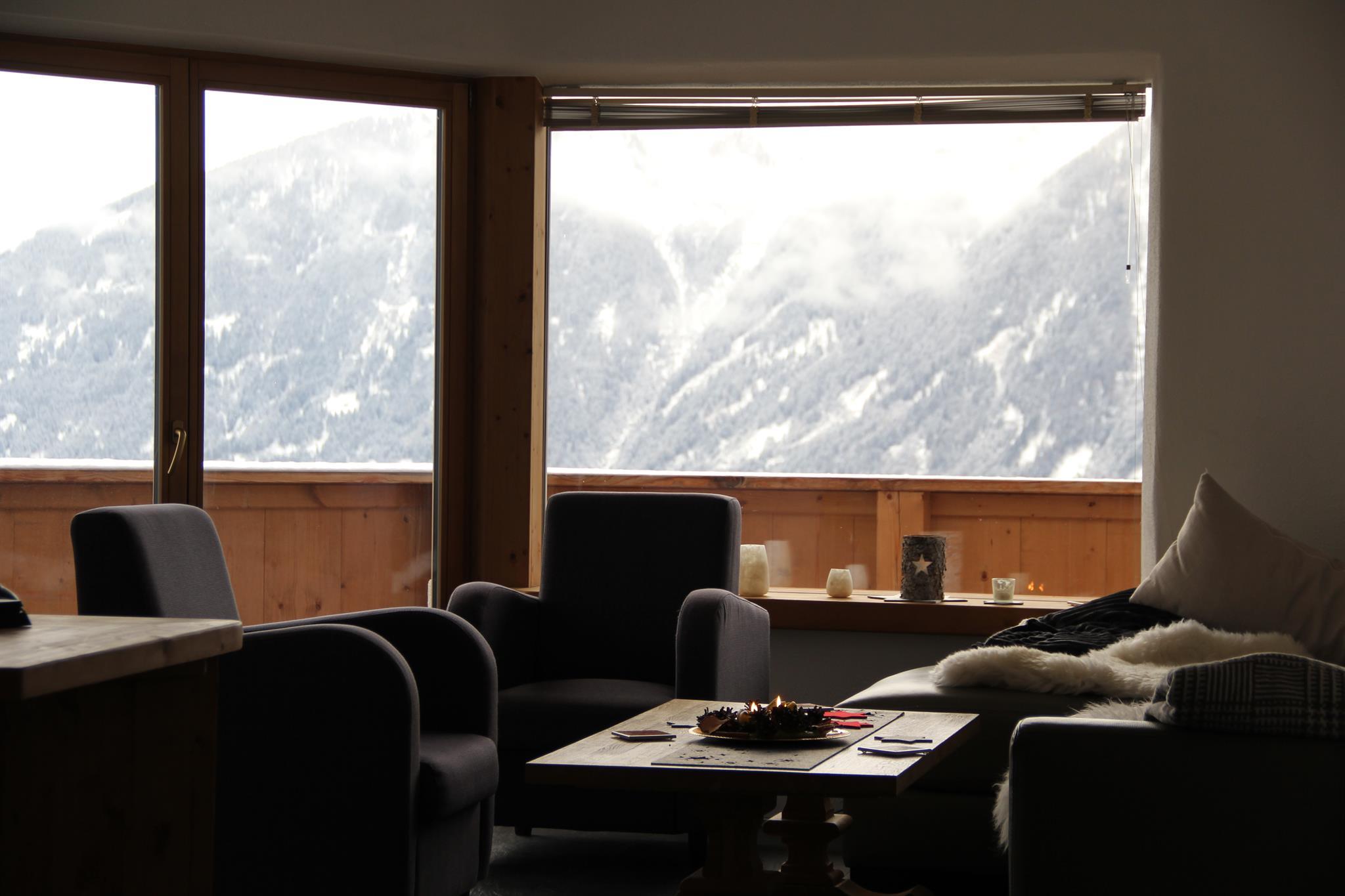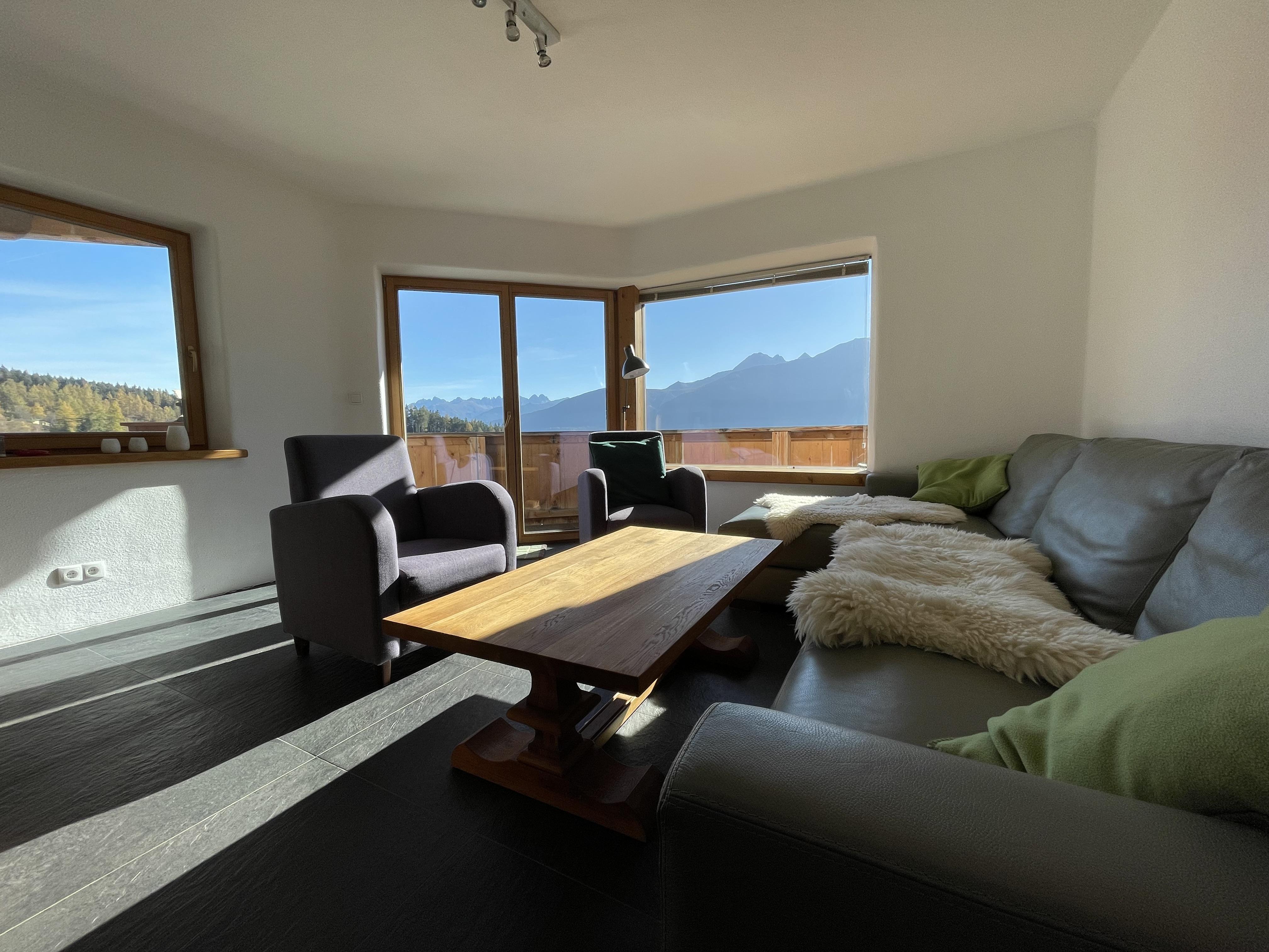 Das 96 m² große moderne Appartement Riepenwand befindet sich in der Residenz Berghof in Mösern mit atemberaubender Aussicht auf die Berge und das 600 Meter niedriger gelegene Inntal.