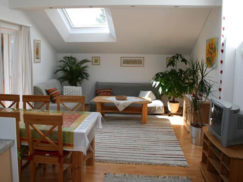 Die Ferienwohnung (75m2) mit zwei Schlafzimmern, Badezimmer, kombiniertem Wohn-Esszimmer, Kochnische, Balkon bietet auch für Familien ausreichend Platz.