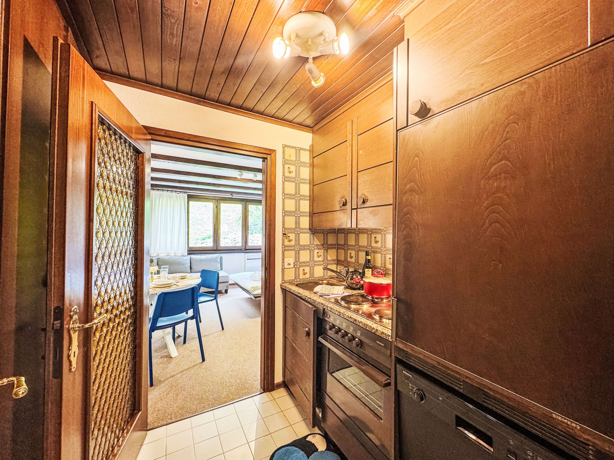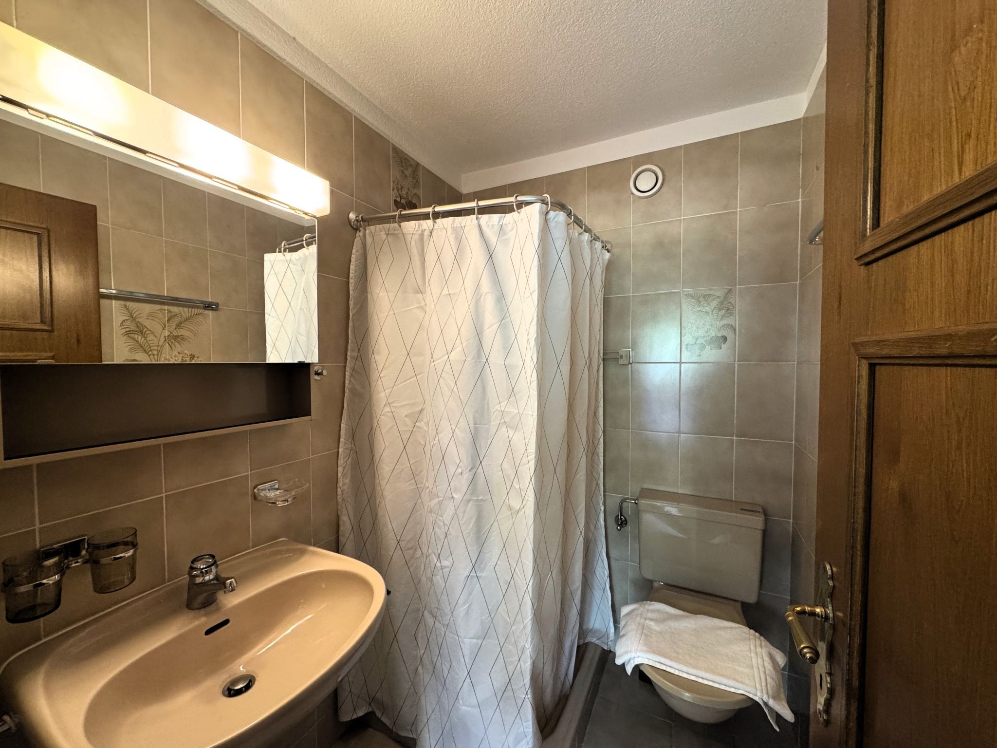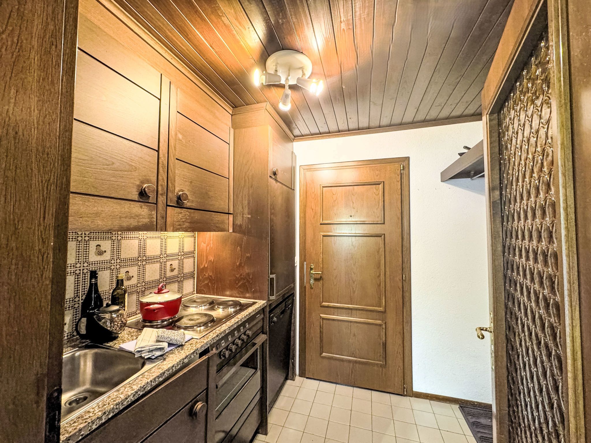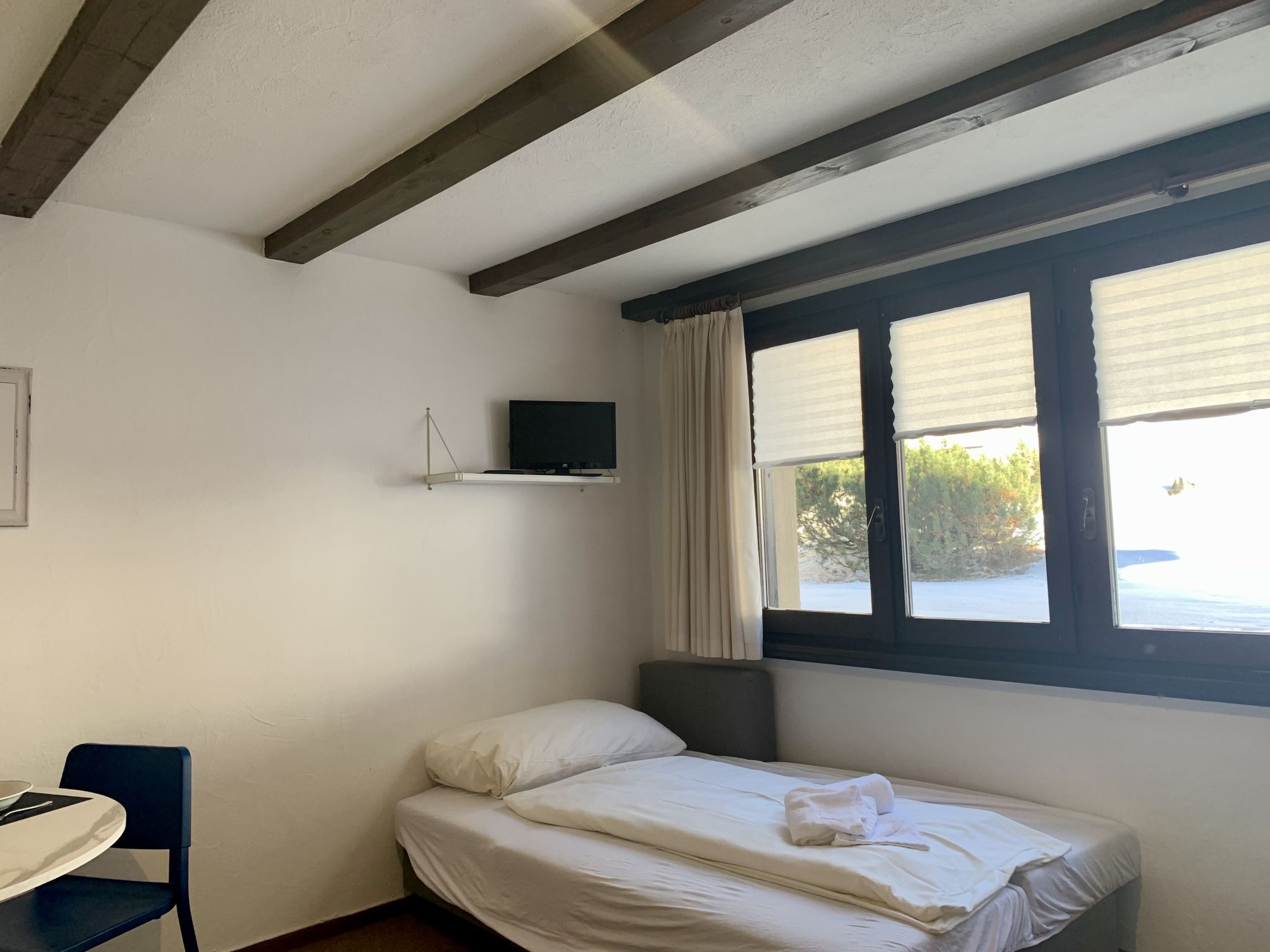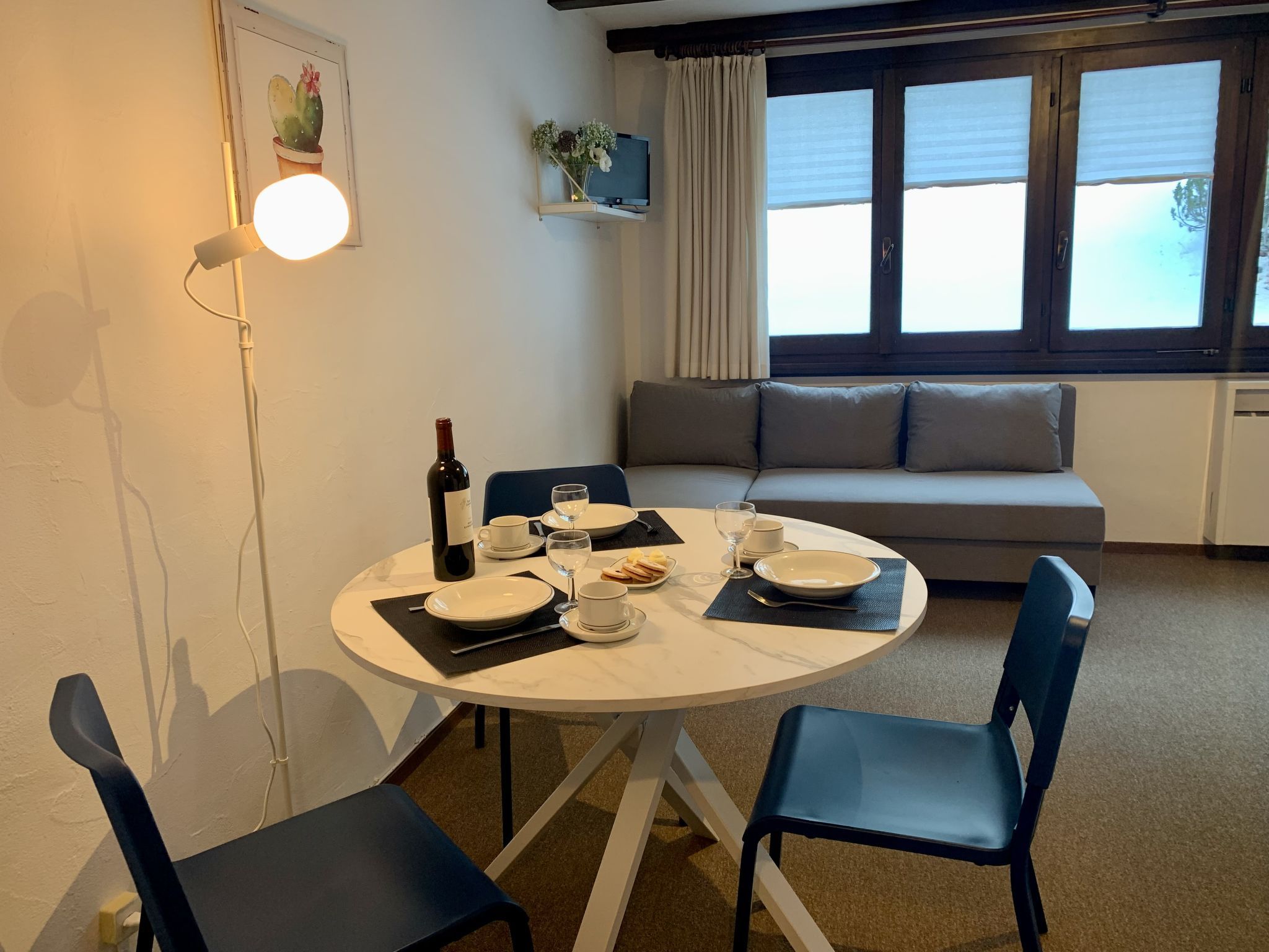 Apt. 33-1, 1-Zimmer-Wohnung 32 m2, im Erdgeschoss, Nordlage. Objekt geeignet für 2 Erwachsene + 1 Kind. Komfortabel und gemütlich eingerichtet: Wohn-/Esszimmer mit 1 Diwanbett (140 cm, Länge 190 cm), 1 Doppelwandschrankbett (160 cm, Länge 190 cm), Digital-TV und Flachbildschirm. (4 Kochplatten, Backofen, Geschirrspüler, Tiefkühler, elektrische Kaffeemaschine) mit 1 Diwanbett (130 cm, Länge 190 cm). Dusche/WC. Heizung. Teppichboden. Zur Verfügung: Internet (WLAN, gratis). Garage (1 Auto), Höhe 203 cm, Breite 350 cm. Bitte beachten: Wohnung auf Hofseite. Maximal 1 Haustier/Hund erlaubt.